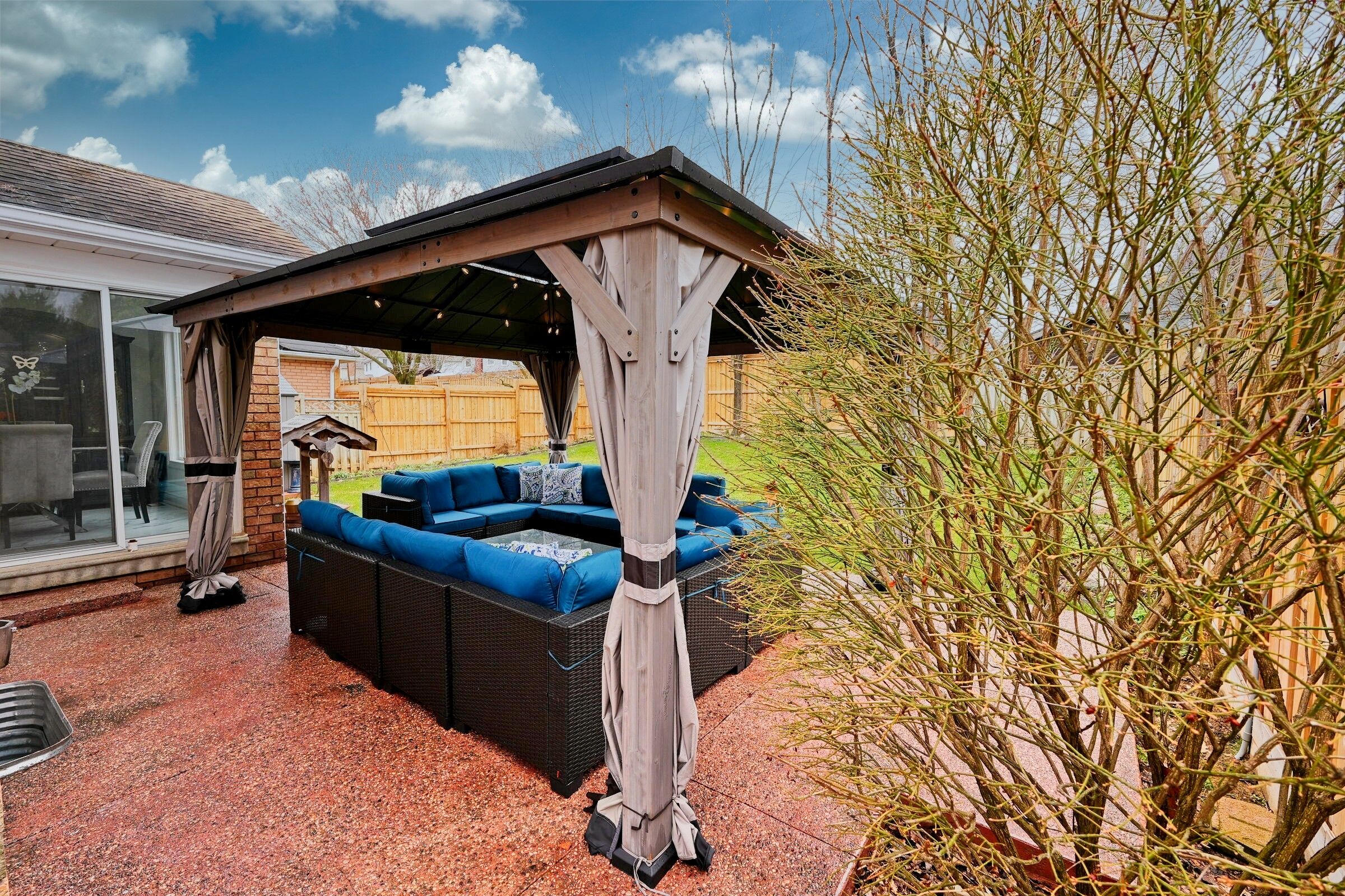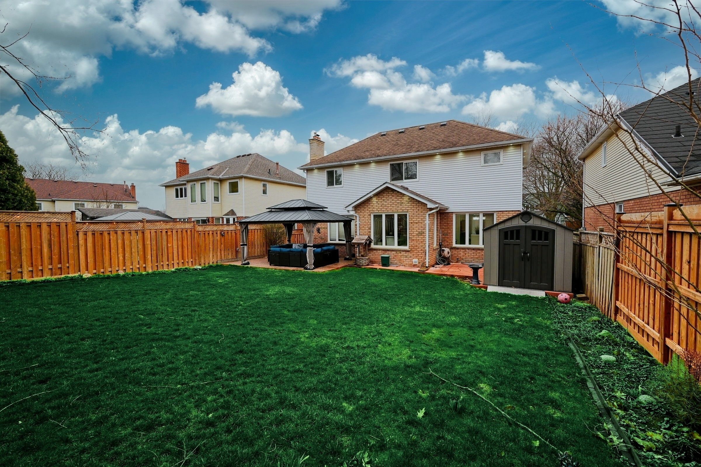 • Fully fenced backyard features gazebo and privacy fence.