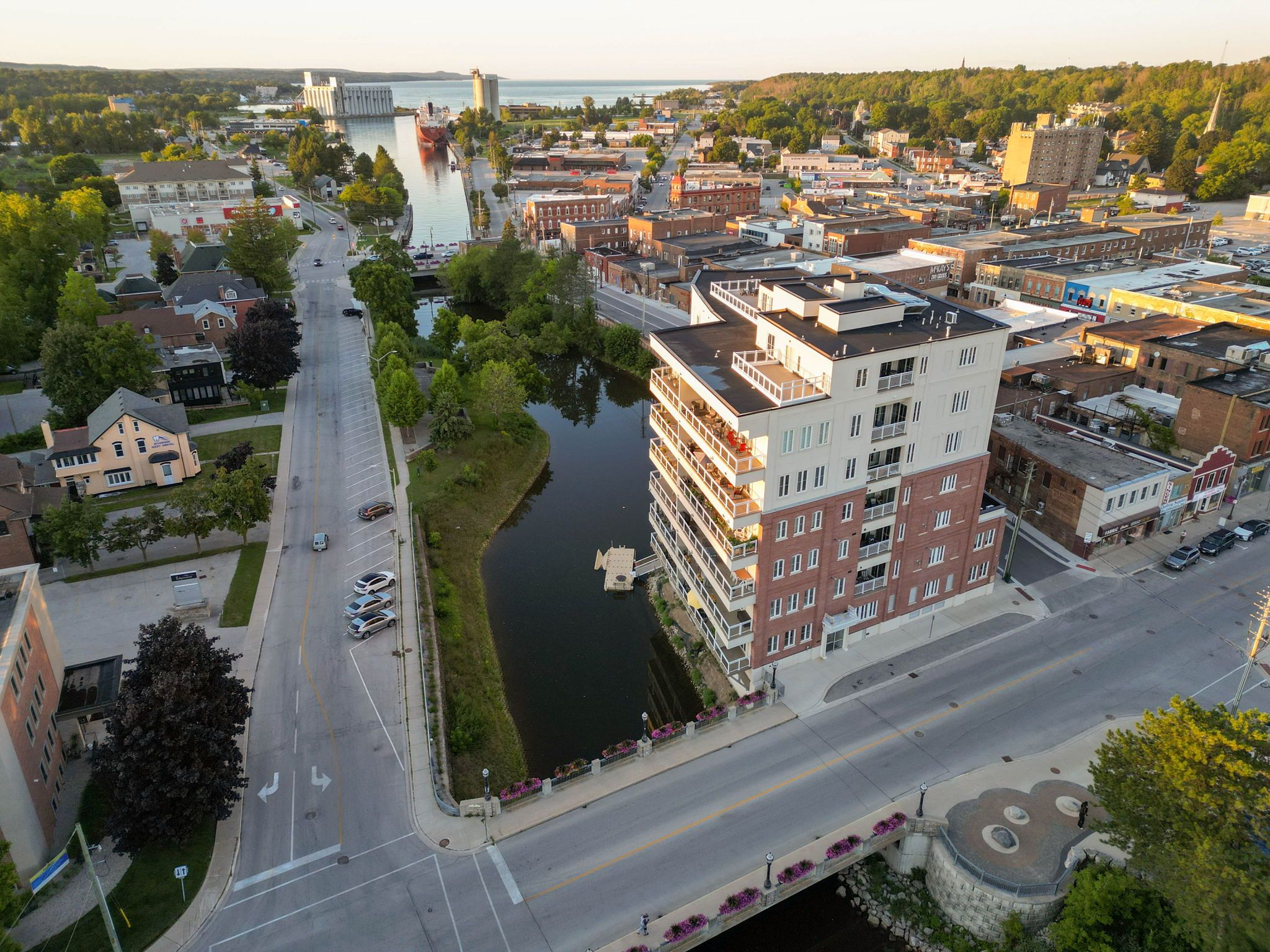 An impressive second-floor condominium in the centre of owen sound, this residence balances elegance with every day comfort. A private elevator opens directly into the unit, creating an immediate sense of privacy and presence. The open living, dining, and kitchen space features hardwood flooring, a calm, modern colour palette, crown moulding and crisp, white trim. The kitchen includes built-in appliances and granite countertops, while the living area is anchored by a gas fireplace with floor-to-ceiling built-ins and opens onto a spacious balcony overlooking the sydenham river. The primary bedroom offers direct balcony access, a walk-in closet with custom organizer, and a private four-piece ensuite. Positioned at the other end of the unit, the second bedroom includes its own walk-in closet and convenient access to a full bath, ideal for guests or family. The main balcony runs the full width of the home, providing ample space for dining and relaxing while enjoying unobstructed river views. A second, more intimate balcony off the dining area adds another outdoor option. Building amenities include a kayak dock and storage, secure entry, and underground parking with a dedicated space equipped for ev charging, along with a large storage locker. Set within a sought-after building, this location supports a walkable lifestyle just steps to the theatre, library, and downtown shops and restaurants. A refined riverfront home in an urban setting.