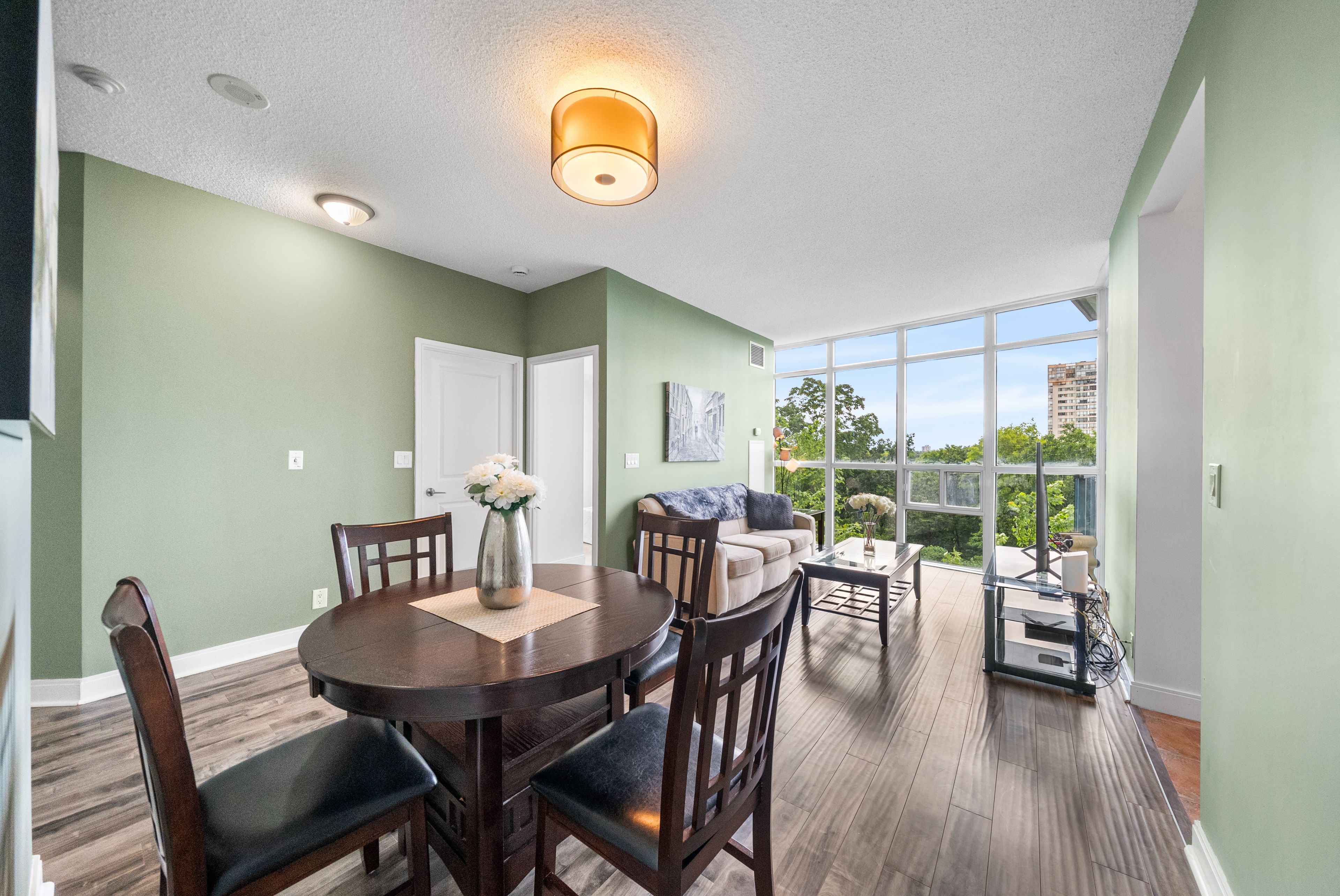 • Floor-to-ceiling windows provide natural light and serene green views.