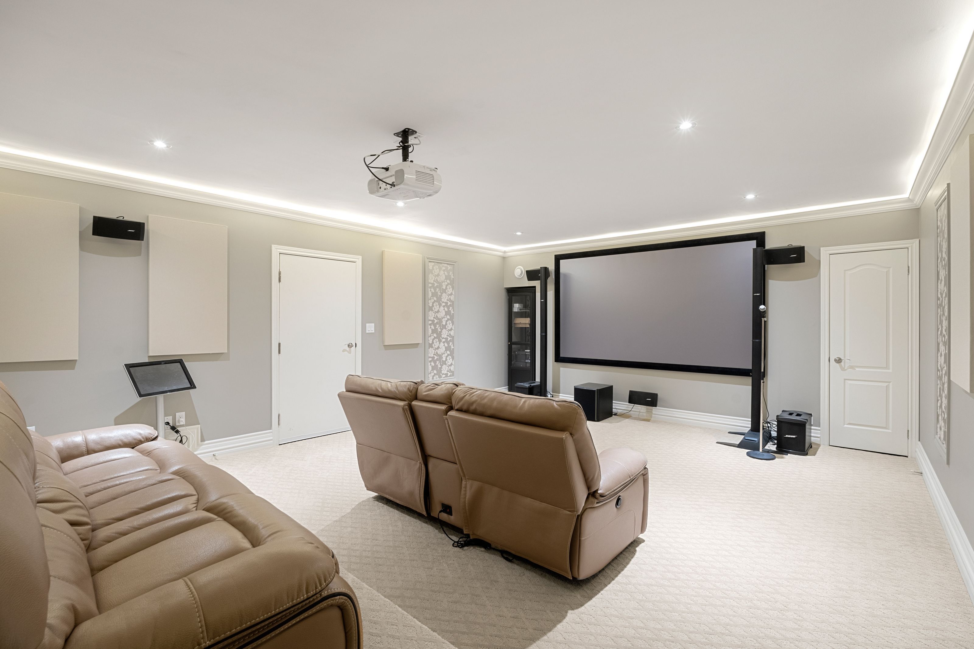 • Lower level includes a movie theatre room and recreational spaces.