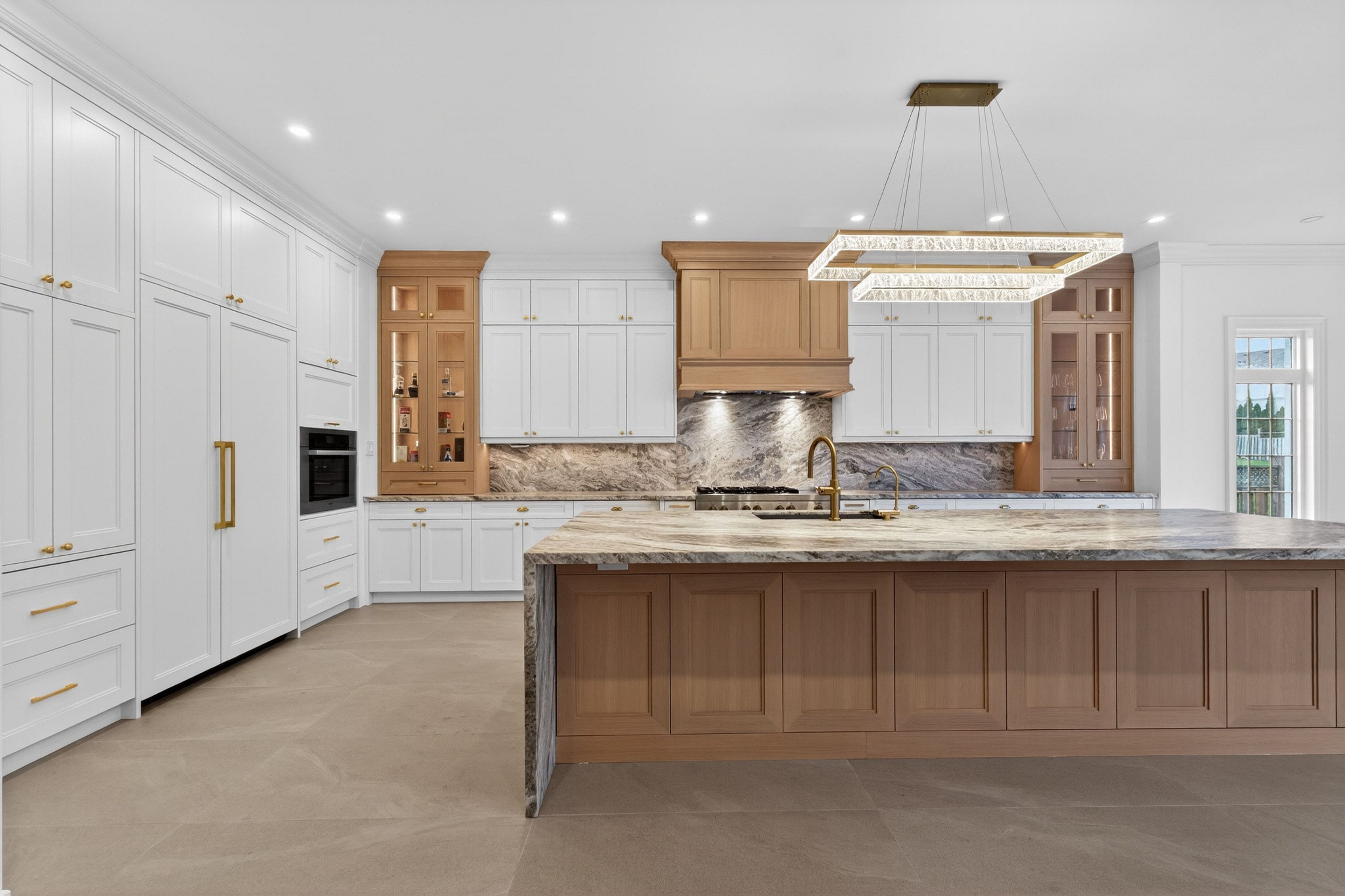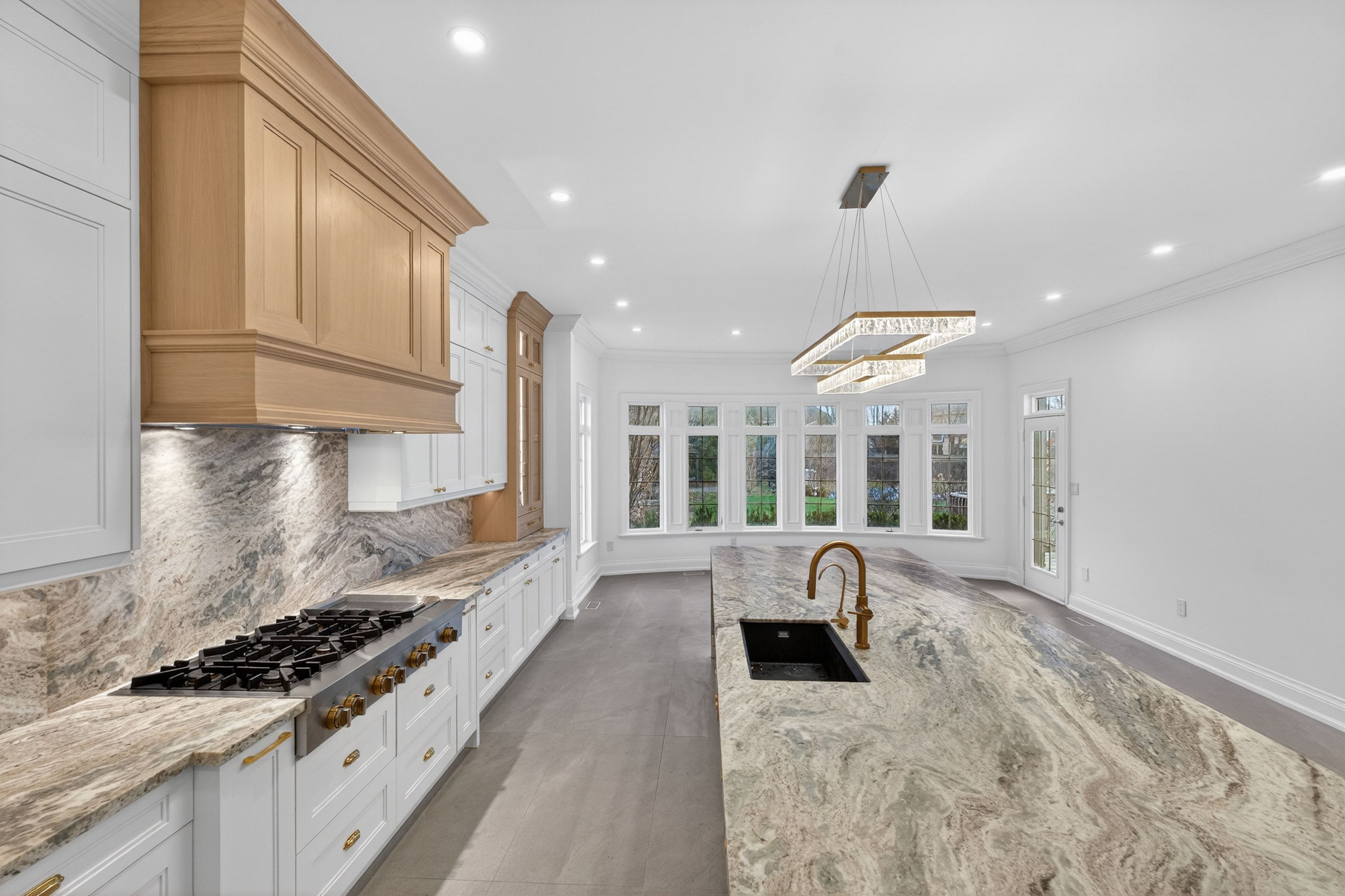 • New kitchen equipped with leathered granite countertops and stainless steel appliances.