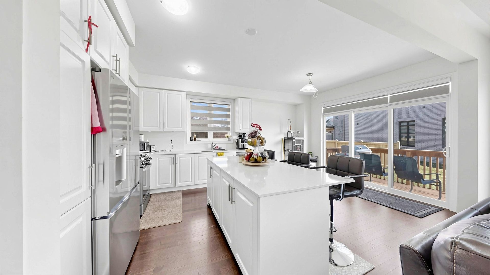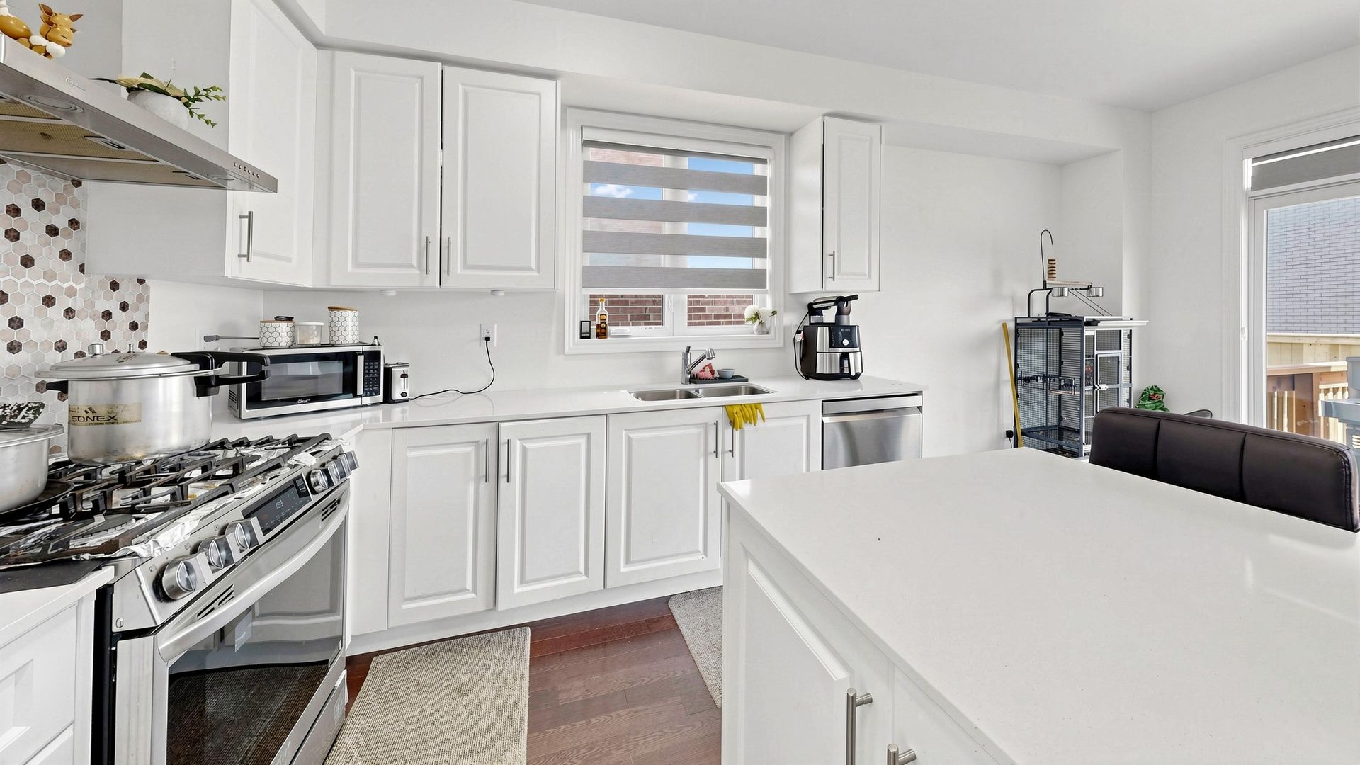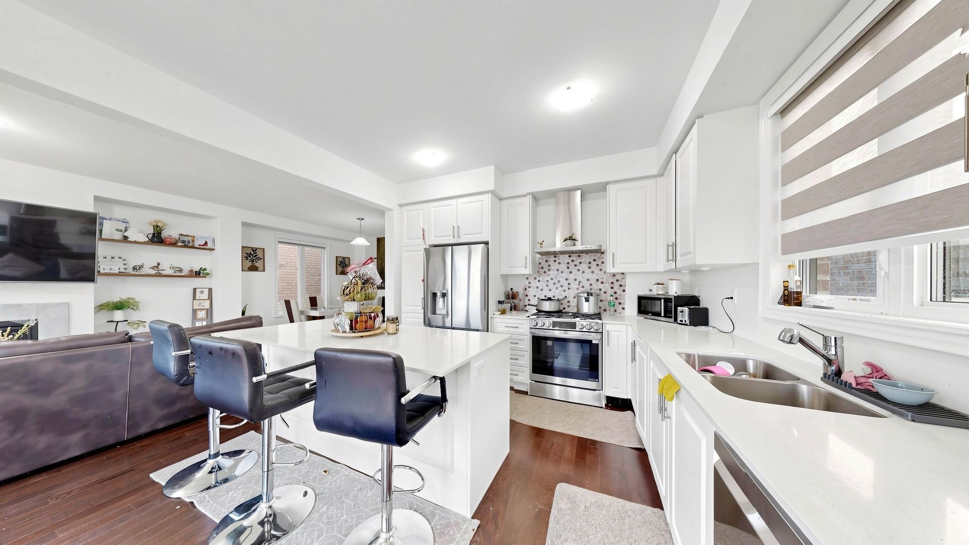 • Bright kitchen with stainless steel appliances and open concept layout.