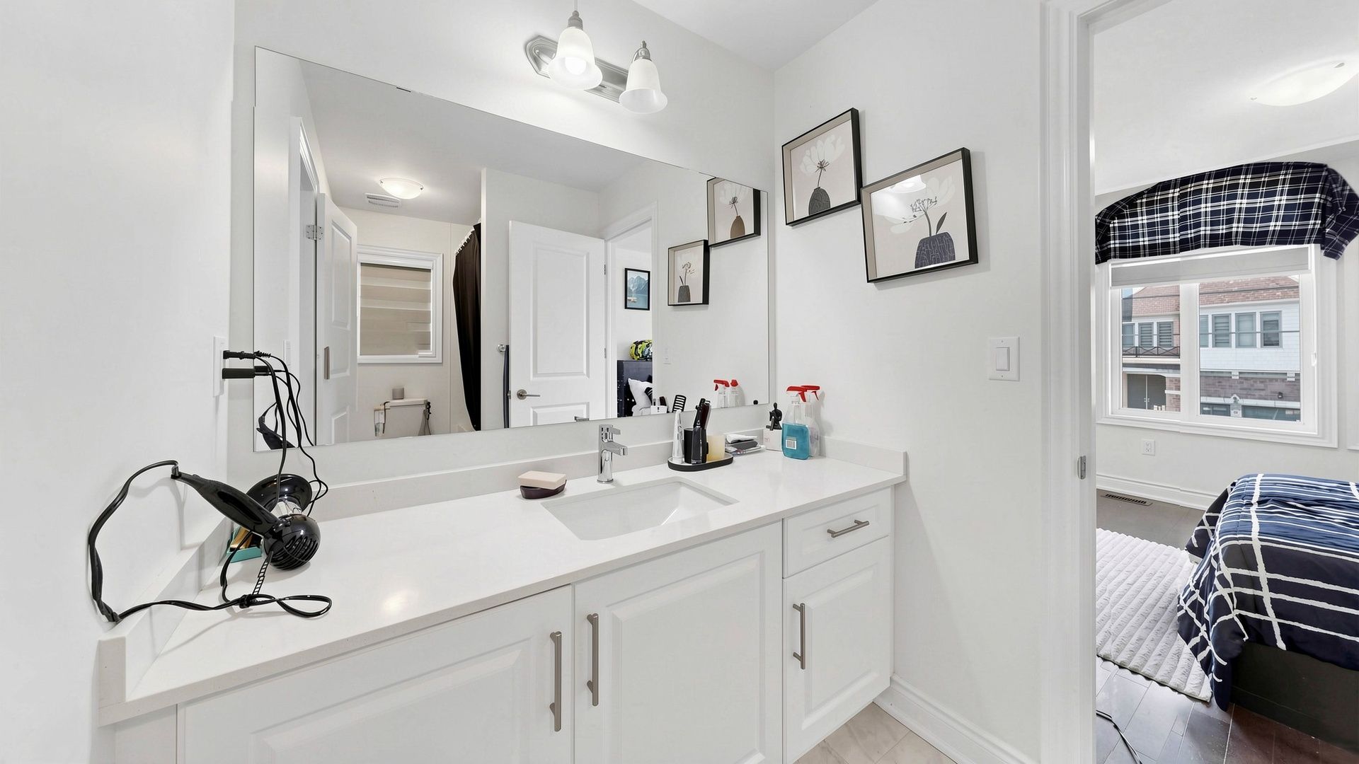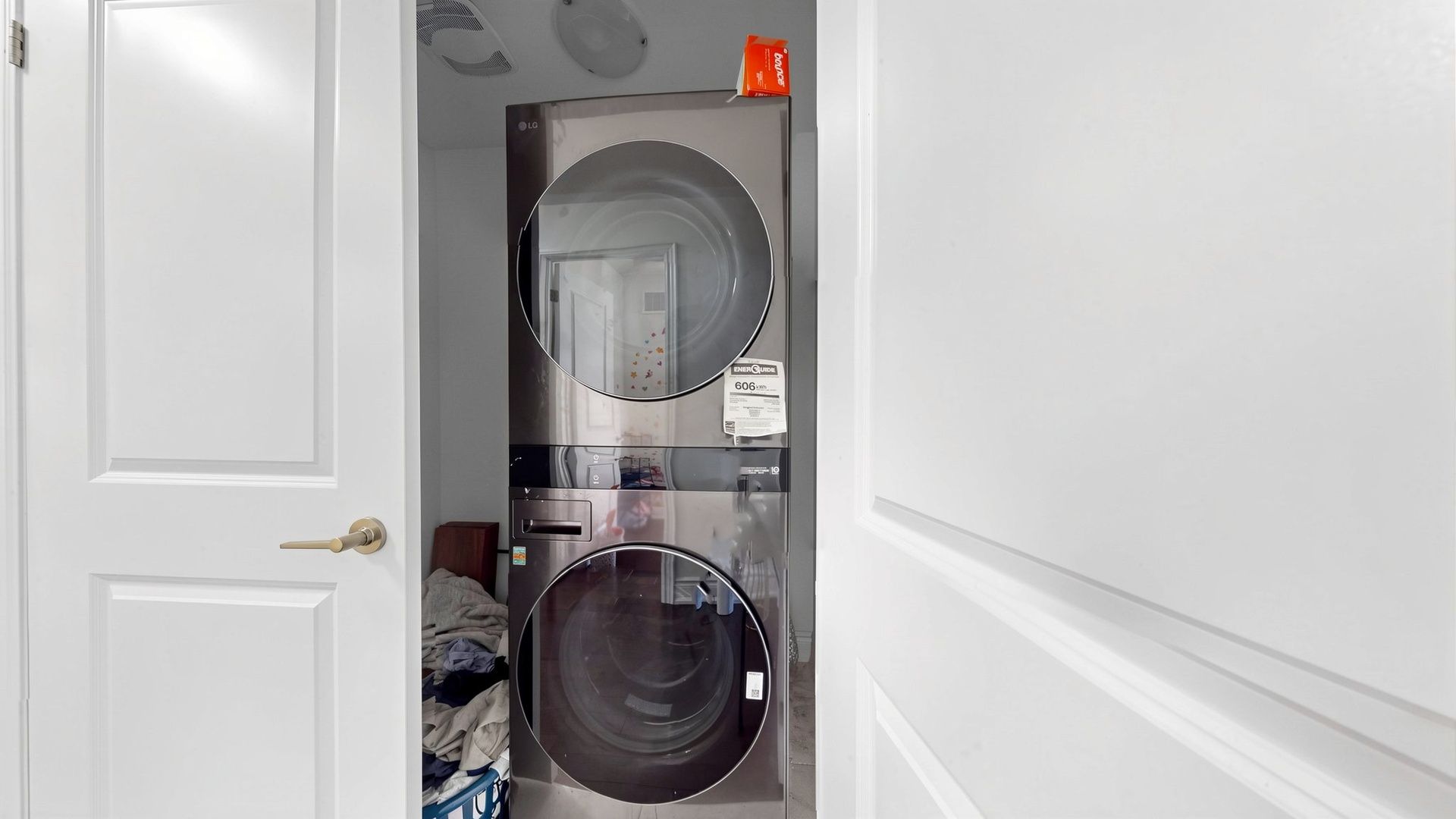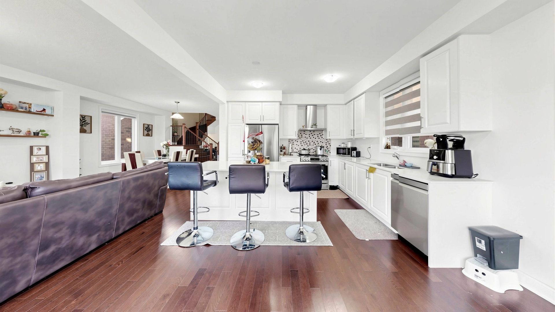 • Bright kitchen with stainless steel appliances and open concept layout.