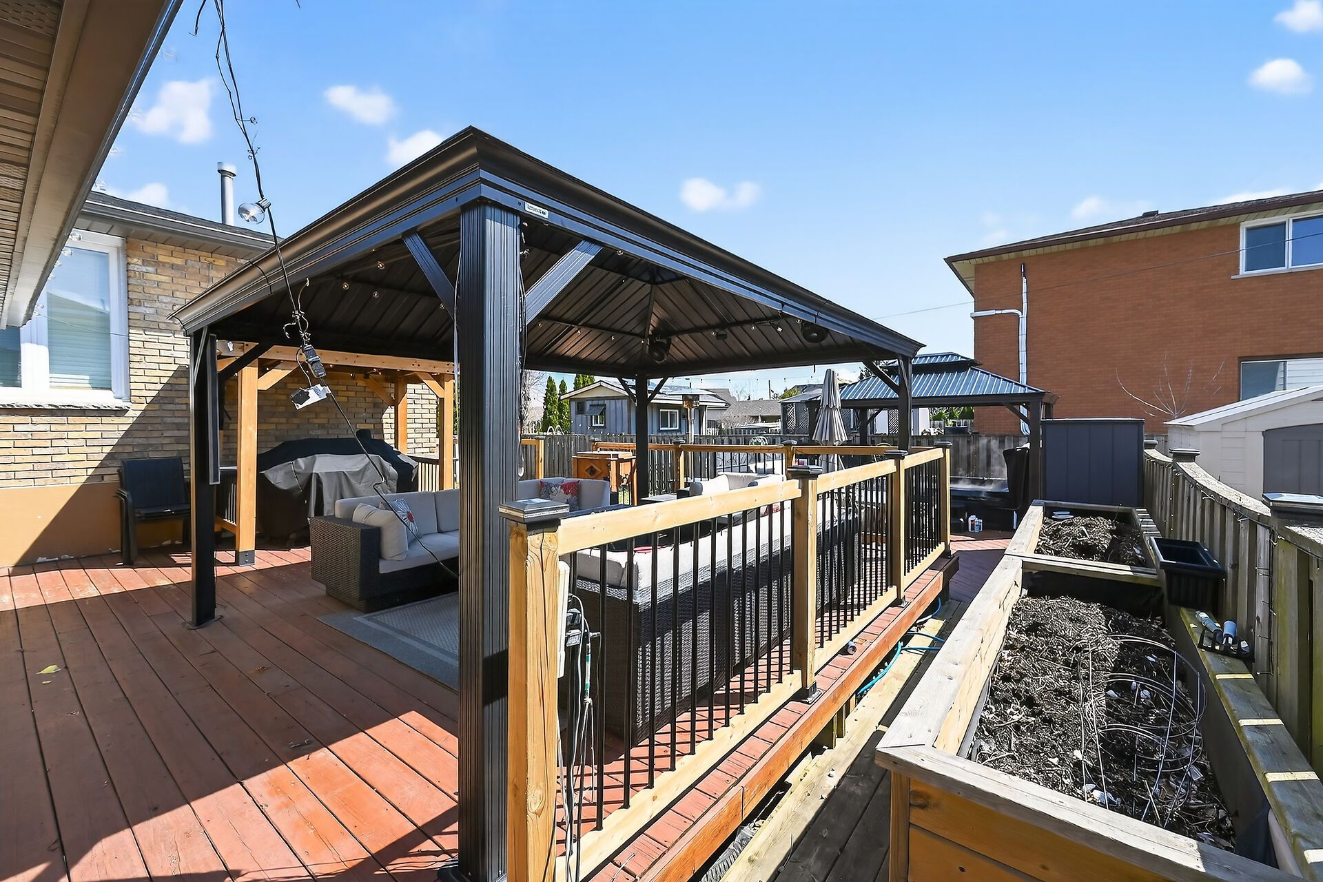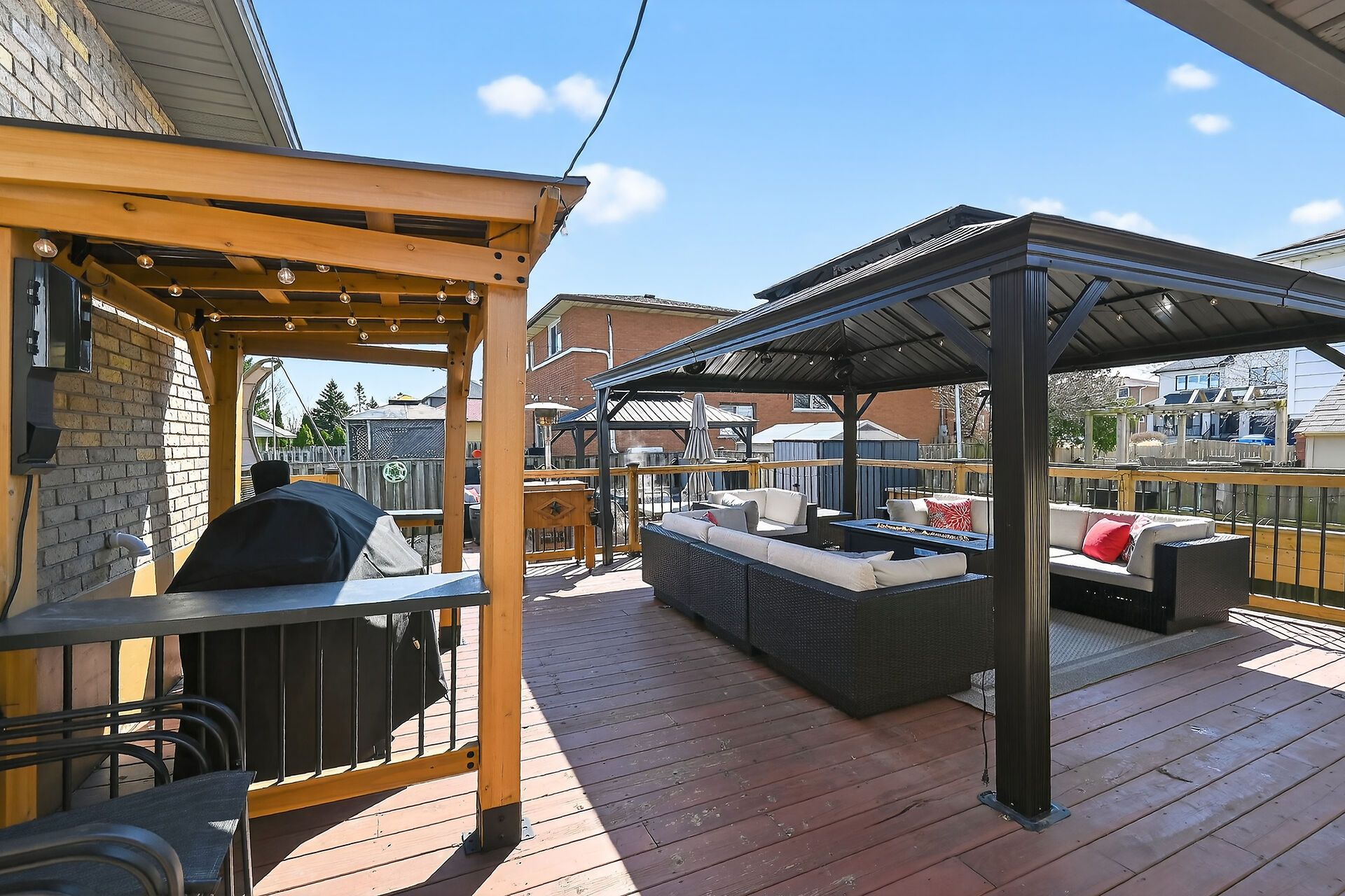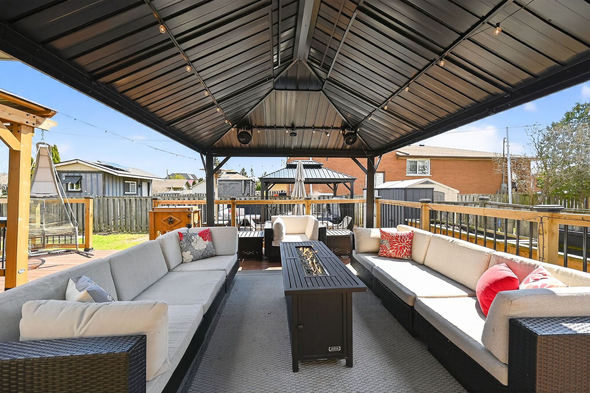 • Private backyard with three gazebos for outdoor living.