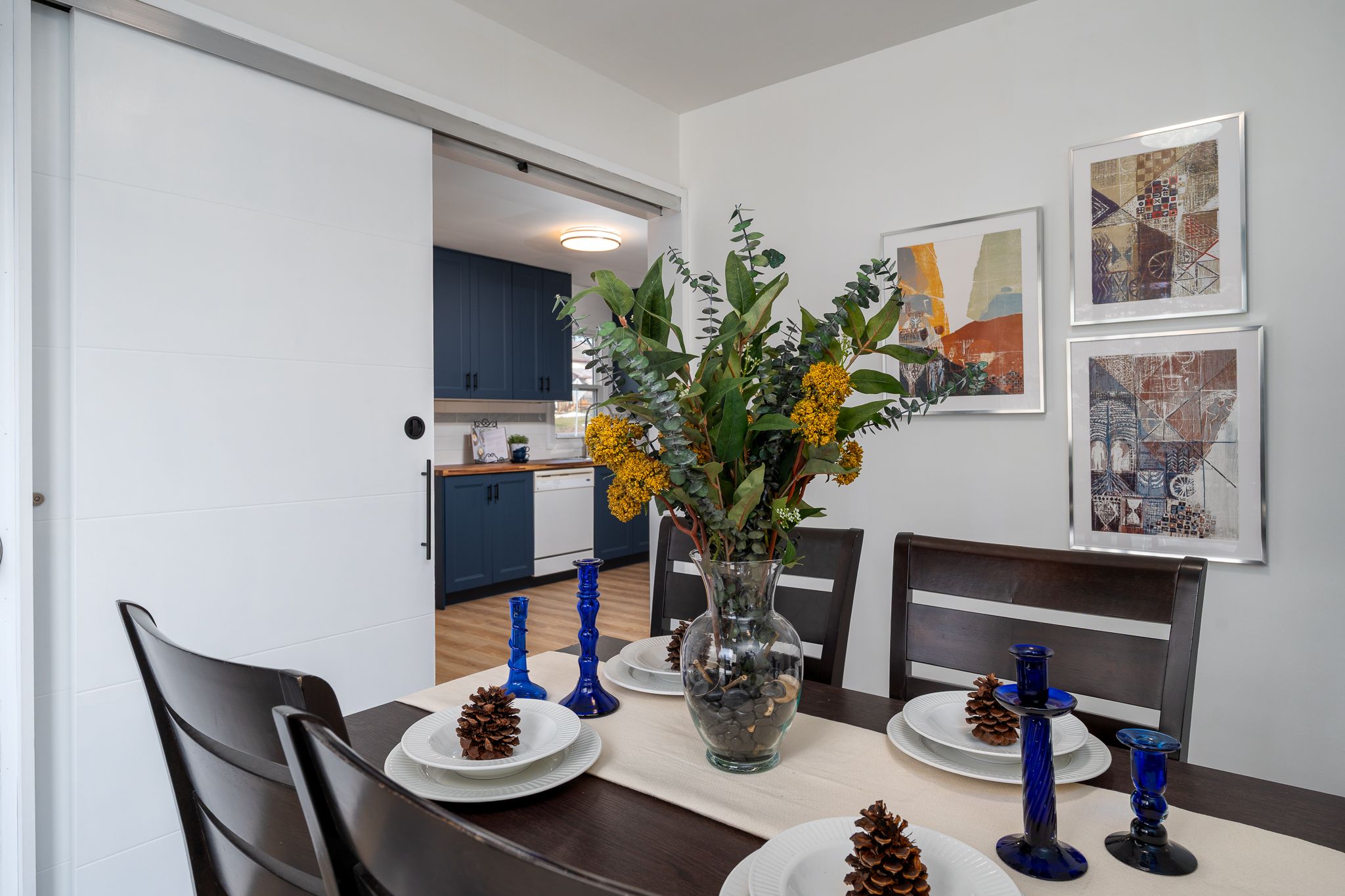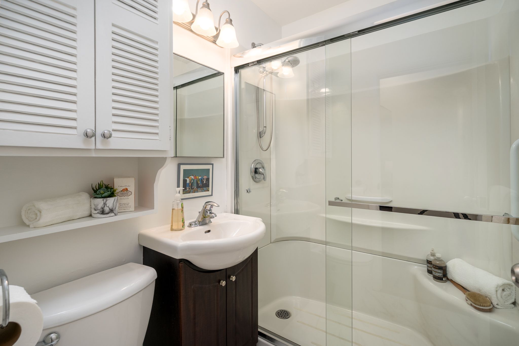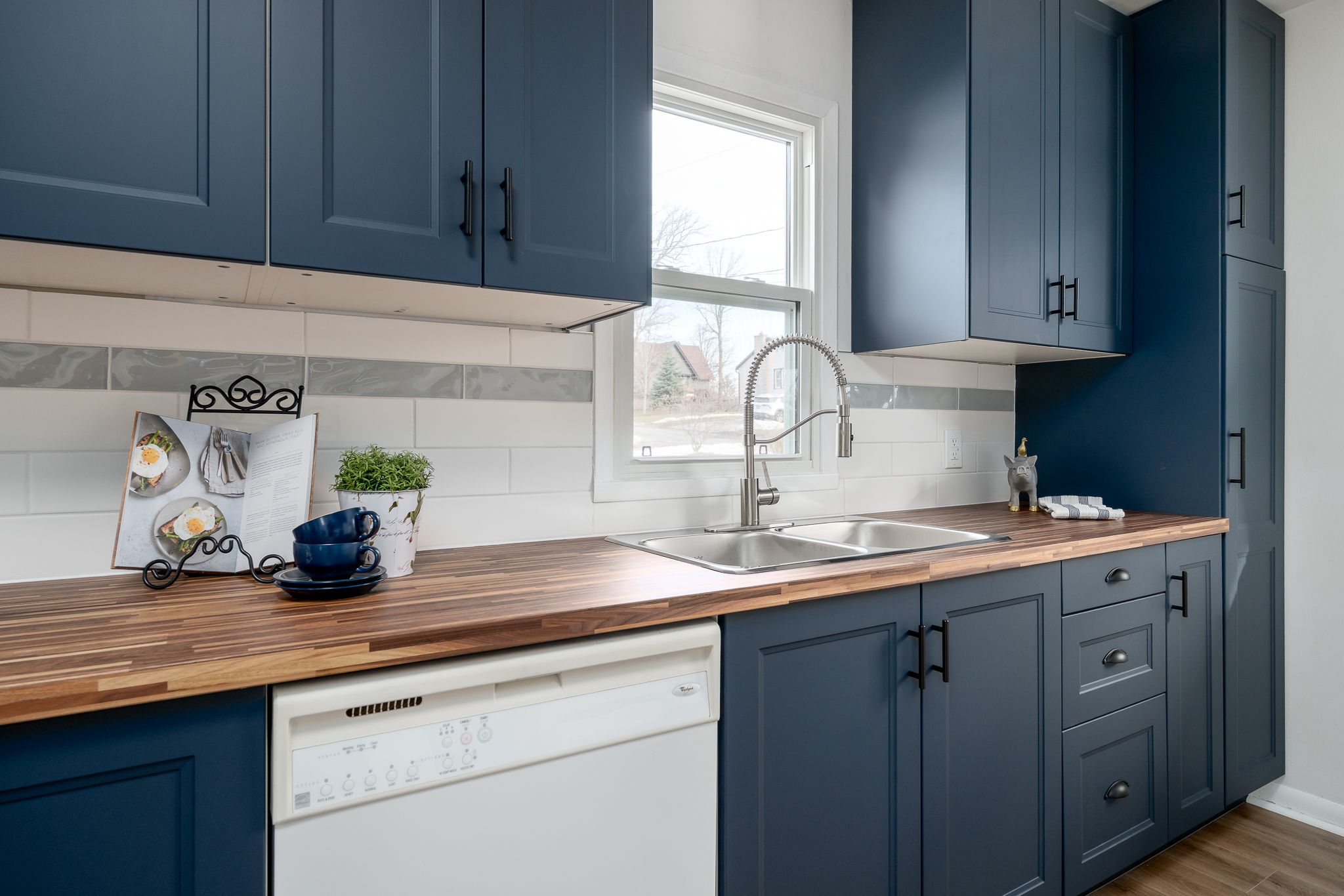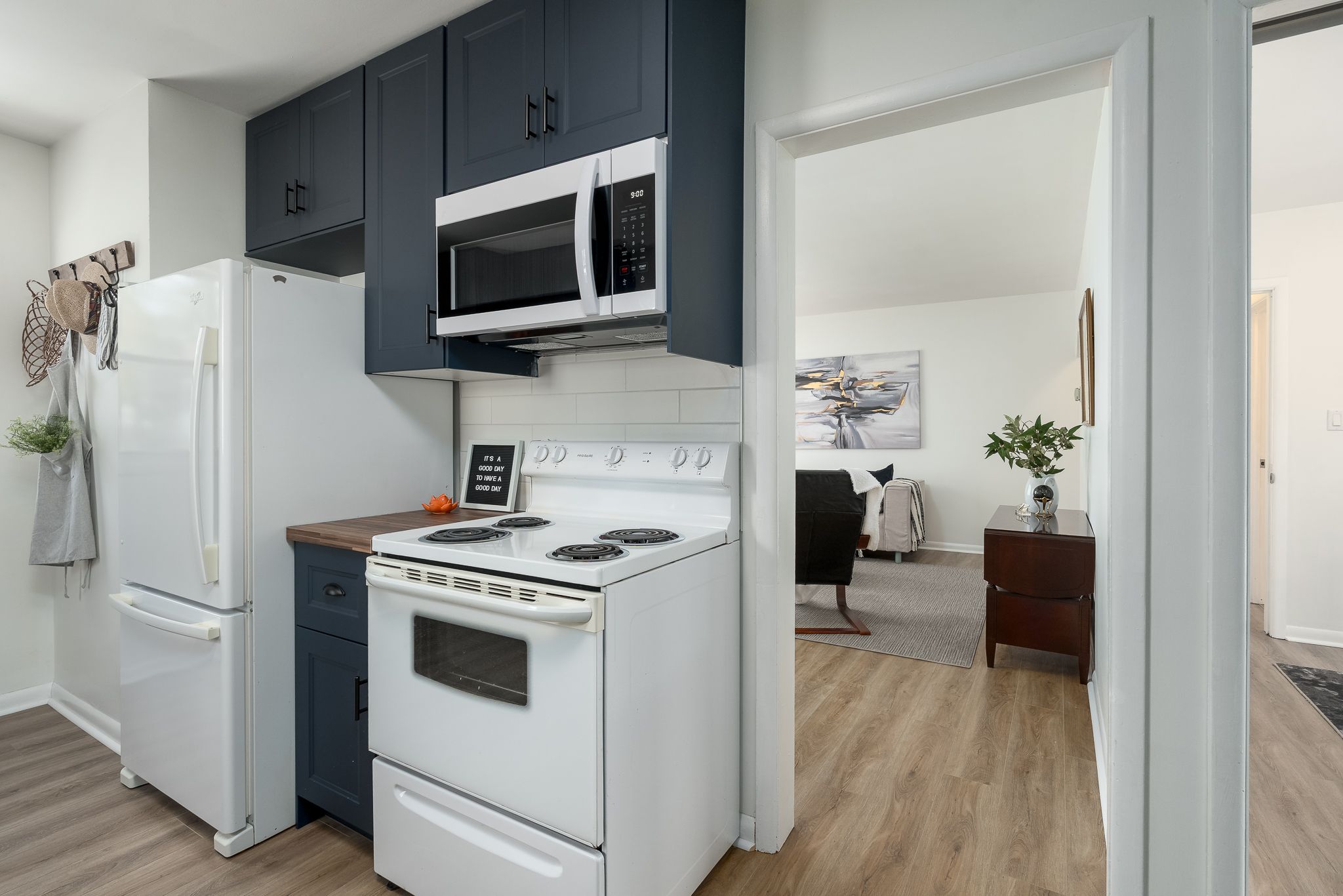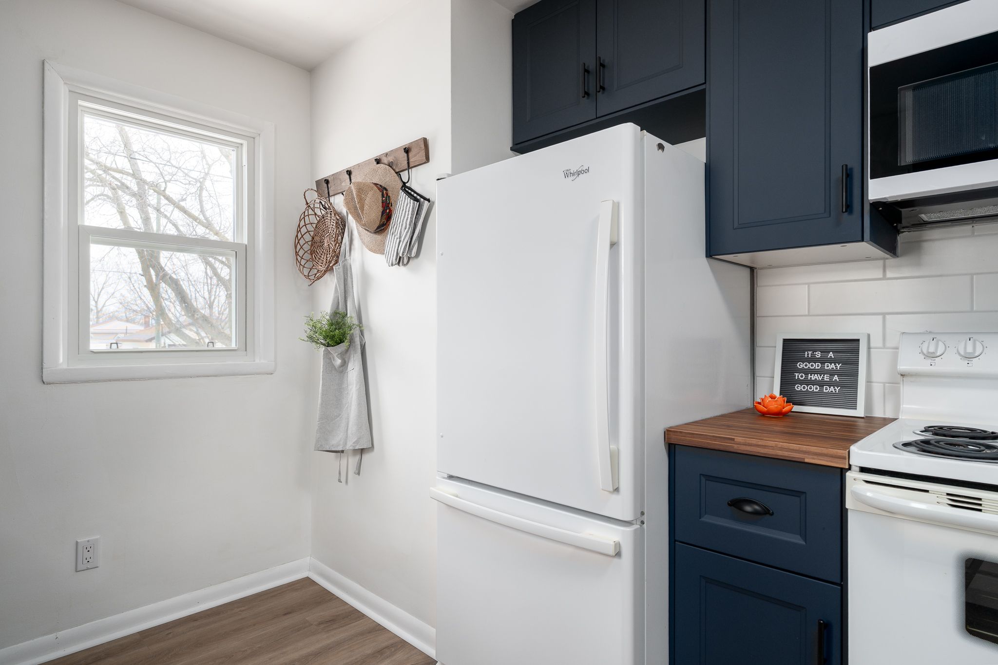 • Renovated kitchen with modern cabinetry, countertop, and appliances for convenience.