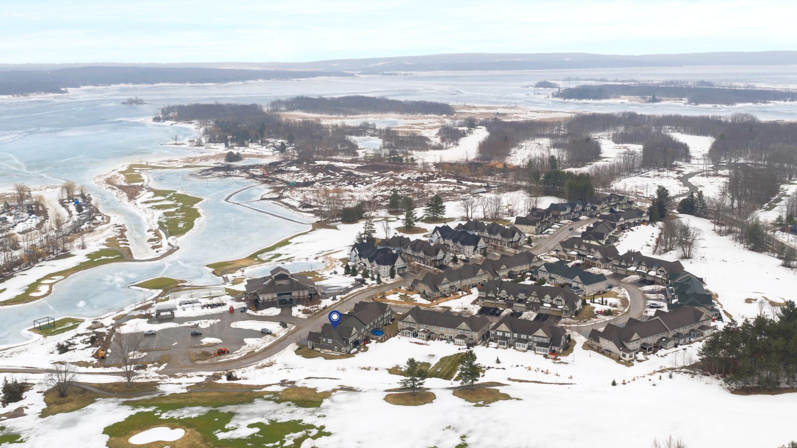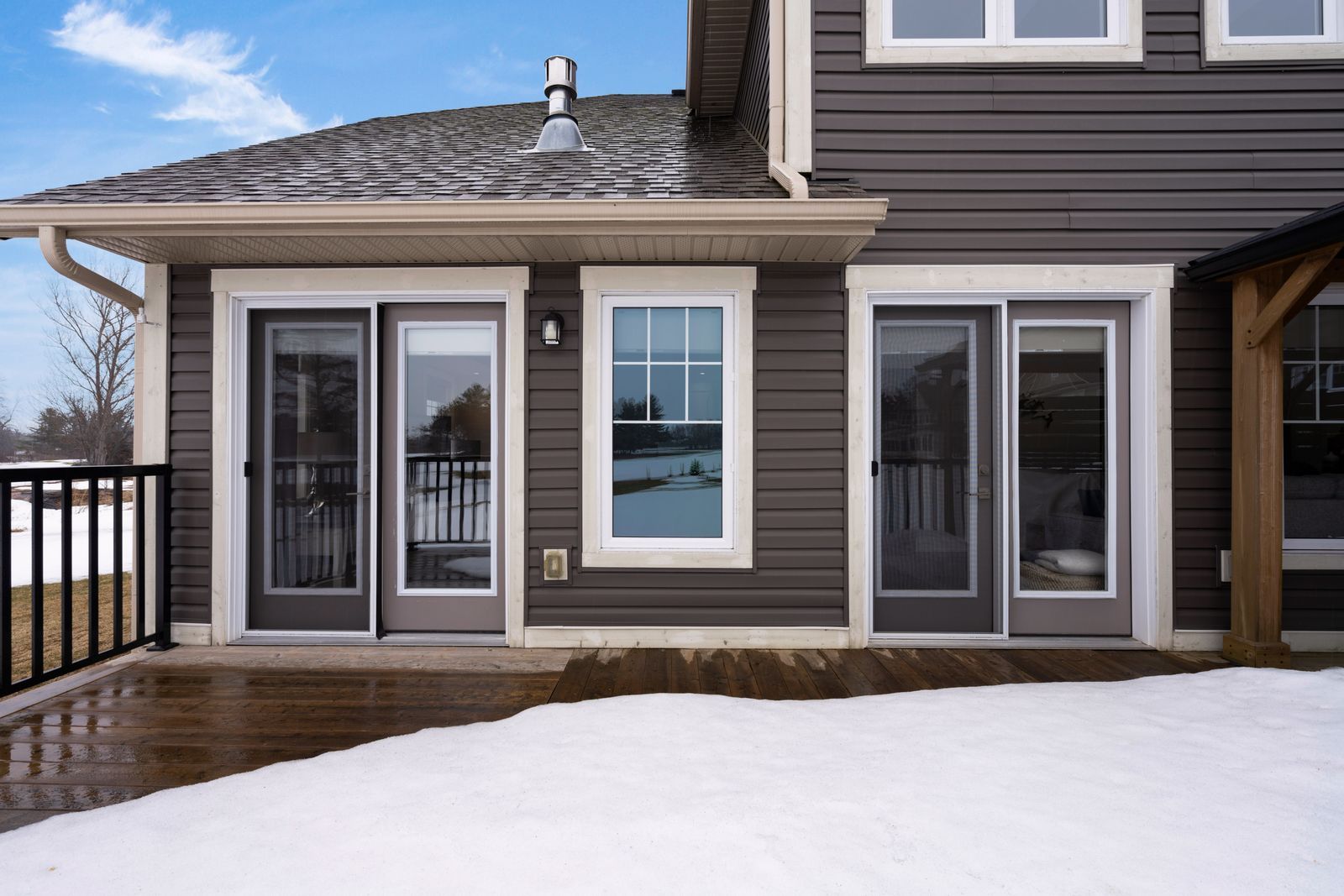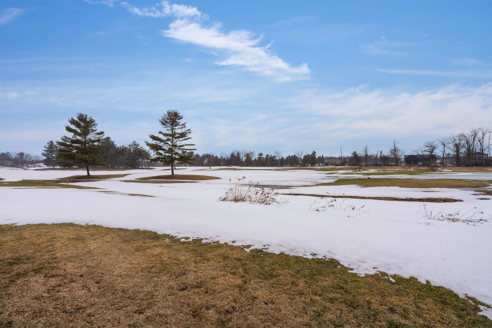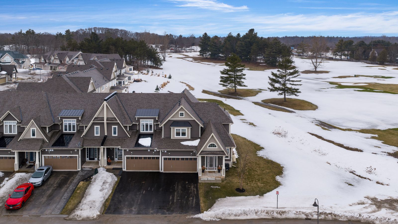Premium corner lot, fairway views, & a beautifully customized oak bay end unit! Unobstructed views of the 18th fairway and stunning georgian bay sunsets are just the beginning at this fully customized oak bay freehold end unit, set on a premium corner lot with no neighbours on one side. Built in 2020, this 2,100-plus-square-foot townhome begins with prominent front gables, a deep covered porch, a welcoming entry framed by sidelights, a built-in 2-car garage, and driveway parking for four more. Hardwood floors, custom hunter douglas blinds, pot lights, luxury lighting, and upgraded 6. 5-inch baseboards with built-in outlets carry throughout. Kitchenaid stainless steel appliances, a gas stove, pot filler, wine fridge, custom pantry, and well-chosen finishes give the kitchen a look that feels current and carefully considered. Soaring cathedral tray ceilings and a dramatic custom feature wall define the main living room, where a convection fireplace and two sets of double garden doors connect the space to the deck, private gazebo, golf course views, and georgian bay sunsets. The main floor primary bedroom features its own garden door walkout, custom walk-in closet, and a beautifully finished ensuite with an oversized shower, dual shower heads, dual sink vanity, and a private water closet. Ethernet connections in every room, a premium air filtration system, and a multi-zone hydro-rain sprinkler system round out a #hometostay that has been customized from top to bottom.