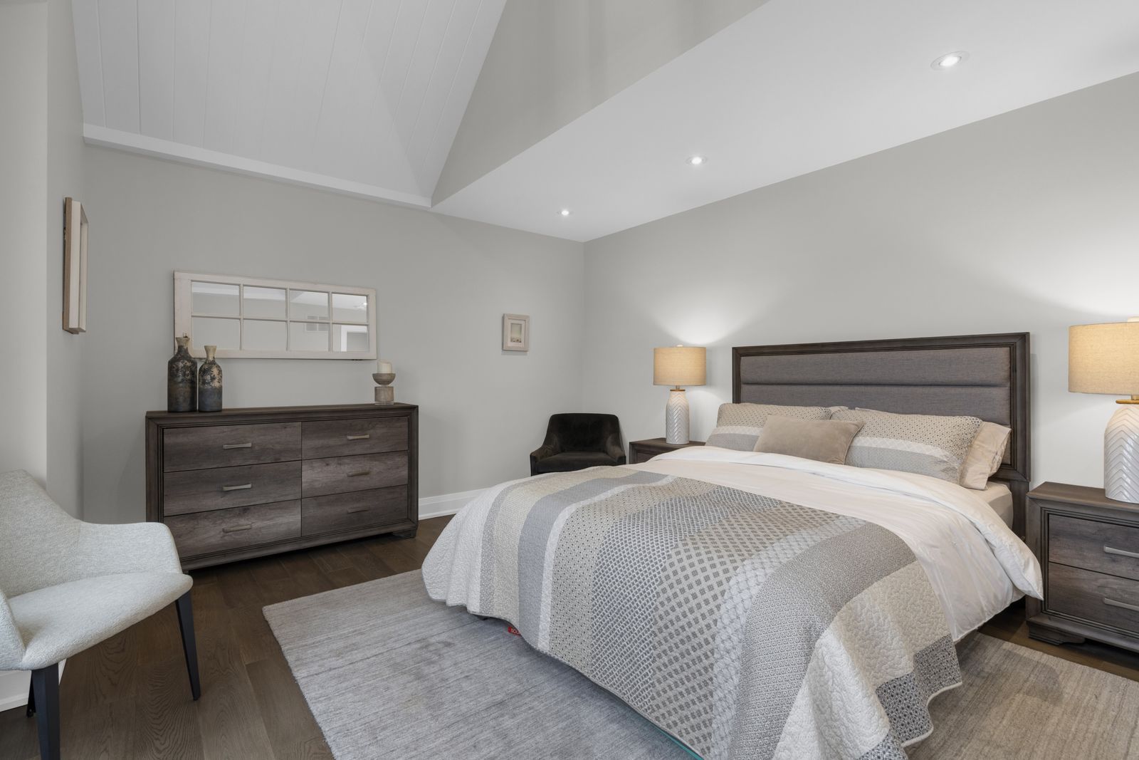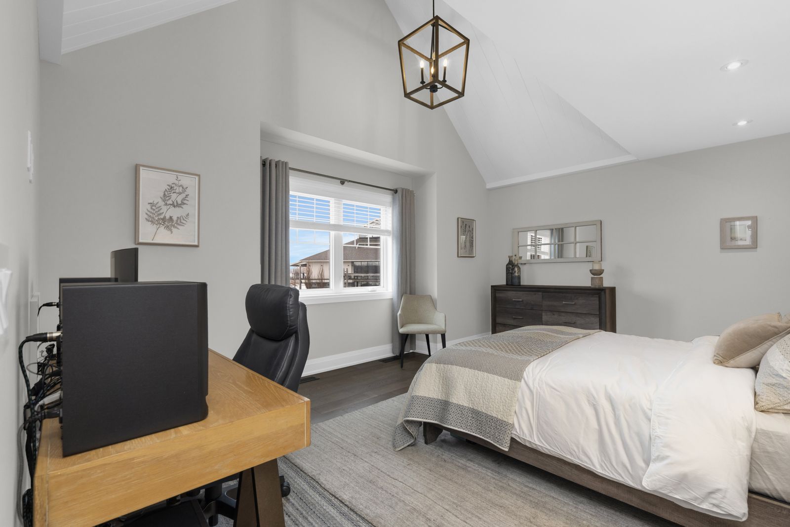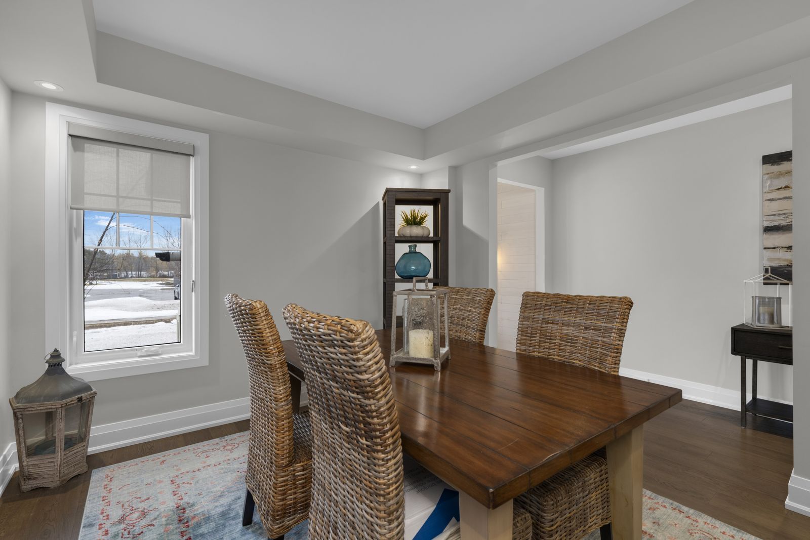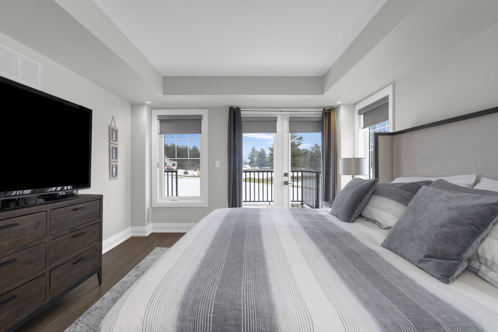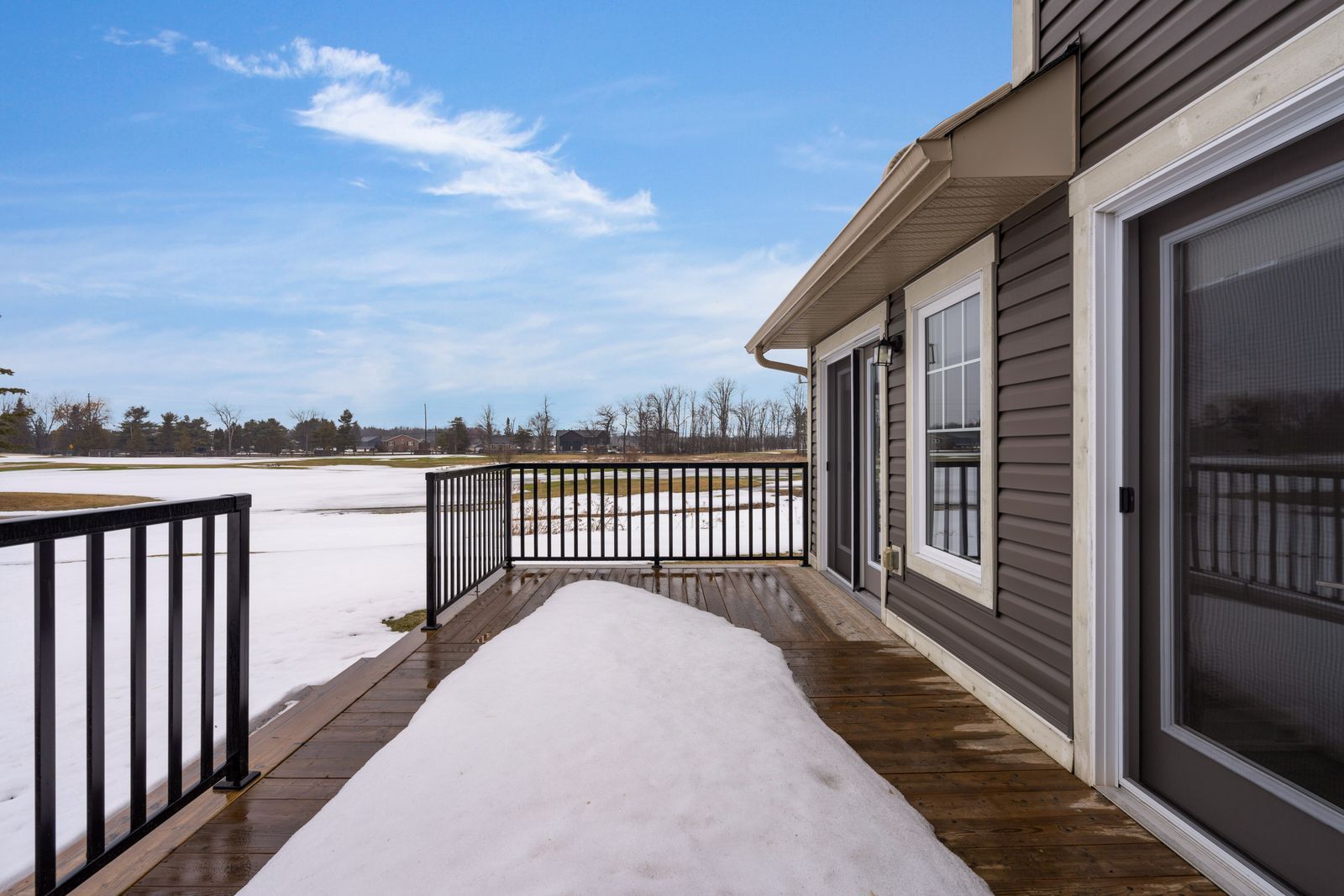 Premium corner lot, fairway views, & a beautifully customized oak bay end unit! Unobstructed views of the 18th fairway and stunning georgian bay sunsets are just the beginning at this fully customized oak bay freehold end unit, set on a premium corner lot with no neighbours on one side. Built in 2020, this 2,100-plus-square-foot townhome begins with prominent front gables, a deep covered porch, a welcoming entry framed by sidelights, a built-in 2-car garage, and driveway parking for four more. Hardwood floors, custom hunter douglas blinds, pot lights, luxury lighting, and upgraded 6. 5-inch baseboards with built-in outlets carry throughout. Kitchenaid stainless steel appliances, a gas stove, pot filler, wine fridge, custom pantry, and well-chosen finishes give the kitchen a look that feels current and carefully considered. Soaring cathedral tray ceilings and a dramatic custom feature wall define the main living room, where a convection fireplace and two sets of double garden doors connect the space to the deck, private gazebo, golf course views, and georgian bay sunsets. The main floor primary bedroom features its own garden door walkout, custom walk-in closet, and a beautifully finished ensuite with an oversized shower, dual shower heads, dual sink vanity, and a private water closet. Ethernet connections in every room, a premium air filtration system, and a multi-zone hydro-rain sprinkler system round out a #hometostay that has been customized from top to bottom.
