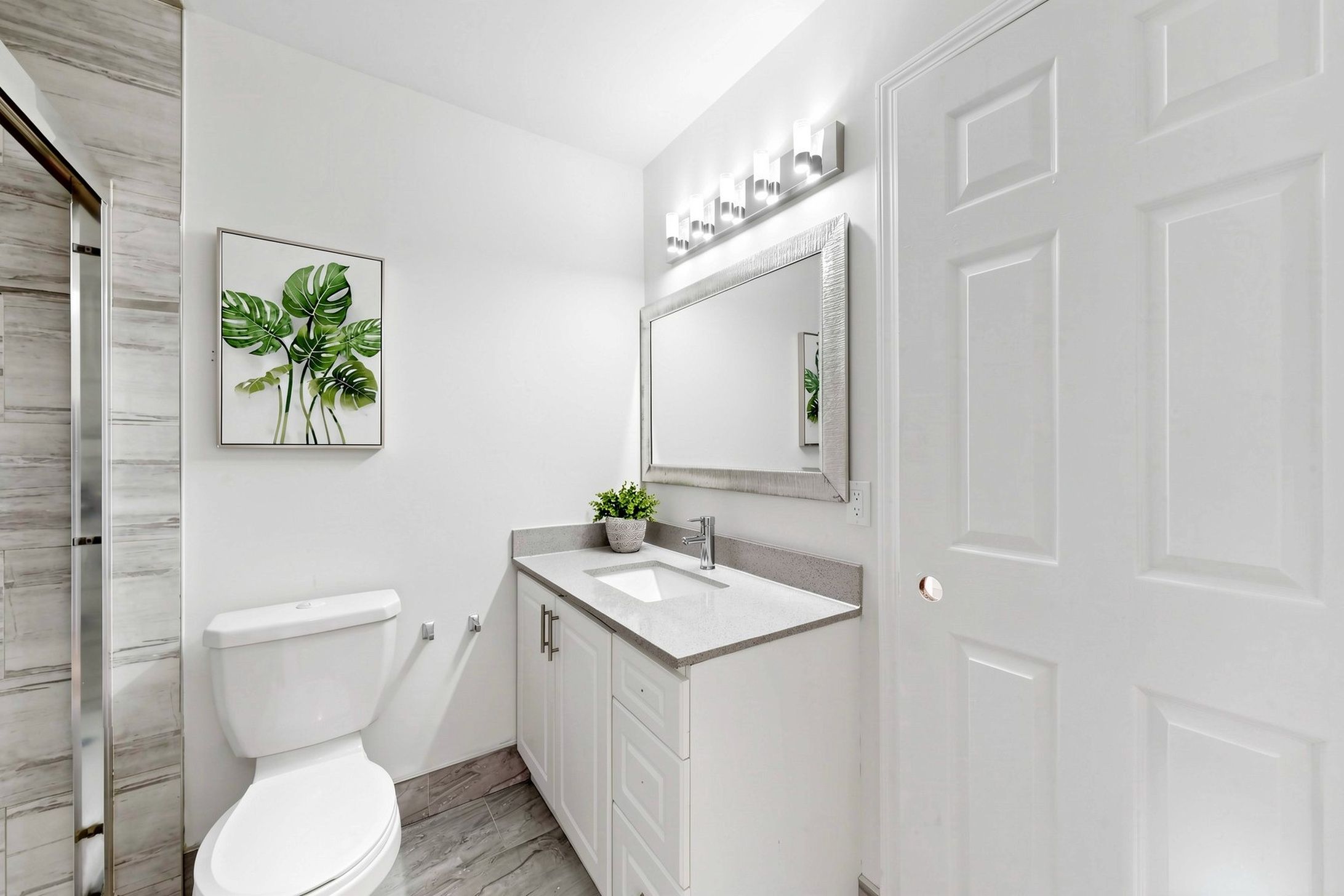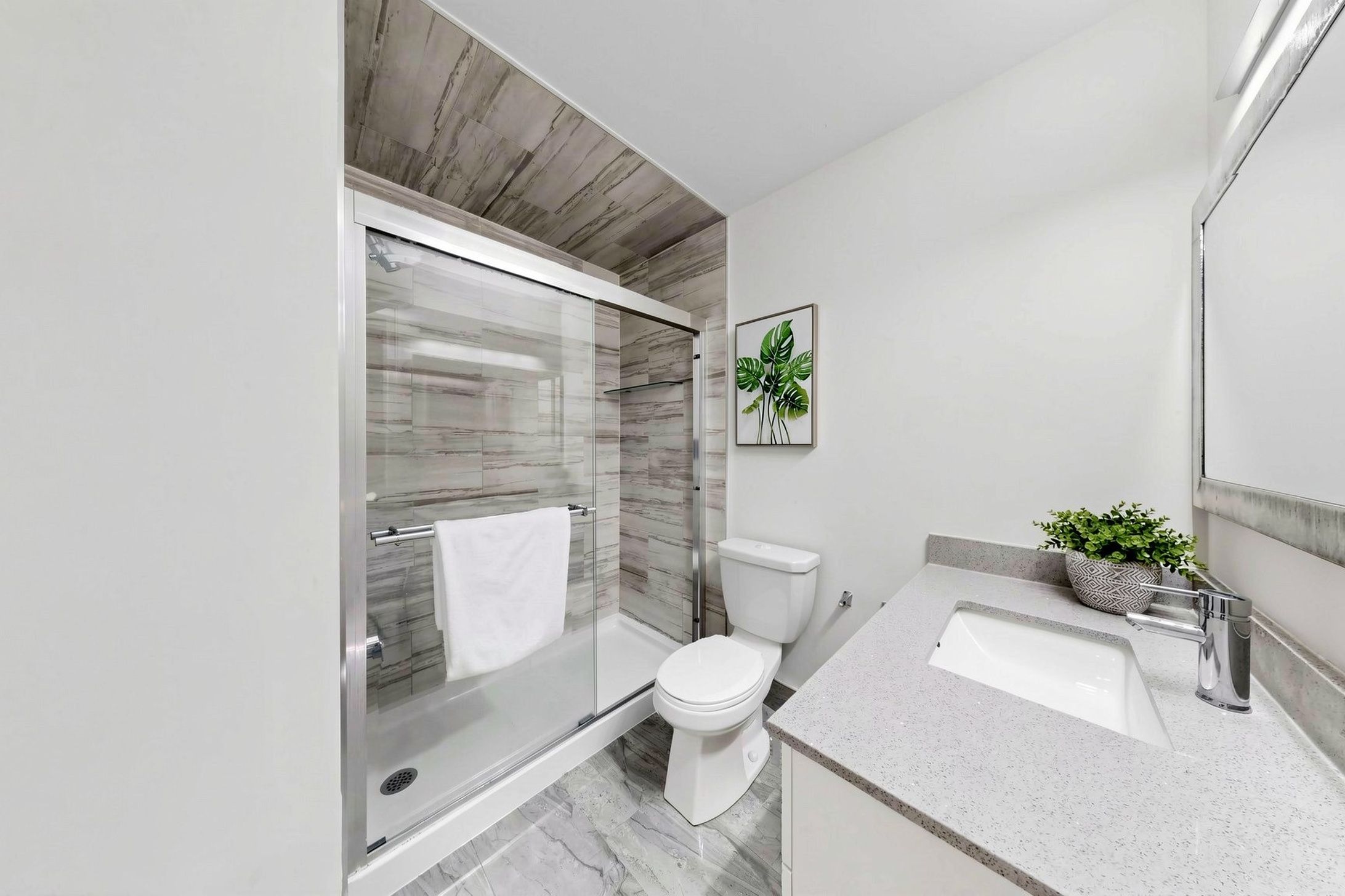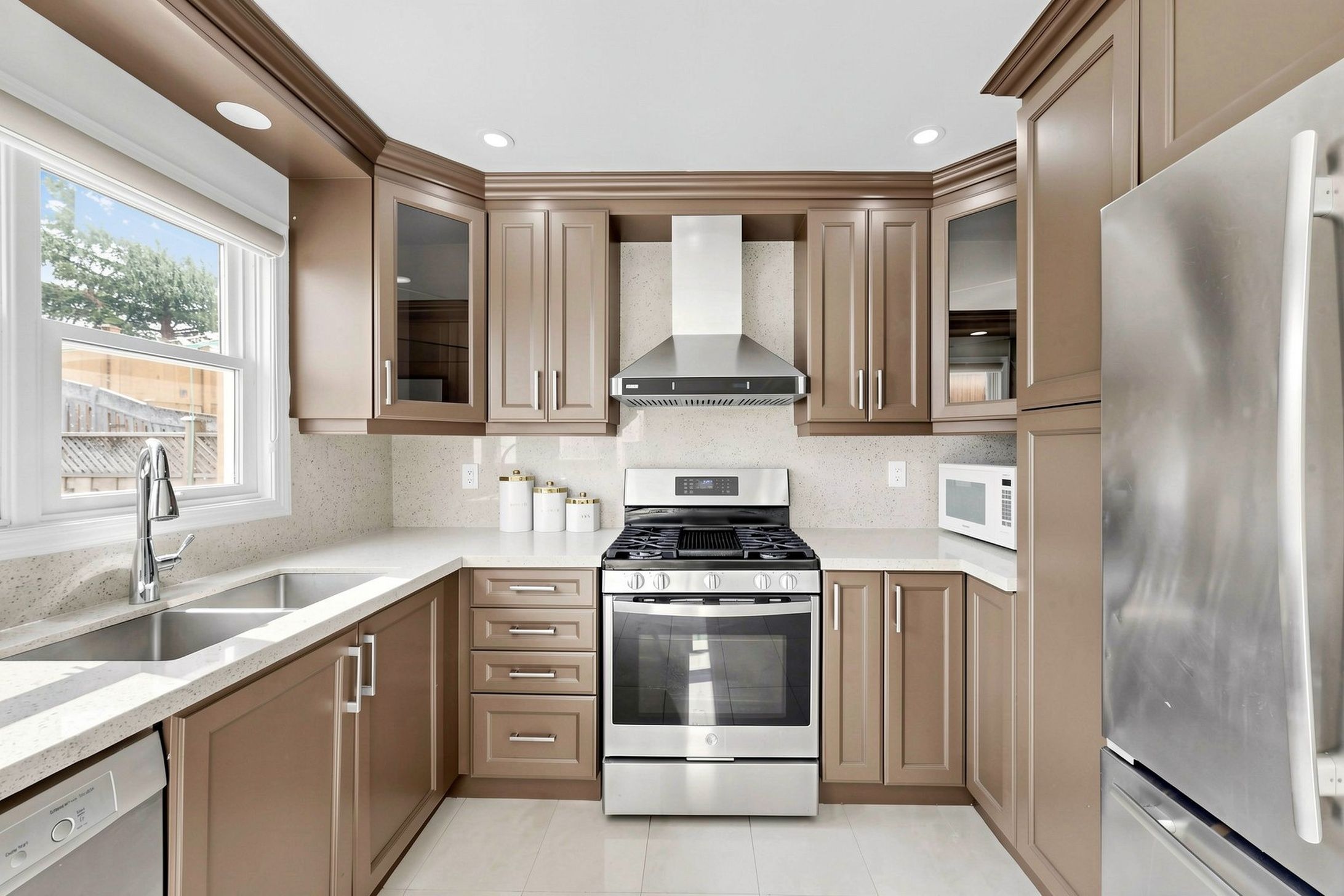 • Modern kitchen features quartz countertops and stainless steel appliances.