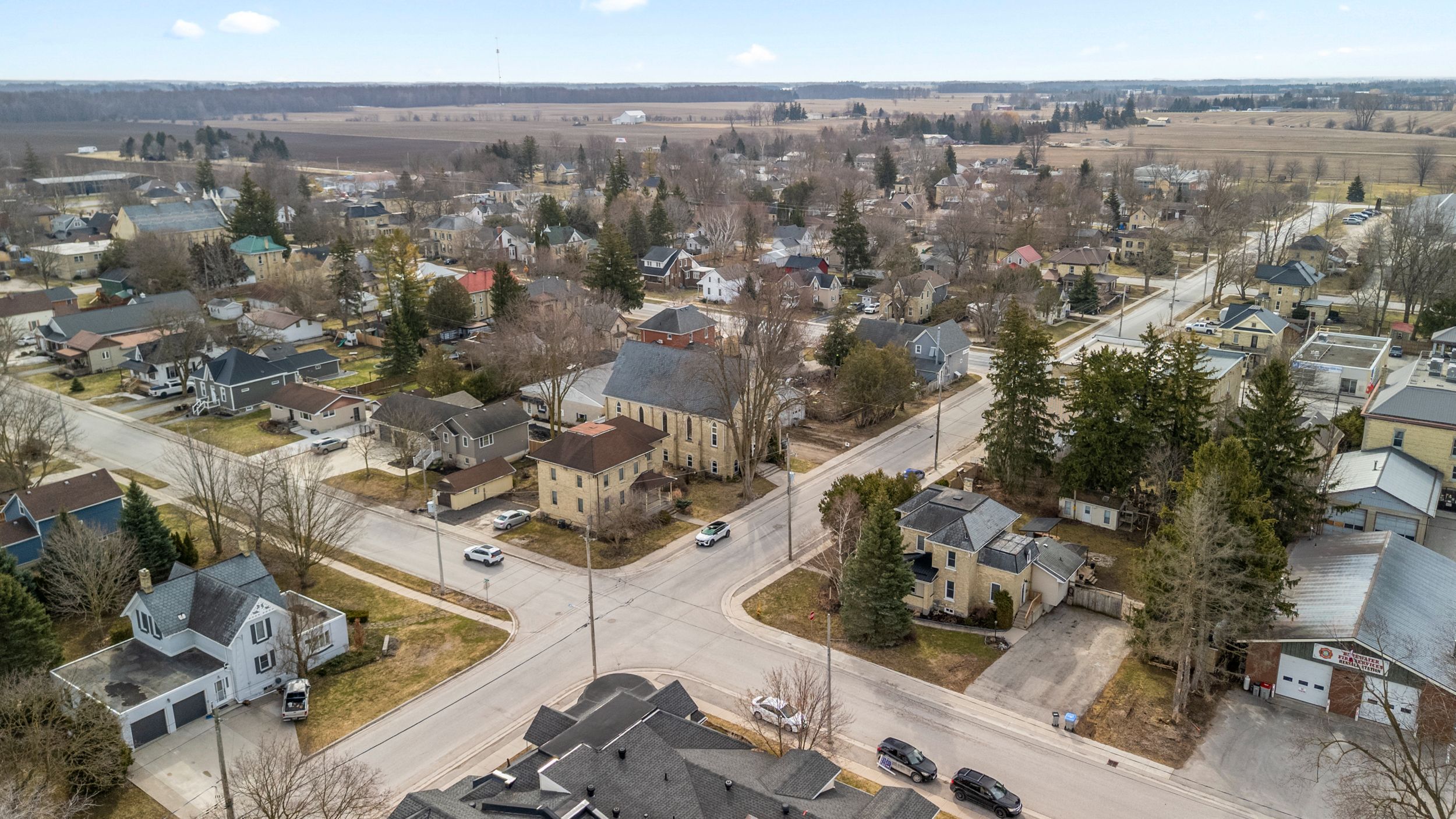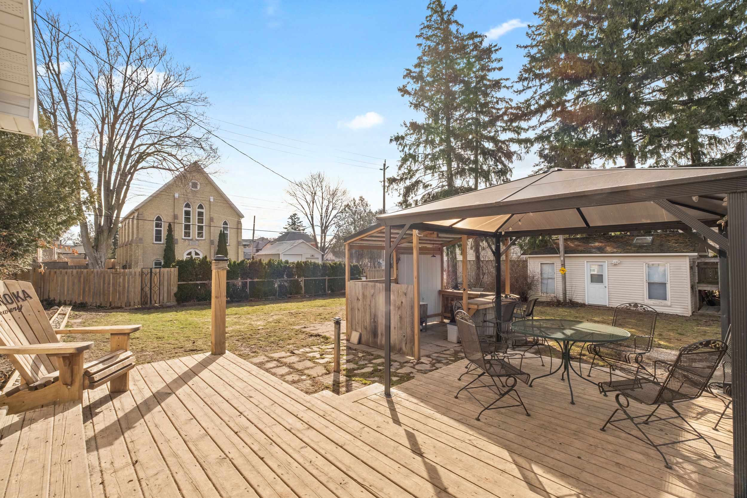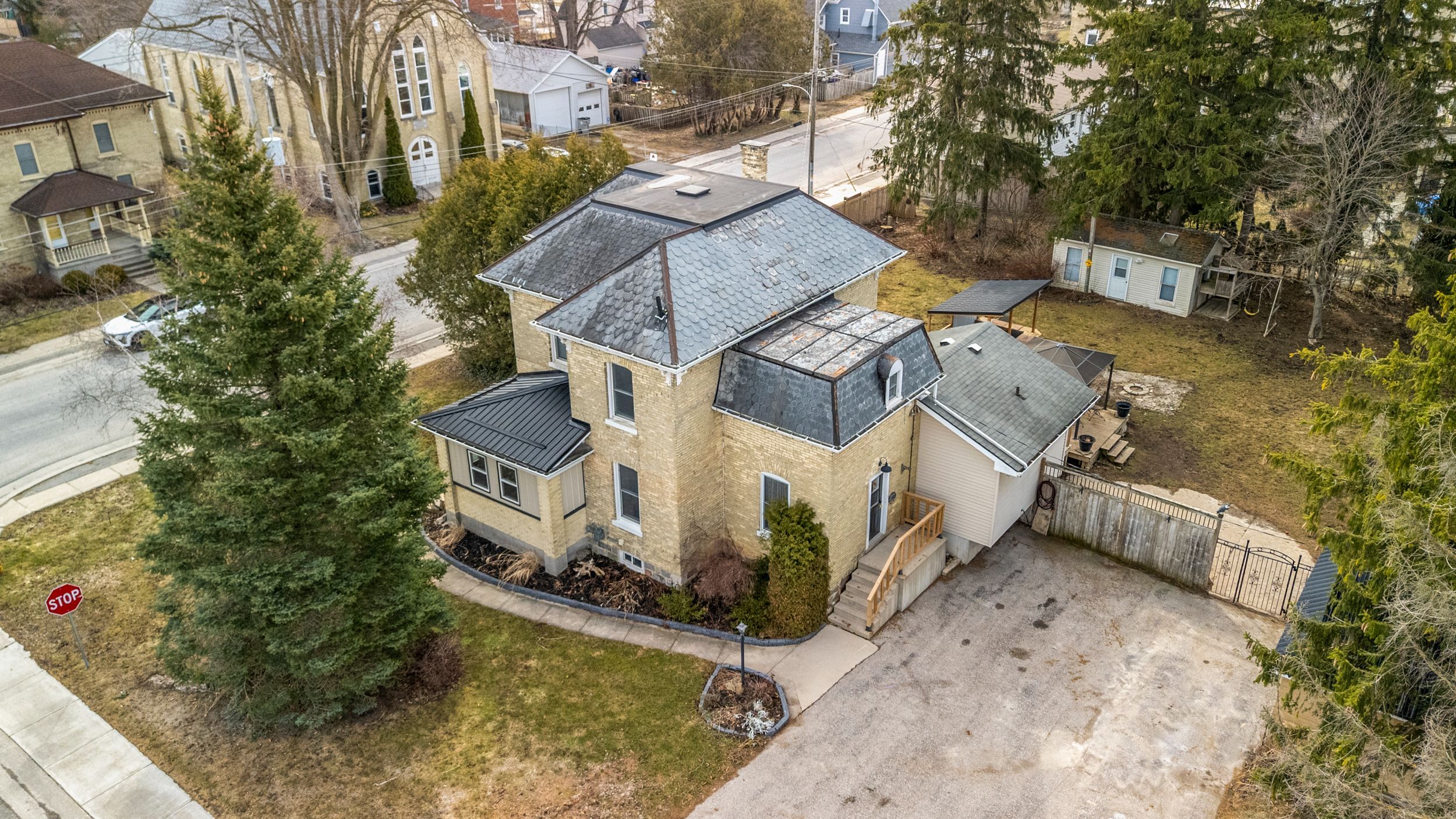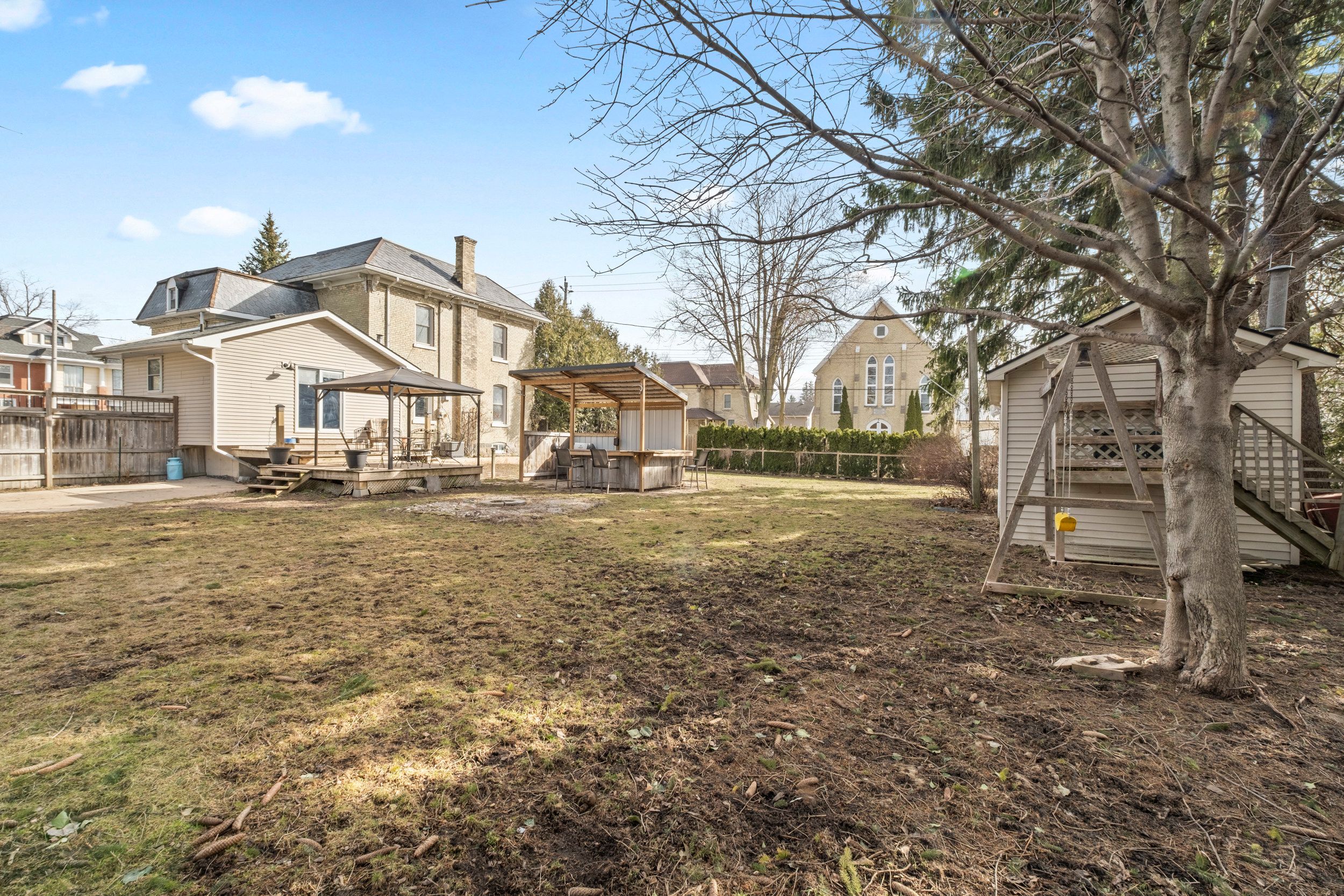 This charming yellow brick 2-storey home offers a blend of character and functionality in the heart of hensall, complemented by incredible curb appeal. Featuring 4 bedrooms and 2 bathrooms, the home includes a spacious kitchen with island seating and appliances that flows seamlessly into a large dining area and inviting living room, highlighted by a striking 3-sided fireplace. Hardwood floors, high ceilings, and original details such as pocket doors add timeless appeal, while a dedicated office space with built-ins enhances everyday living. A thoughtfully designed mudroom with direct access from nelson street adds convenience for busy households. Upstairs, you'll find four well-sized bedrooms, a 4-piece bathroom, and the added convenience of second-floor laundry. The basement provides excellent storage, a 2-piece bathroom, and in-floor heating in the addition for added comfort. Mechanical updates include 200-amp electrical service and central air (2022). Set on a fully fenced lot, the outdoor space is ideal for entertaining, featuring a two-tier deck, two gazebos, and an outdoor kitchen with hydro. A detached insulated shop with a concrete floor and steel exterior, along with a separate guest or pool house with hydro, adds versatility. The expansive lot also offers potential for severance (buyer to verify), presenting additional future opportunity. Complete with a double-wide paved driveway, this property delivers space, character, and flexibility both inside and out.