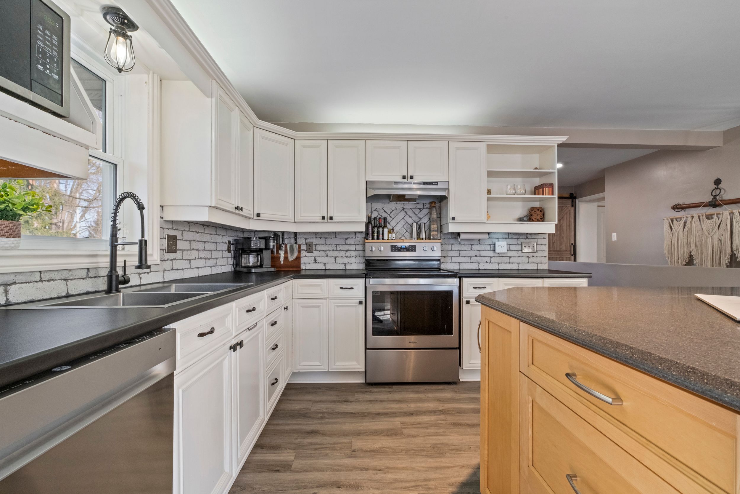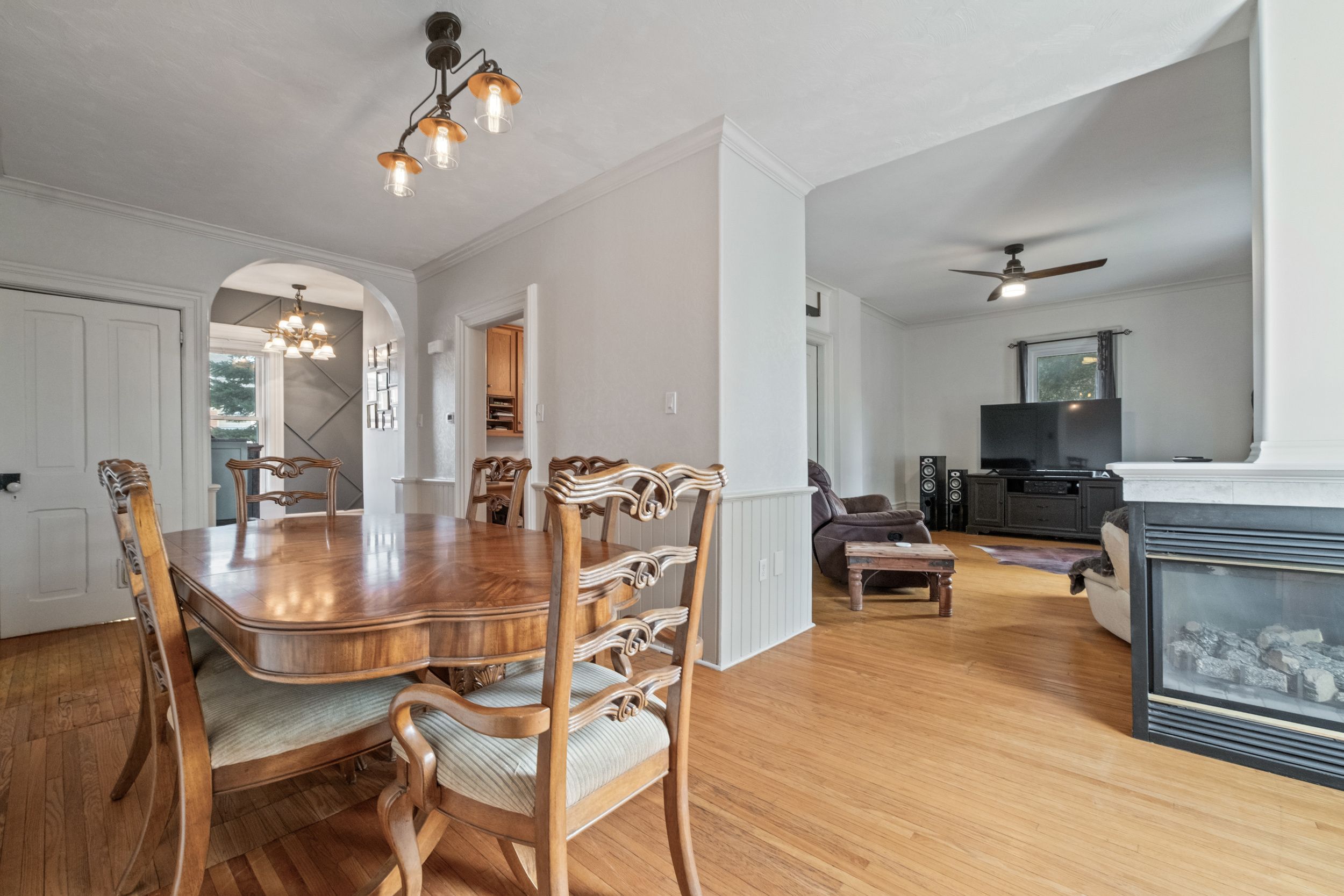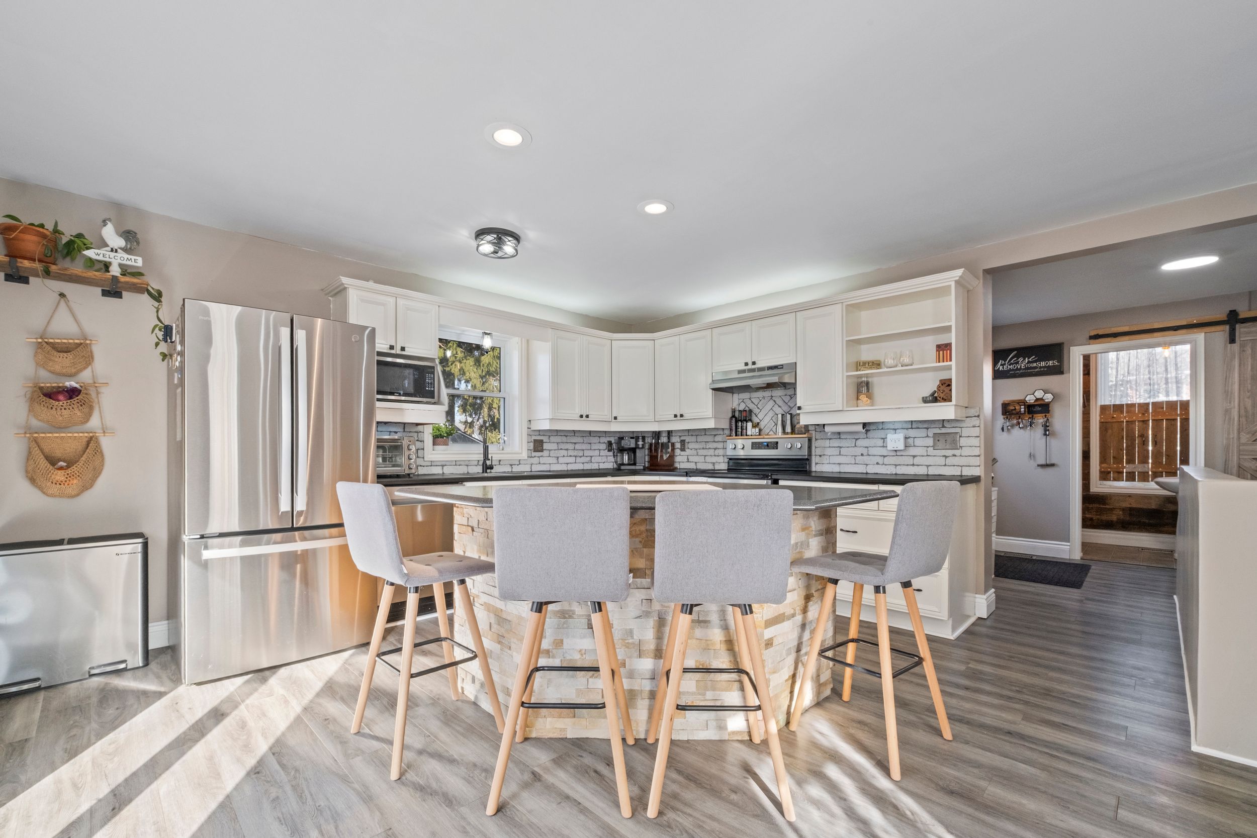 • Spacious kitchen with island seating, flowing into a large dining area.