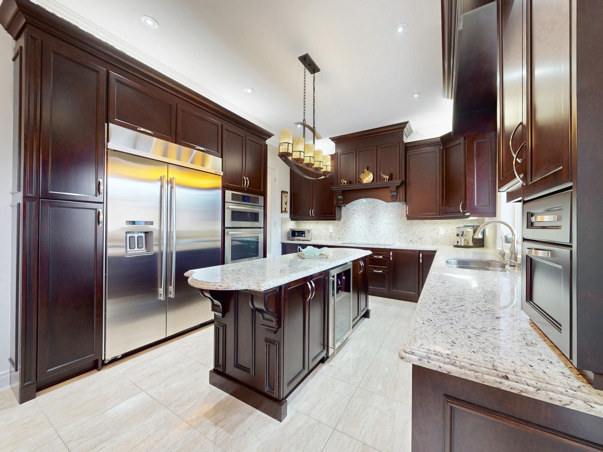 • High-end kitchen features granite counters and stainless steel appliances.