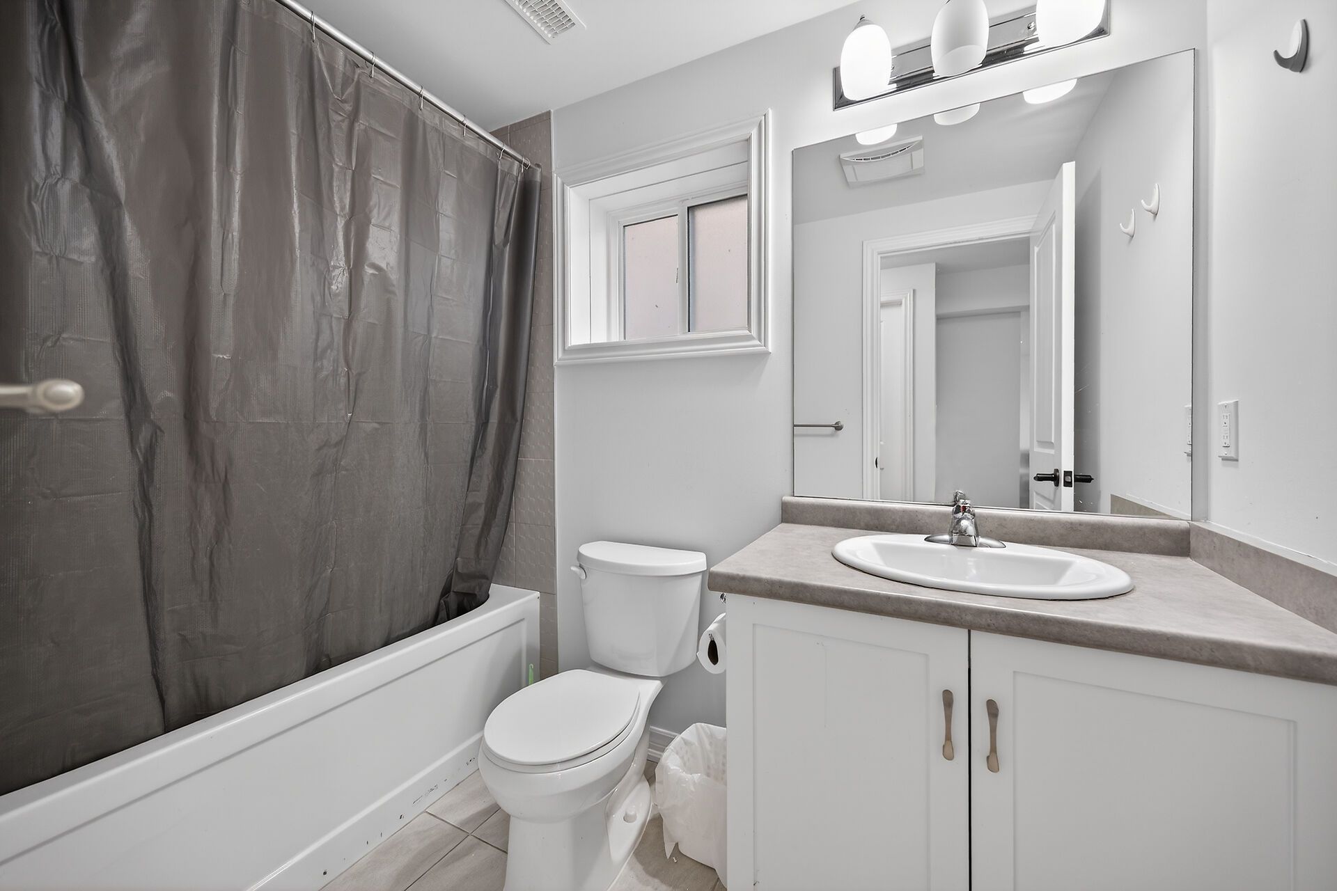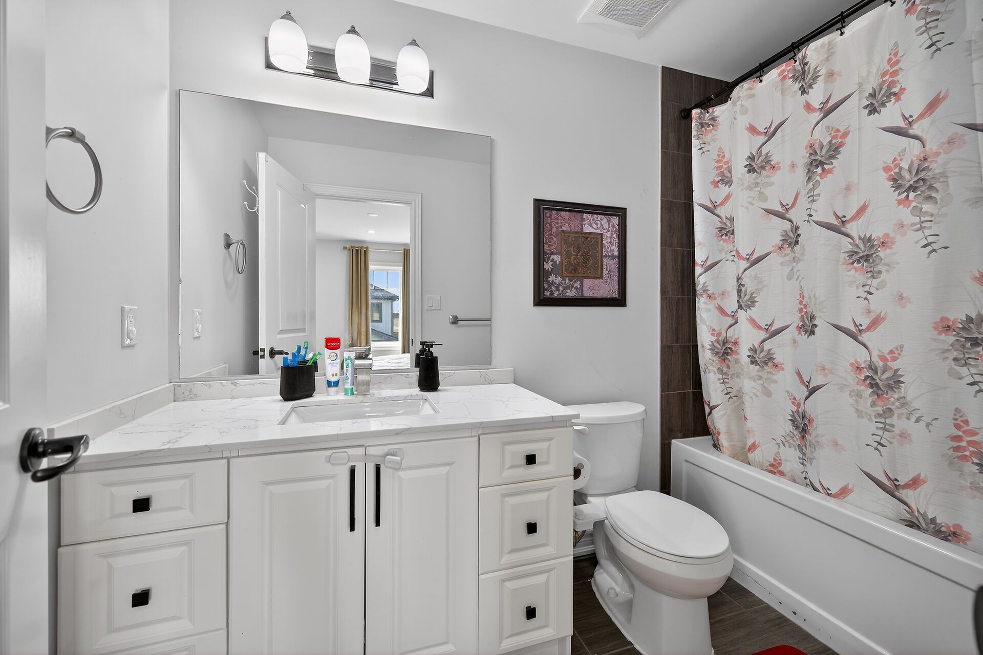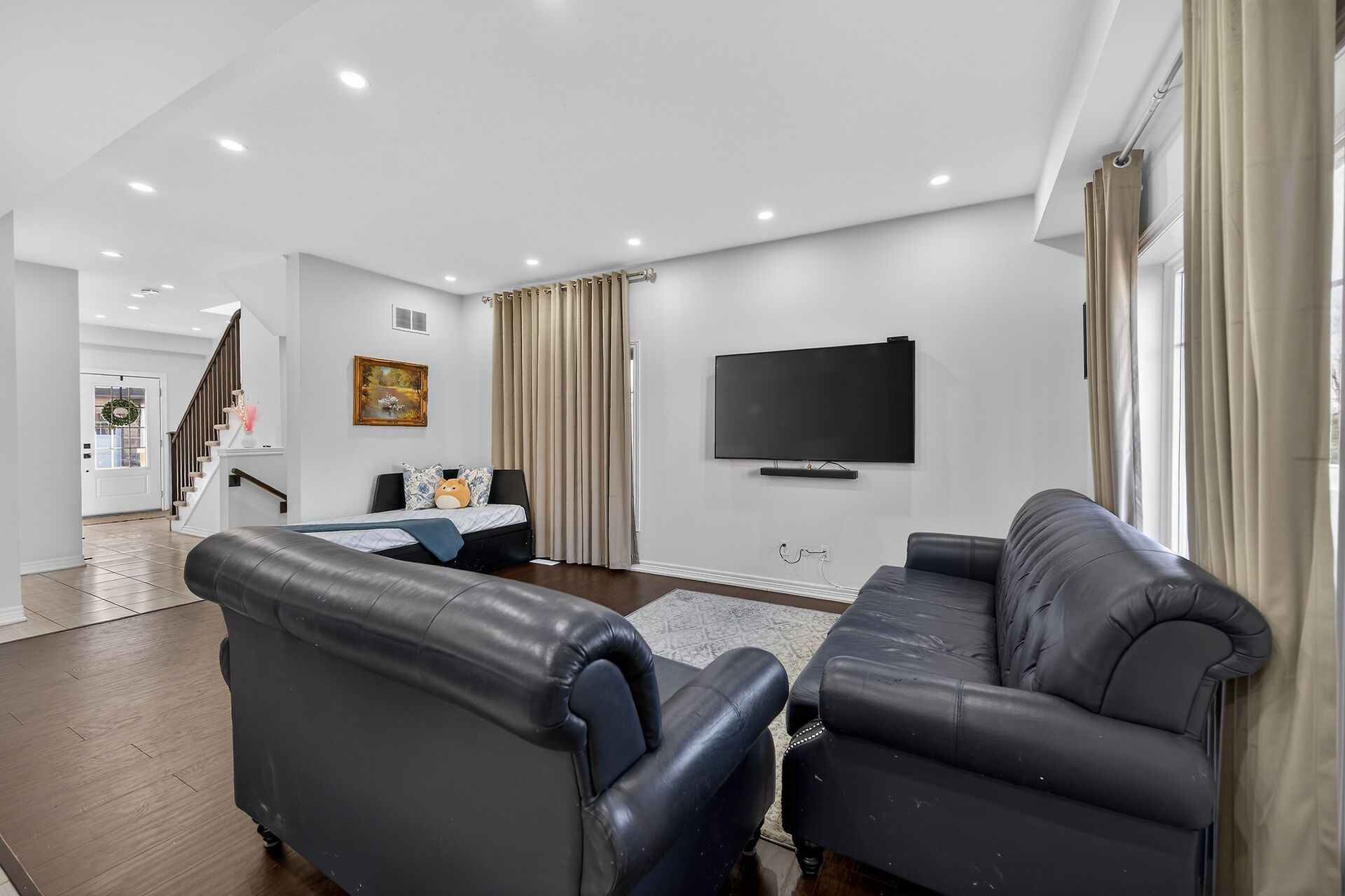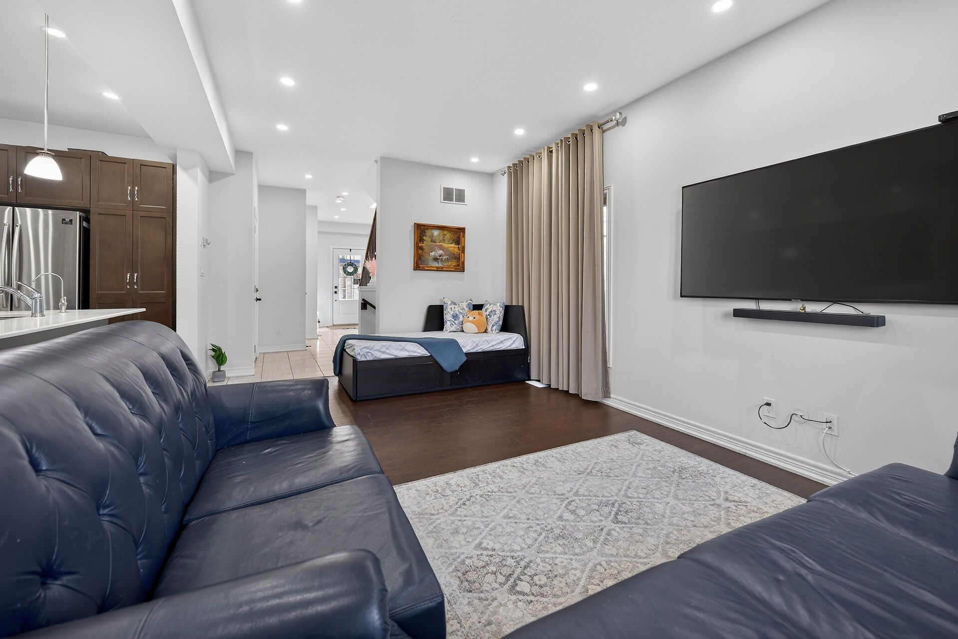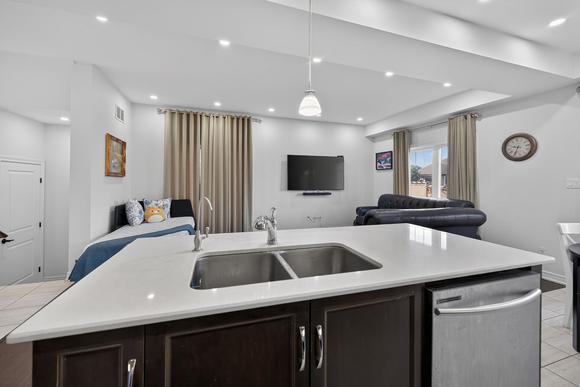 • Open-concept layout with high ceilings for a spacious feel.