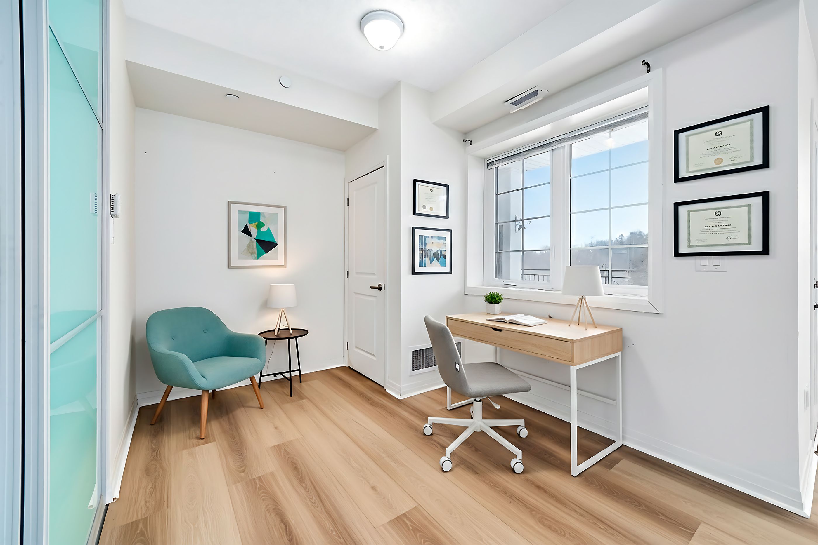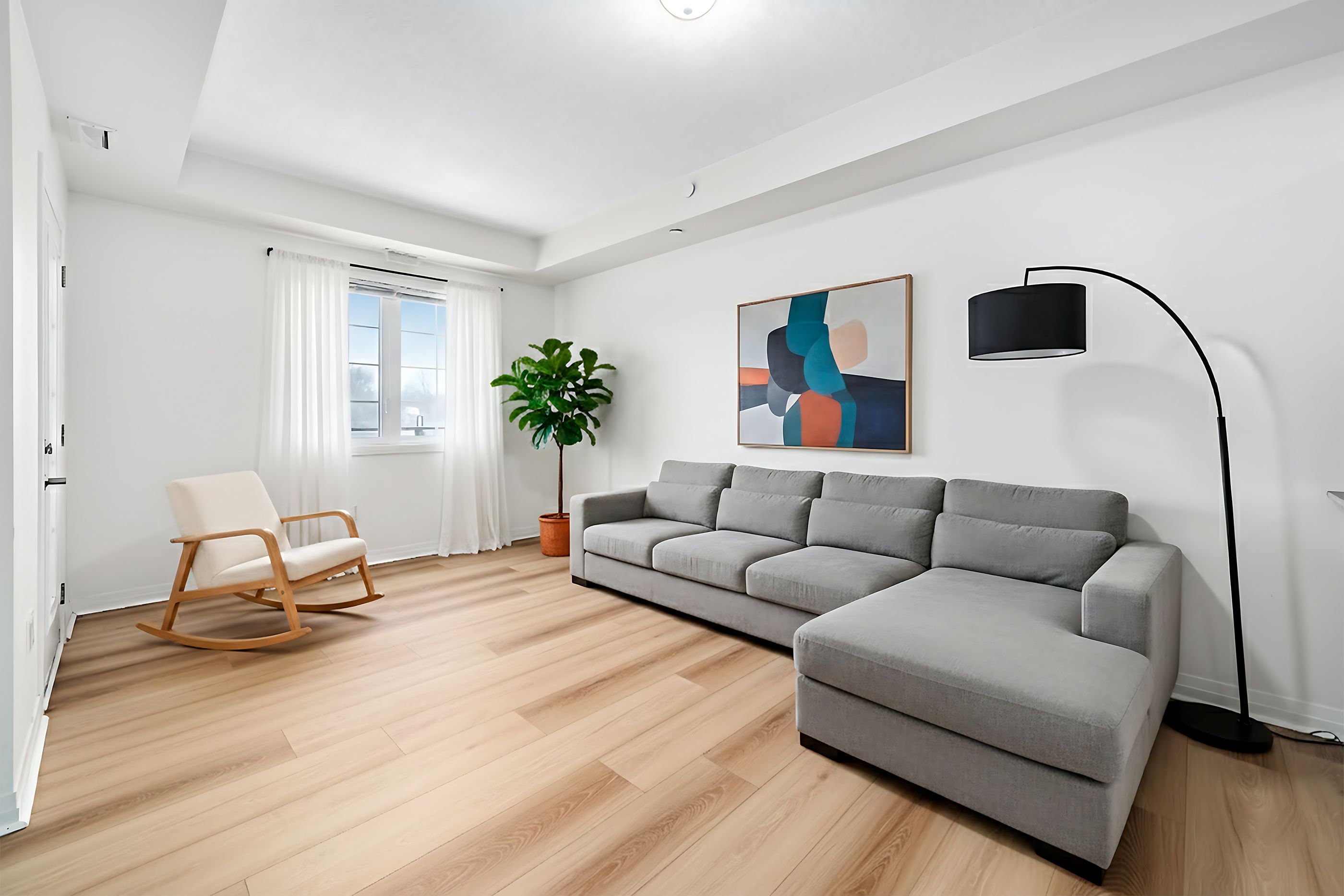 • Open-concept living space with 9-foot ceilings and modern finishes.