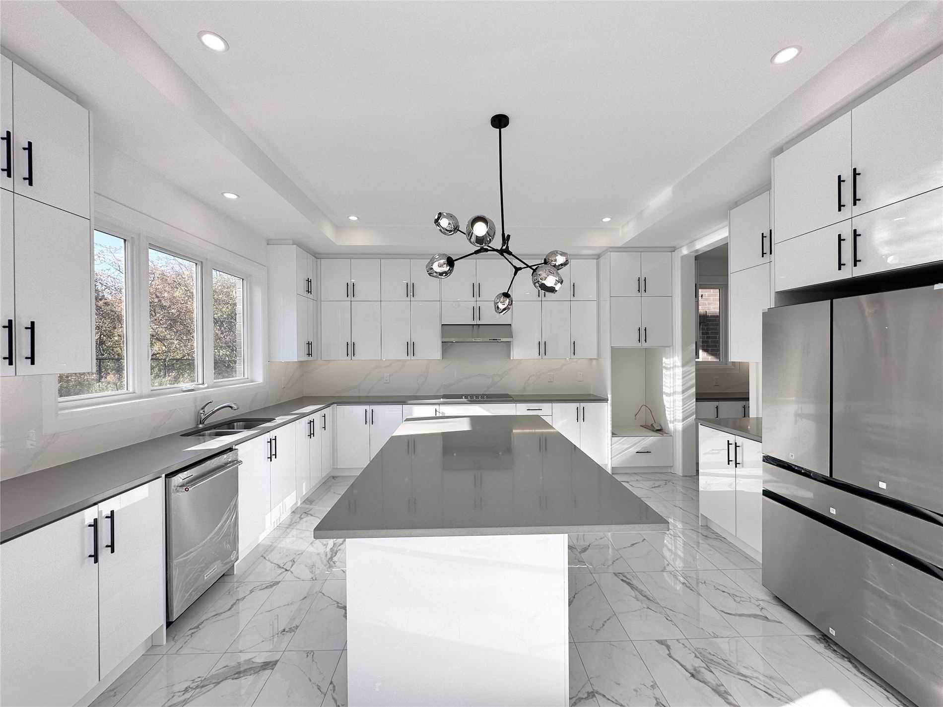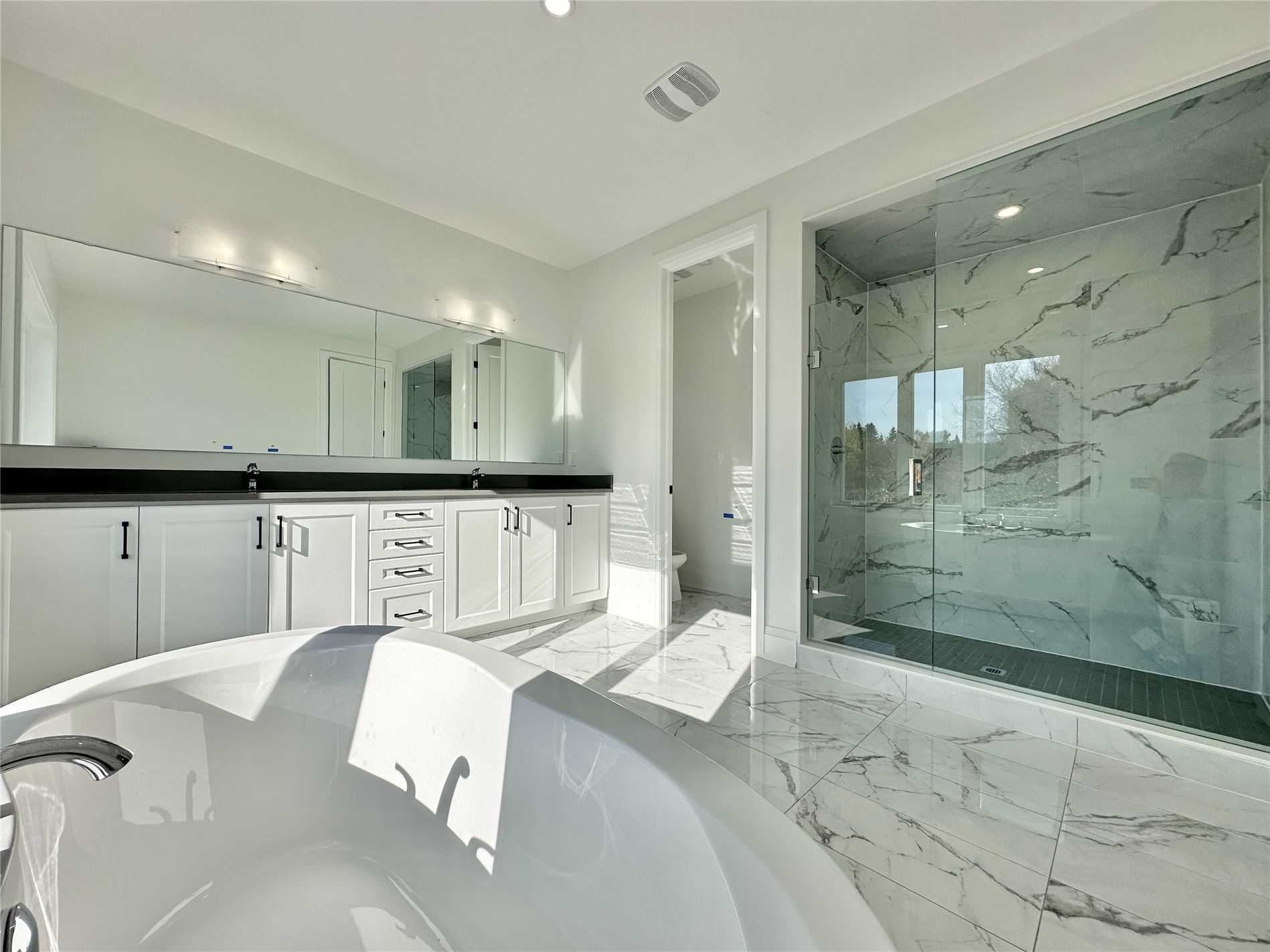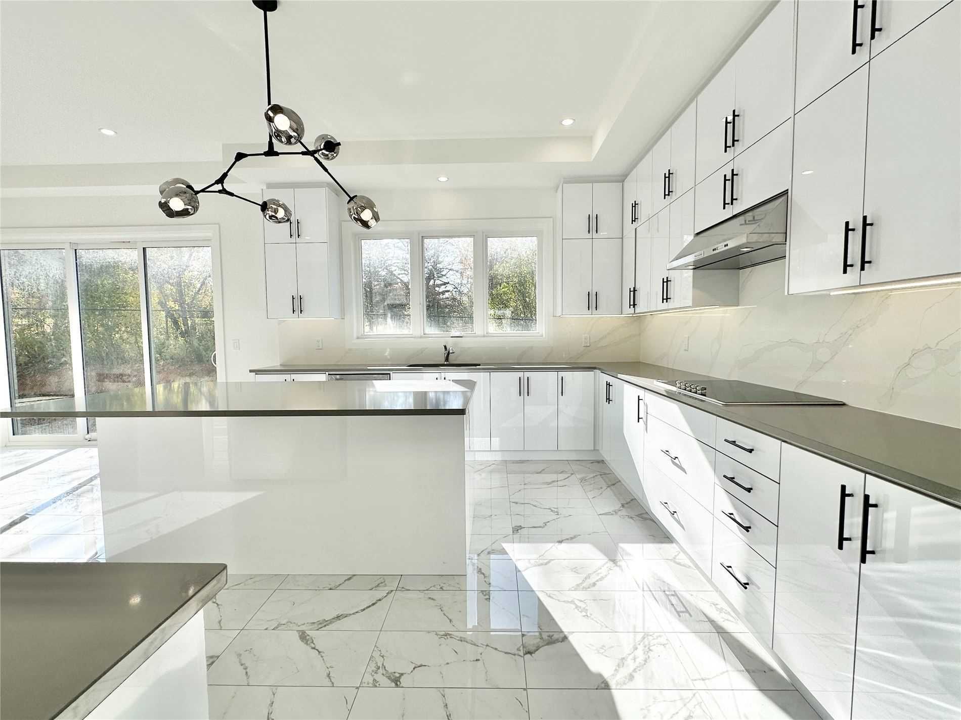 Luxury 3 car garage detached home w/ brick & stone front., 60' lot backing onto mature trees. Double 8' door entrance. Main flr 10', 2nd & bsmt 9' ceiling. $$$ upgrades: pot lights & 8' interior doors throughout. Main flr hardwood flooring & office. Extended kitchen cabinet w/ valance lighting, quartz countertop & backsplash, centre w/ breakfast bar. W/i pantry & servery. Coffered ceiling in living/dining/master. Waffle ceiling in family. 8' interior door throughout. Oak staircase with iron pickets. Quartz vanity top in all baths. South exposure backyard. Steps to school & park, minutes to shopping, conservation, go train & hwy 404...