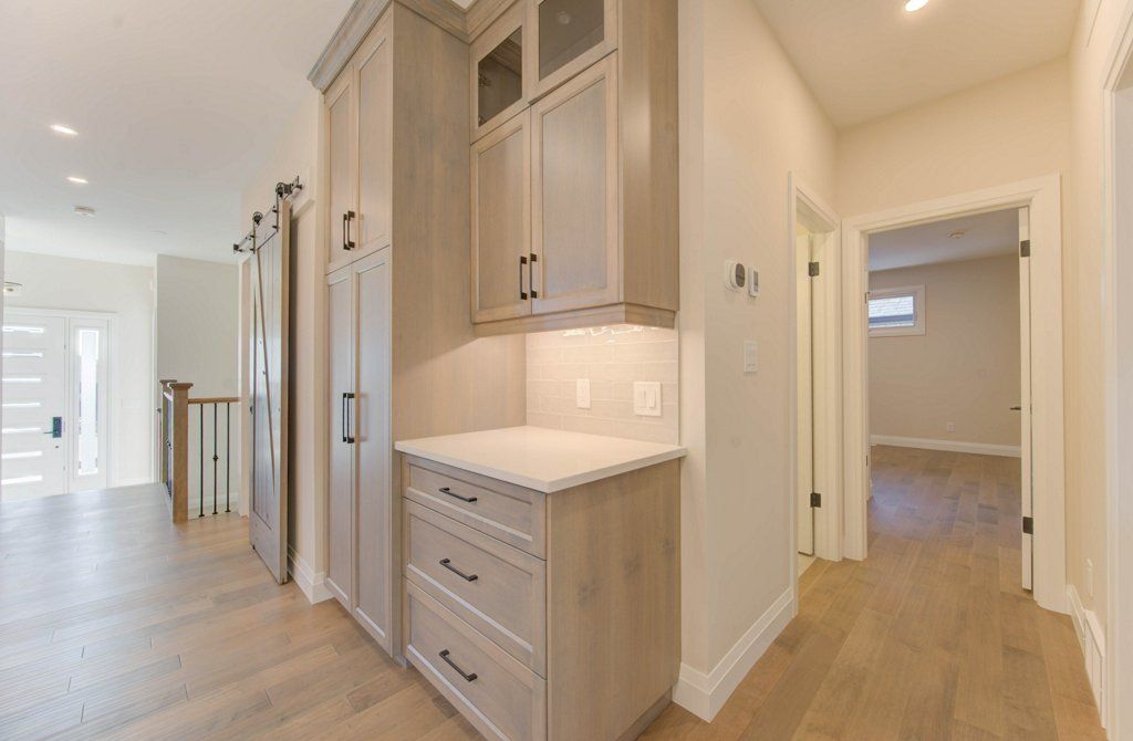 Located in the sought-after southwood park community, this beautifully crafted bungalow invites you to experience comfort, connection, and elevated everyday living. Its timeless exterior blends brick, stone, board-and-batten accents, and stained douglas fir beams, creating a warm welcome from the moment you arrive. A covered rear porch with composite decking extends your living space outdoors-perfect for morning coffee or watching kids and pets enjoy the backyard. Step inside to an inspiring main floor with 11-foot ceilings in the sunken entry and office, and 9-foot ceilings throughout. The living room's stepped ceiling, crown molding, and linear electric fireplace add sophistication and warmth. Stained maple staircases, hardwood flooring, and premium trim create a seamless blend of craftsmanship and comfort. The chef's kitchen is the heart of the home, featuring painted maple cabinetry, quartz countertops, soft-close hardware, glass displays, roll-out pantry shelves, spice pull-outs, led lighting, and a spacious island for gatherings and everyday moments. Your private retreat awaits in the primary suite with a custom walk-in closet and a serene ensuite offering in-floor heating, a curbless tile shower with niche and glass enclosure, matte-black fixtures, dual sinks, a rainhead shower, and a freestanding soaker tub. The finished basement adds over 1,000 sq. Ft. Of flexible living space ideal for hosting, hobbies, or extended family. Enjoy a stylish wet bar with quartz counters and a beverage fridge, a linear fireplace feature wall, and generous rooms designed for comfort. Smart and efficient, this home includes a security and automation system, smart switches, a video doorbell, structured wiring, an ev charger rough-in, a high-efficiency furnace, cold-climate heat pump, erv, upgraded insulation, and a humidifier. Every detail has been thoughtfully selected to enhance everyday living. More than a house, it's a place to settle in, grow, and create lasting memories.
