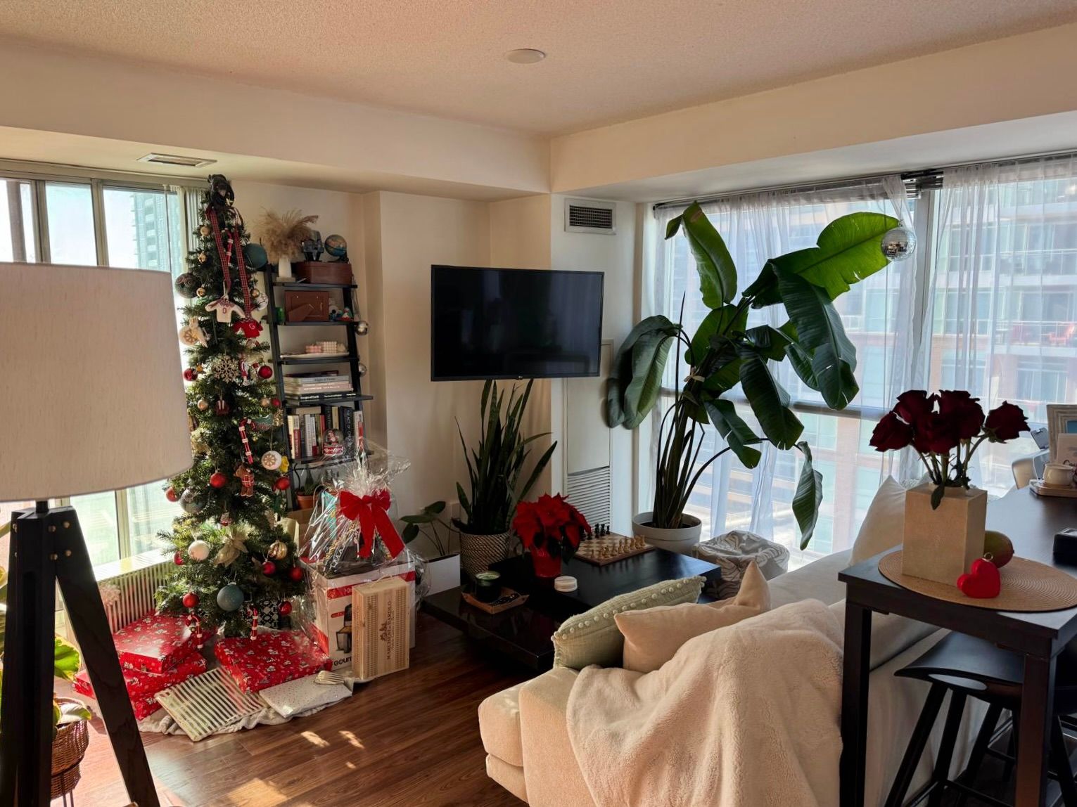 • Wood flooring and floor-to-ceiling windows create a bright atmosphere.