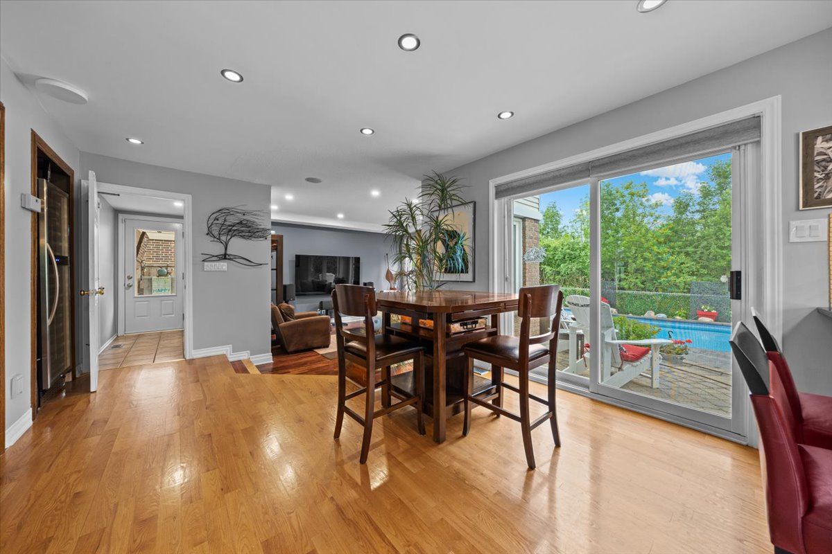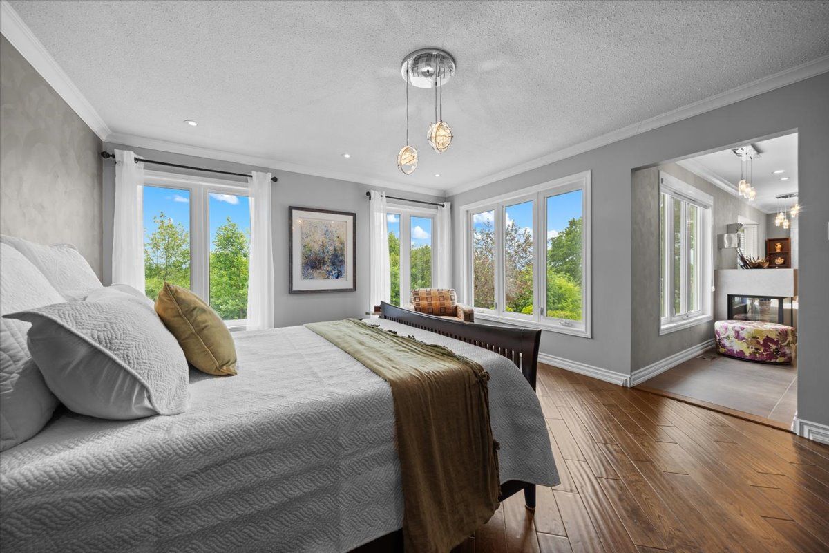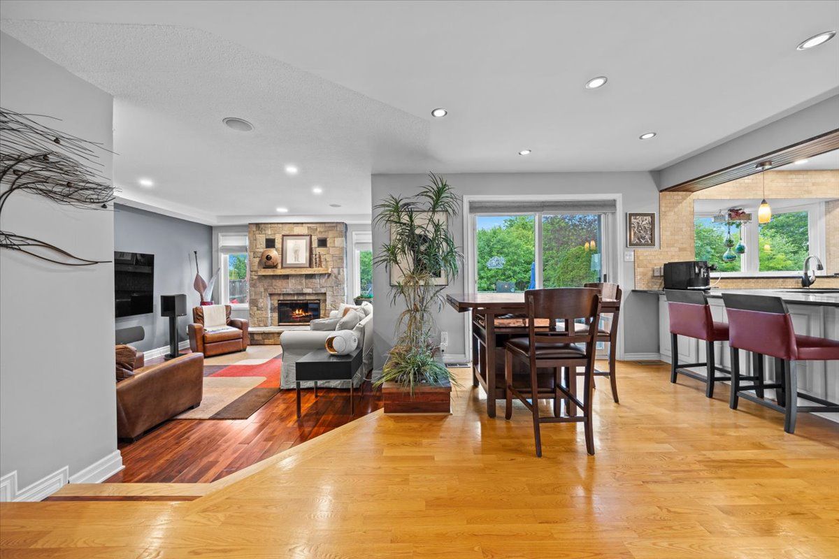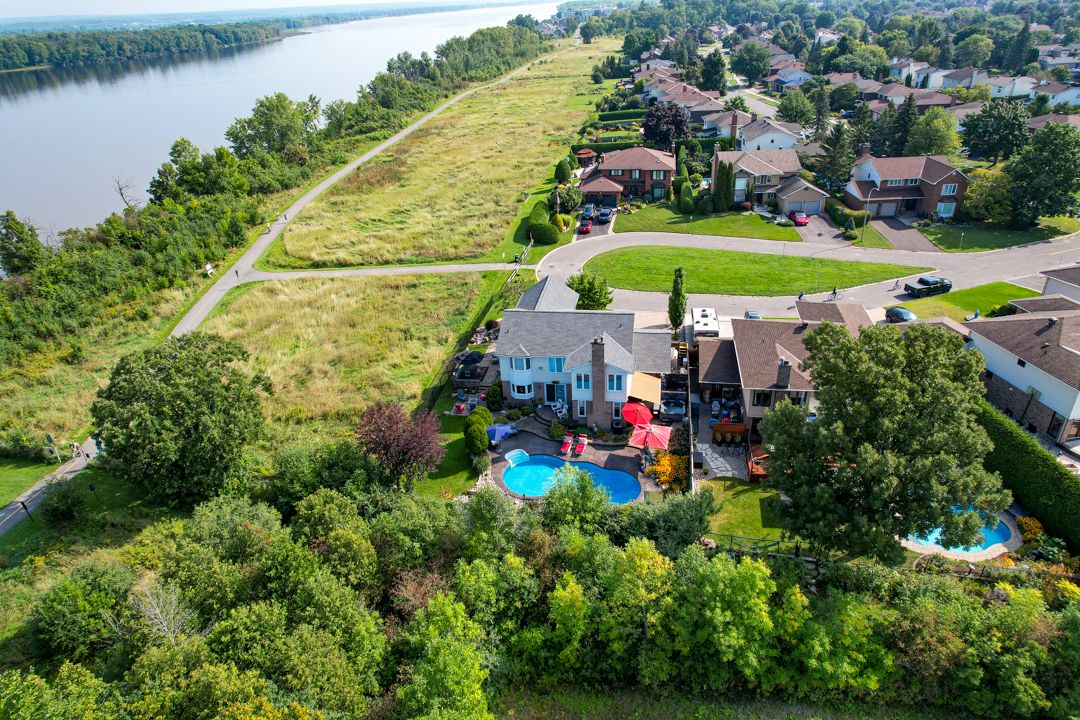 Set on a quiet cul-de-sac in the established enclave of convent glen north, this distinguished residence is defined by privacy, mature landscape, & sweeping views toward the ottawa river while bordering protected ncc green space. Wrought iron fencing, interlock approach, & sculpted architectural planting create a composed arrival, leading to twin glass entry doors & a gracious foyer anchored by a curved staircase & site finished hardwood flooring throughout the principal level. The interior balances openness w/intention. A thoughtfully designed kitchen features quartz surfaces, refined cabinetry, integrated lighting, bay window seating, & a wall of pantry storage w/glass detailing. The adjacent dining room, framed by crown moulding, opens through wide patio doors to an elevated stone terrace oriented toward river & forest views. A sunken living room centred on a sculptural gas fireplace & a separate family room w/stone hearth & corner windows provide inviting spaces for gathering & quiet retreat. A discreet powder room & service access connect seamlessly to outdoor entertaining areas including barbecue terrace & hot tub patio. Upstairs, the primary suite offers morning river views, a three sided fireplace, expansive glazing, & a full wall of custom storage. The spa inspired ensuite presents a freestanding tub, dual vanities, radiant heated flooring, & a generous glass shower. Additional bedrooms are well proportioned & served by a refined main bath finished in travertine with oversized walk in shower. The lower level extends living w/a multifunctional recreation space, wet bar, private den, secondary powder room, & dedicated laundry. Outdoors, forested privacy surrounds a heated saltwater pool & architectural hardscape designed for relaxation & entertaining. Walking distance to river pathways, transit, future light rail, shopping, & schools, this home offers a rare balance of natural seclusion & urban convenience, 24 hour irrevocable on all offers.
