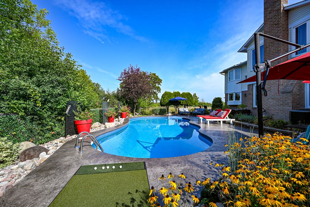 • Heated saltwater pool surrounded by architectural hardscape for relaxation.
