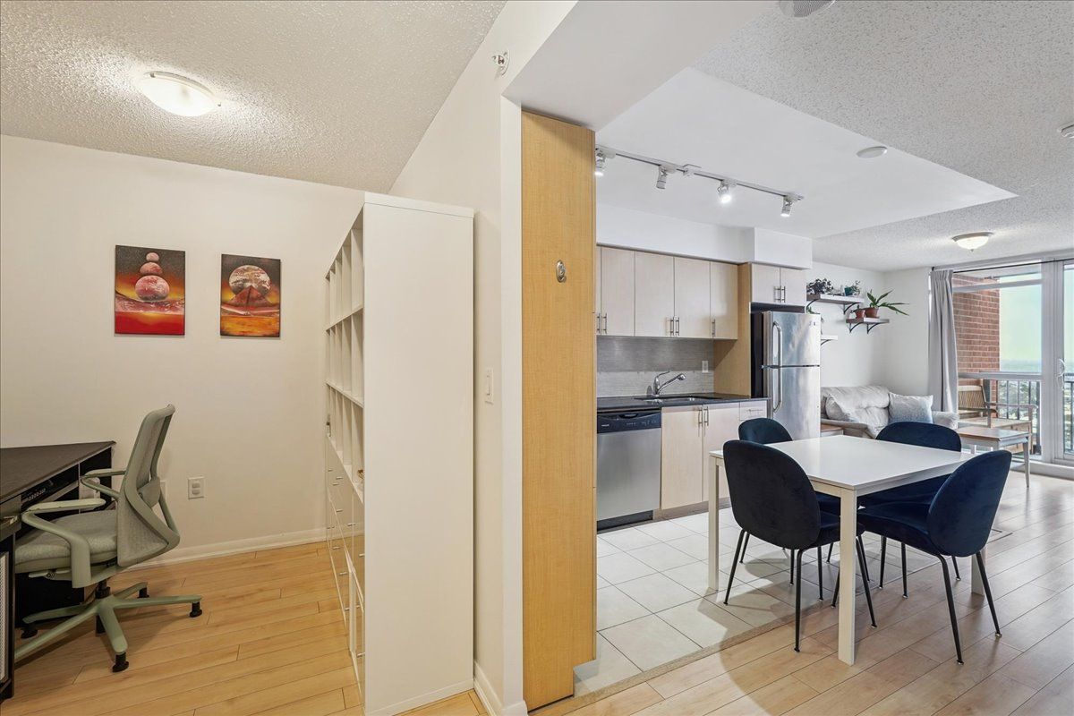The treviso at 800 lawrence west offers a refined approach to north york living, where comfort, function, and flow come together. Rising 22 storeys, the building captures sweeping city views and delivers a strong presence in the neighbourhood. Life at 800 lawrence is defined by ease, with walkable access to an impressive mix of local businesses and restaurants, and a drugstore conveniently located just across the street. Inside this thoughtfully designed one-bedroom plus den, one-bathroom suite, the layout is both efficient and intuitive. Superior sound insulation creates a remarkably quiet living environment, while the den is positioned across the suite from the bedroom and living area, making it ideal for working professionals or those working from home. Minimal hallway space, generous closet capacity, and an additional storage locker make the unit feel larger than its footprint and stay effortlessly organized. Floor-to-ceiling sliding glass doors frame beautiful sunset views from the west-facing exposure. Step outside to the oversized balcony, which offers an inviting outdoor space perfect for summer entertaining. Residents also enjoy access to an array of amenities, including an exercise room, recreation room, pool, and 24-hour security. Underground parking keeps your vehicle secure and protected year-round. With its intentional design, enviable location, and lifestyle-forward amenities, this suite at 800 lawrence west offers a complete package for those seeking a home that balances comfort, style, and convenience.