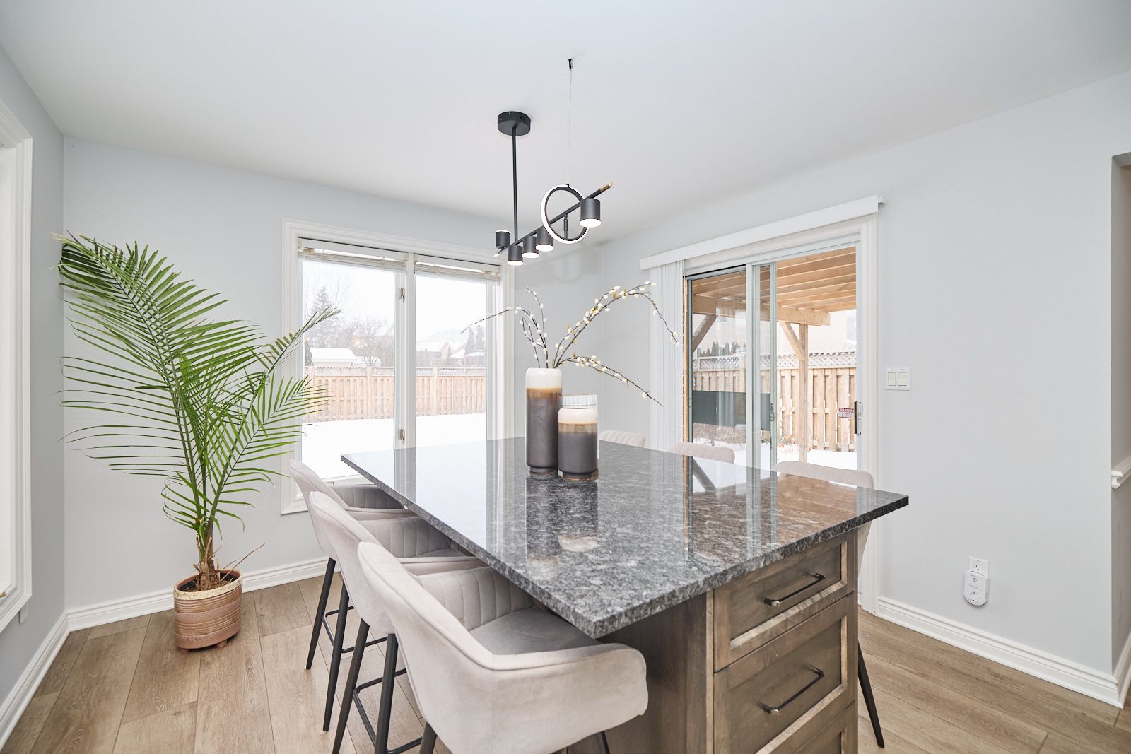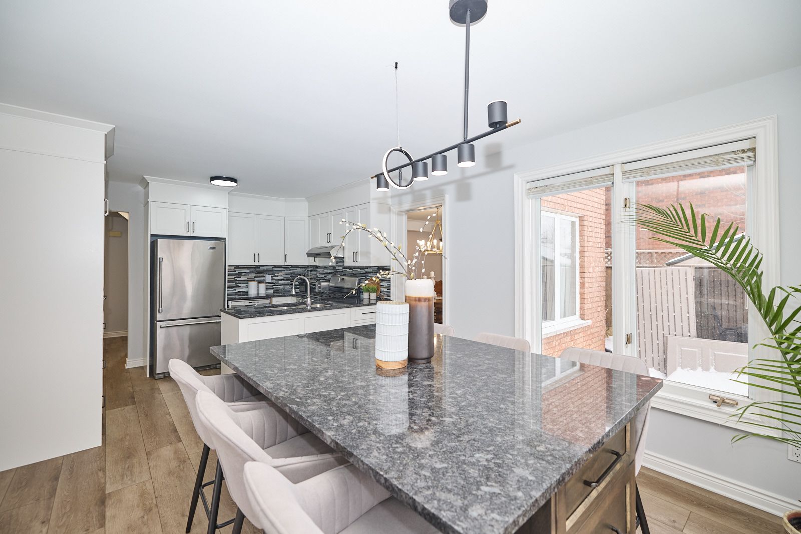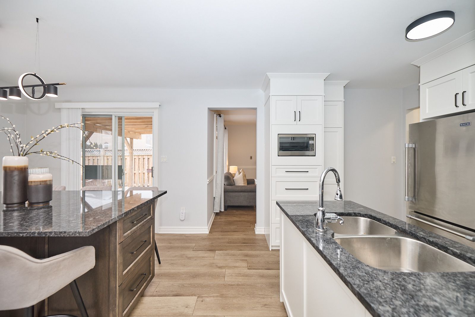 • Updated kitchen features granite counters and a large island for casual dining.