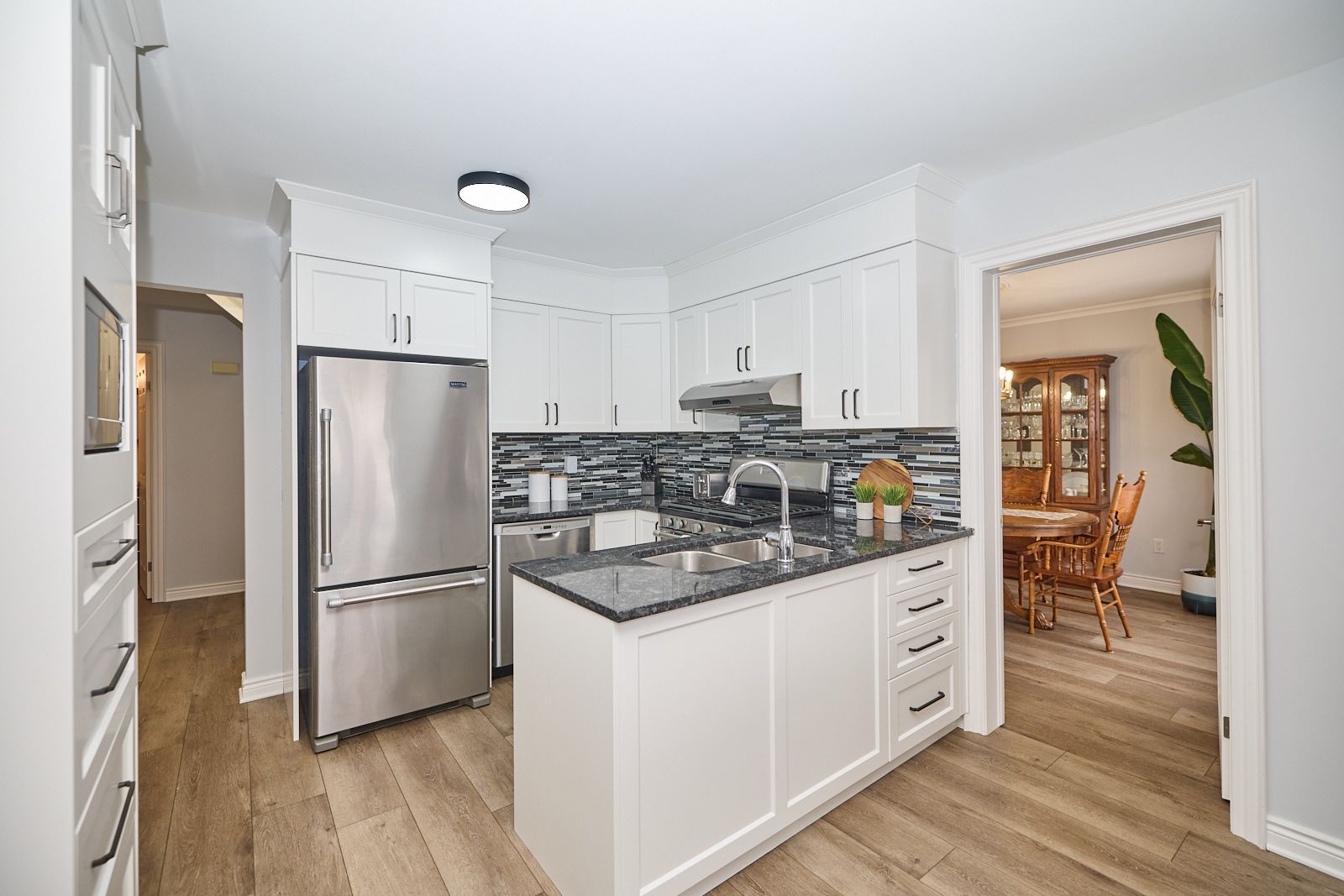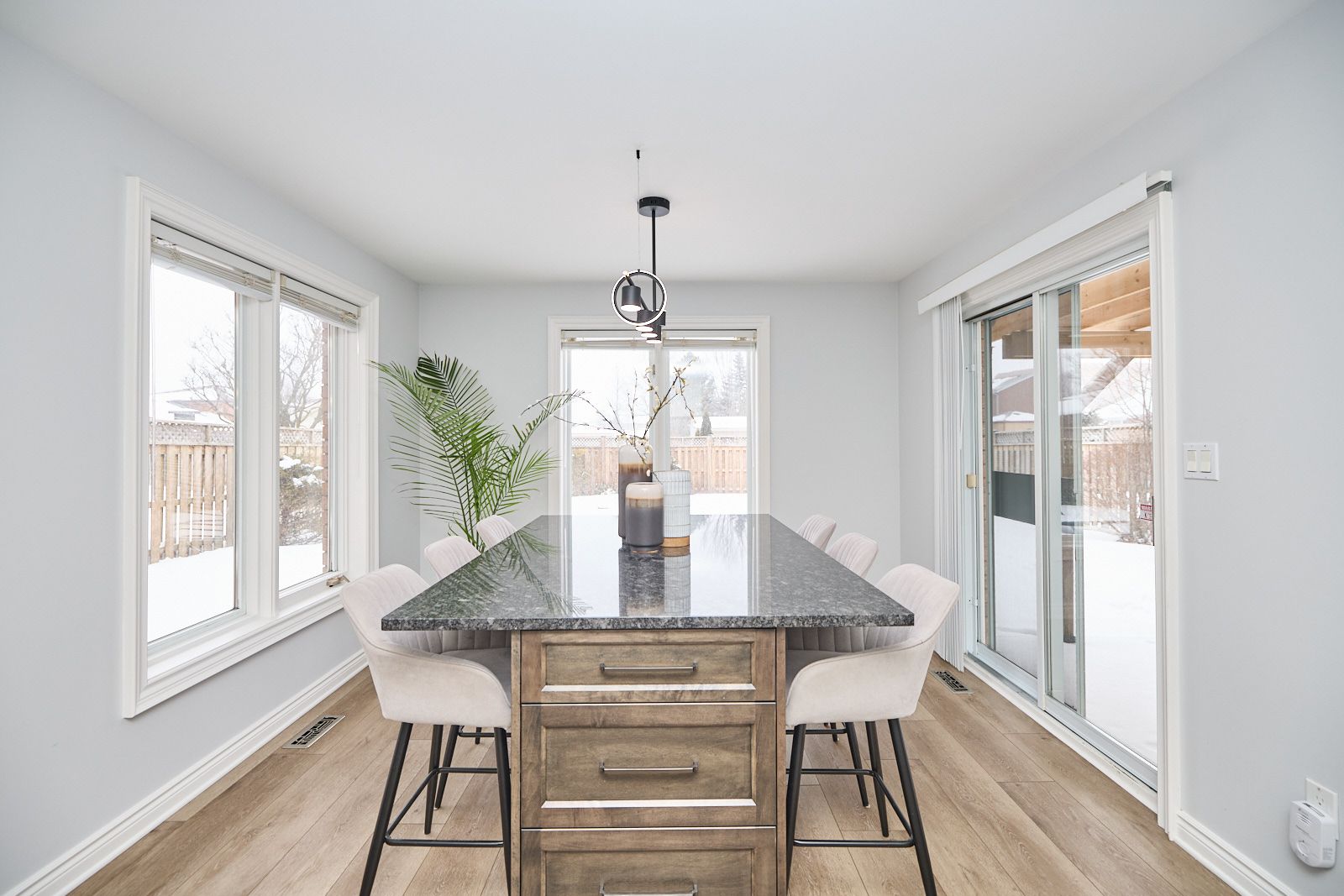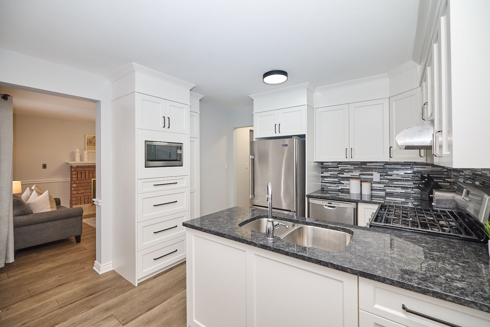 • Updated kitchen features granite counters and a large island for casual dining.