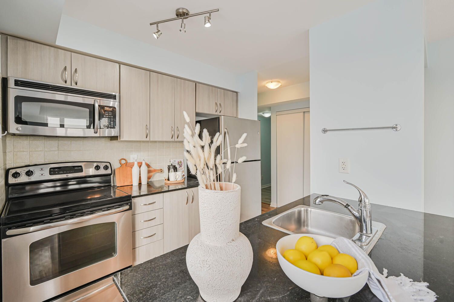 • Open-concept layout with modern kitchen and granite countertops.