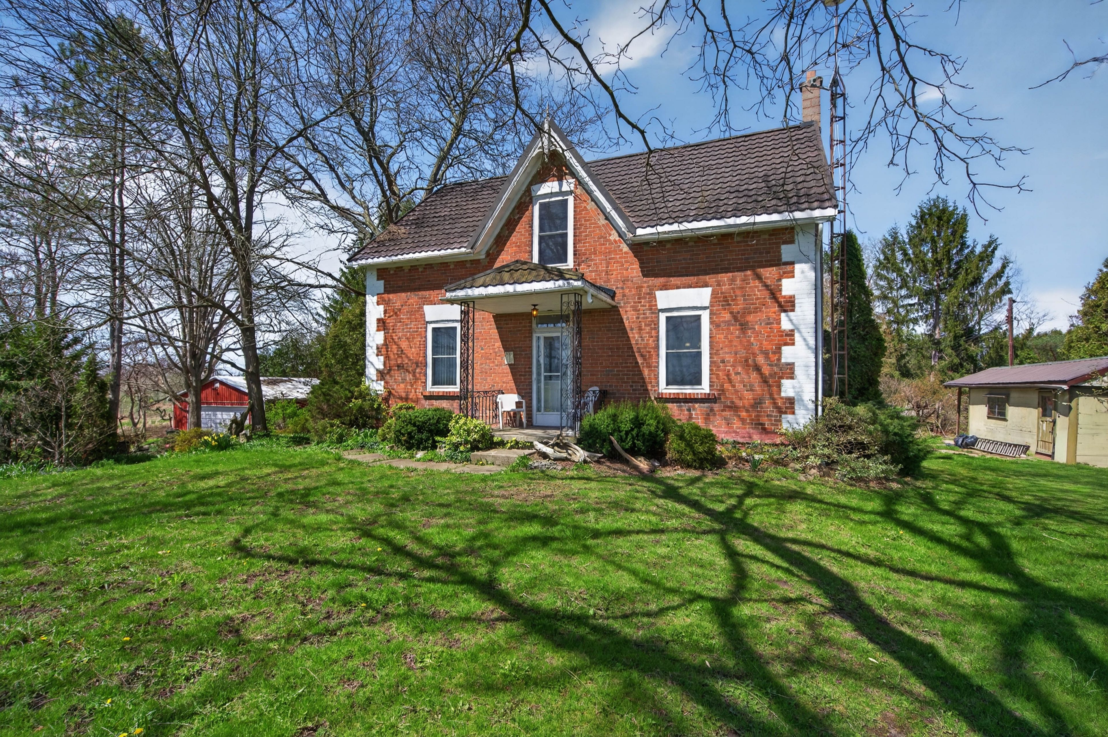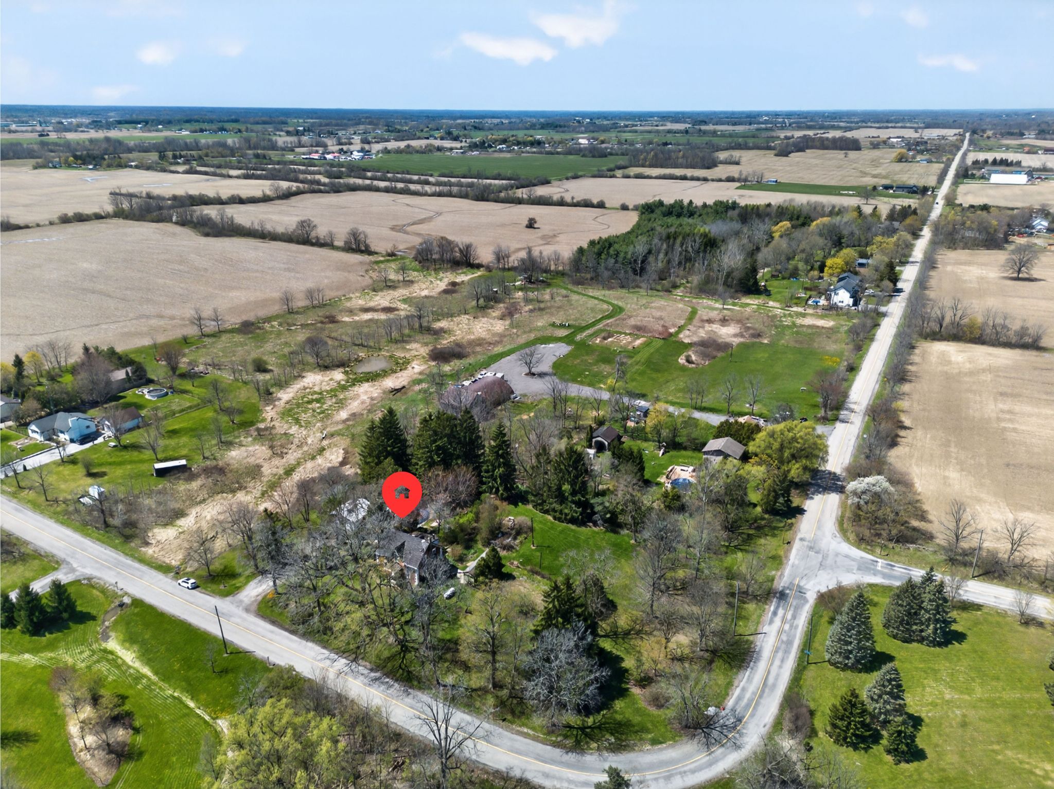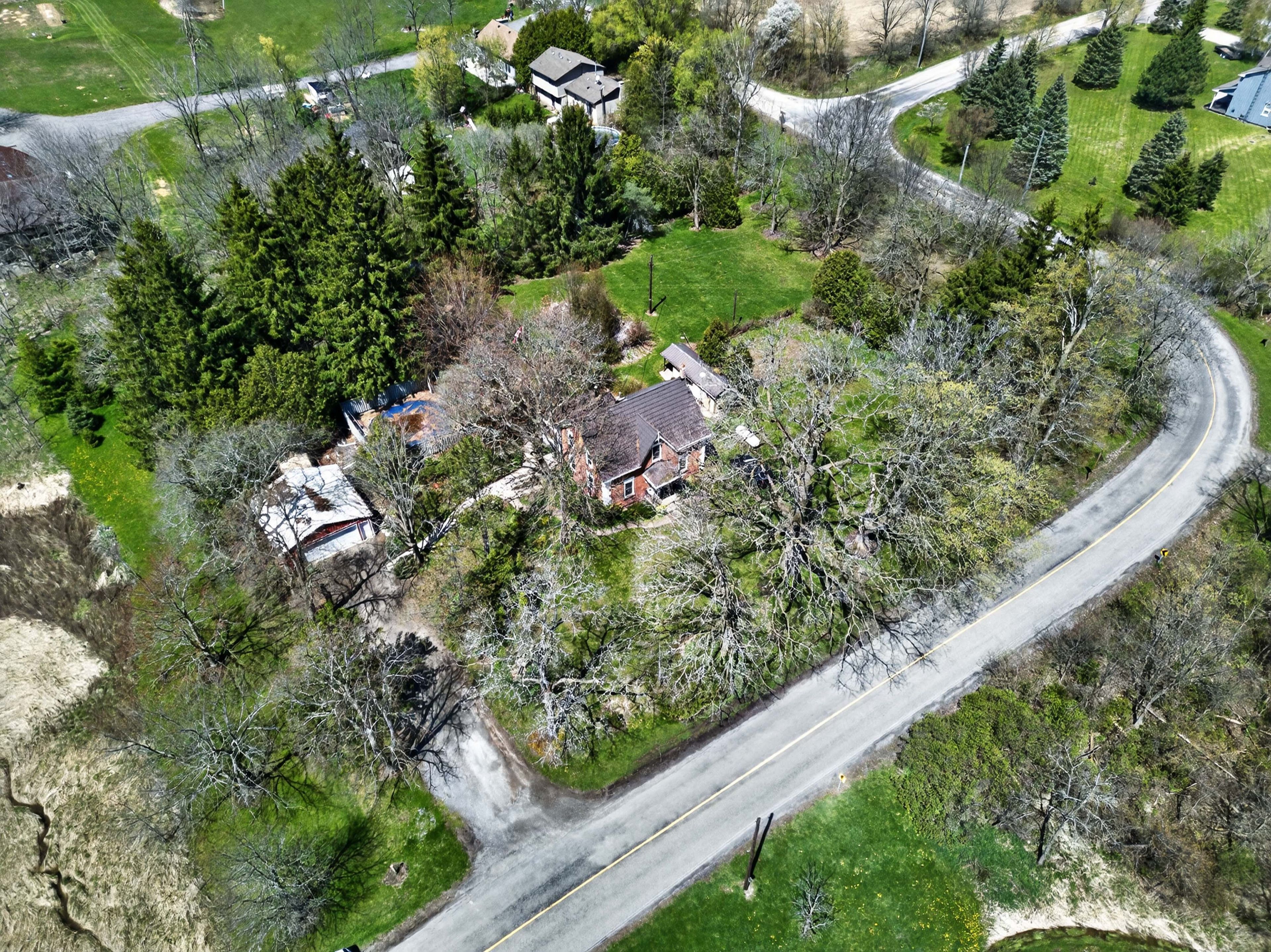Situated at the end of a quiet country road, this 1. 392-a property offers a rare blend of privacy, character, & long-term potential. Framed by mature trees on a picturesque 200' x 300' lot, this circa 1892 farmhouse showcases timeless charm w/ subtle gothic revival influence & a welcoming covered front porch. Inside, the 1,958 sq ft 2-stry layout offers a traditional yet functional design. The main lvl feat a foyer, formal liv rm w/ a decorative beamed coffered ceiling w/ rustic timber grid, formal dining room, private study, & an eat-in kitchen w/ built-in bench seating. A bright family rm anchors the home w/ expansive rear-facing windows, built-in cabinetry, & a striking fieldstone feat wall w/ a raised hearth. A 4-pc bath completes the lvl. Upstairs, 4 bdrms & a 2nd 4-pc bath are complemented by a 2nd kitch, previously used as an in-law suite - ideal for multi-generational living or future flexibility. The unfinished lower lvl incl laundry, storage, a workshop, and a separate walk-up entrance with direct exterior access. Outdoors, the lifestyle offering continues with a detached 3-car garage, parking for 10+ vehicles, an on-ground pool, a private pond, and multiple outbuildings. Dense rear foliage creates a peaceful, cottage-like setting with stunning vistas and minimal road traffic. Positioned east of highway 6, this location delivers the best of both worlds - a quiet rural setting with seamless access to the hamilton mountain (10 minutes) and caledonia (7 minutes). Enjoy efficient commuting, proximity to major amenities, and the flexibility of country living without isolation. Recent updates include a 200 amp panel (3 years), central air (3 years), septic tank (5 years), propane furnace (5 years), well pump (2026), water softener, reverse osmosis system, many windows, rental propane tank, & more (all dates approximate). A home requiring tlc, yet rich in character and opportunity - ideal for those seeking space, privacy, and the ability to add value over time.