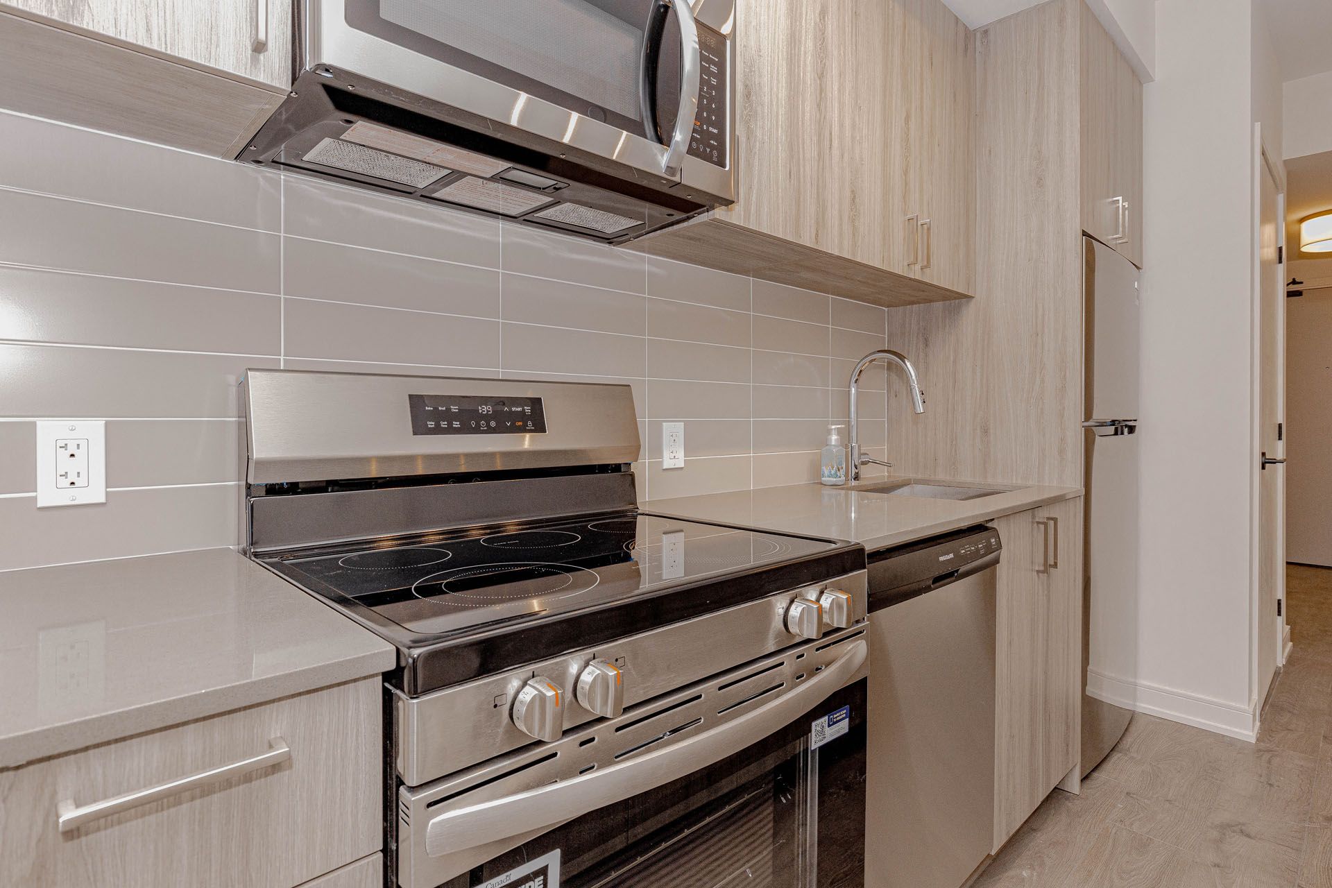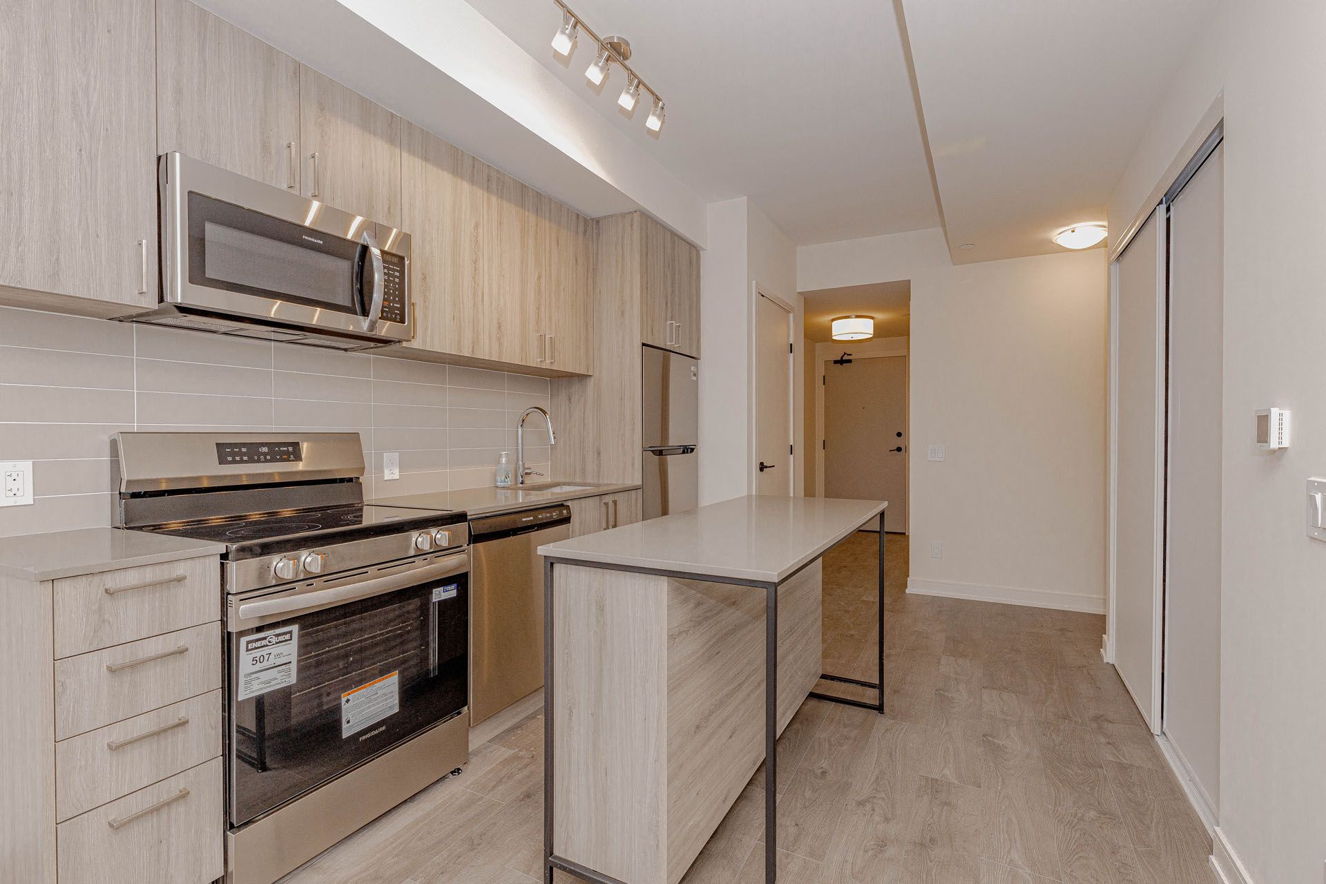 • Open-concept living space with modern kitchen and stainless steel appliances.