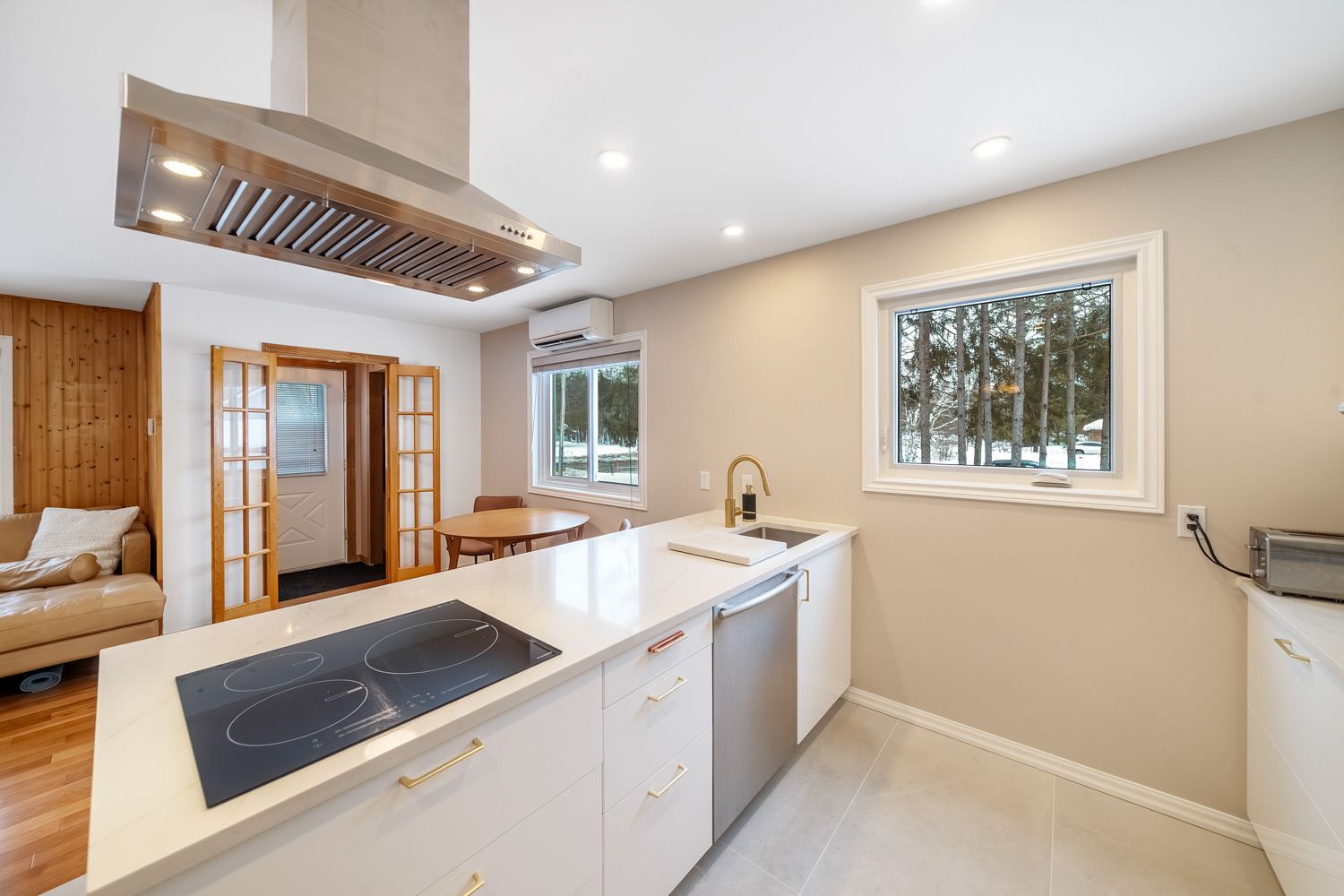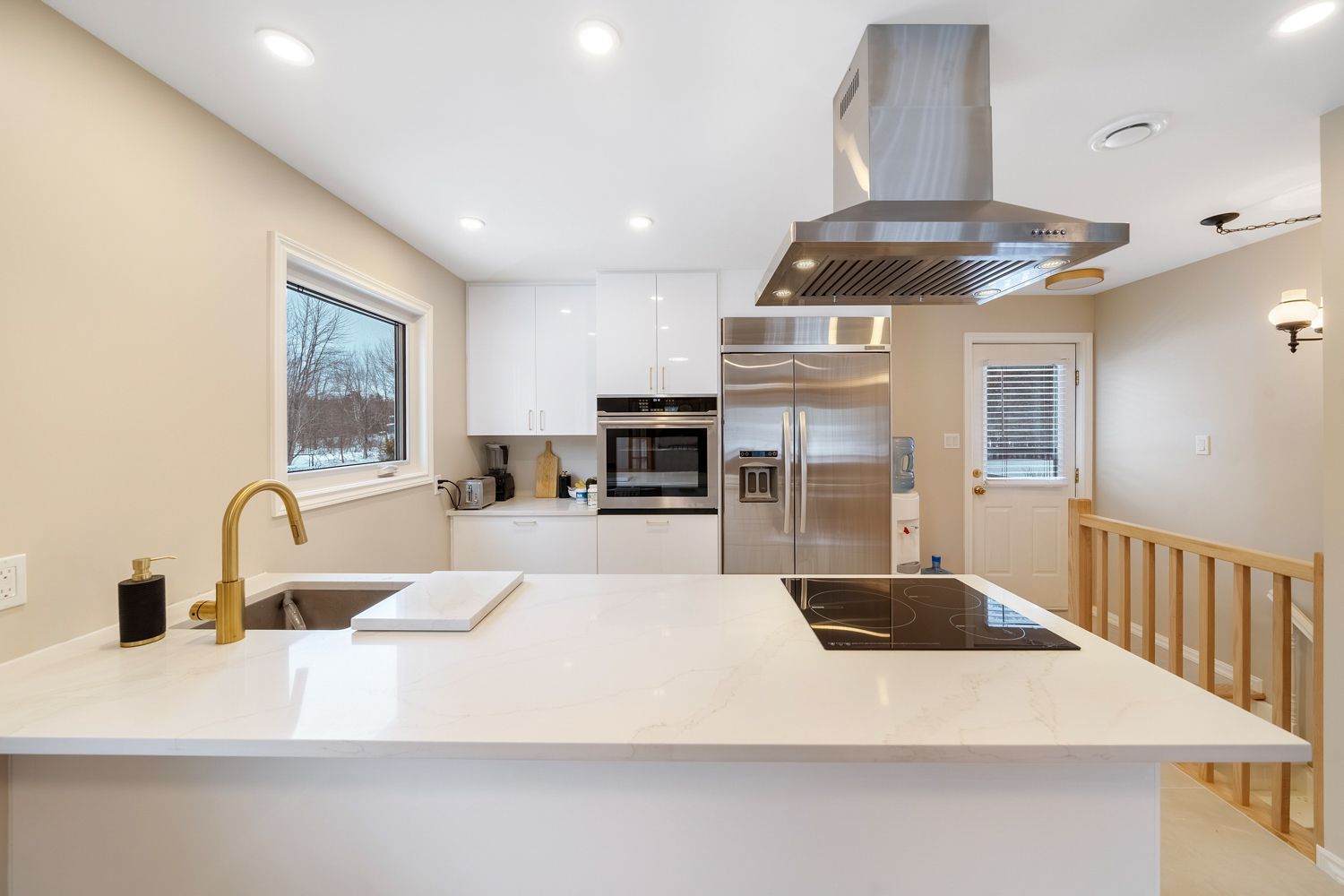 • Modern kitchen with high-end appliances and quartz countertops.