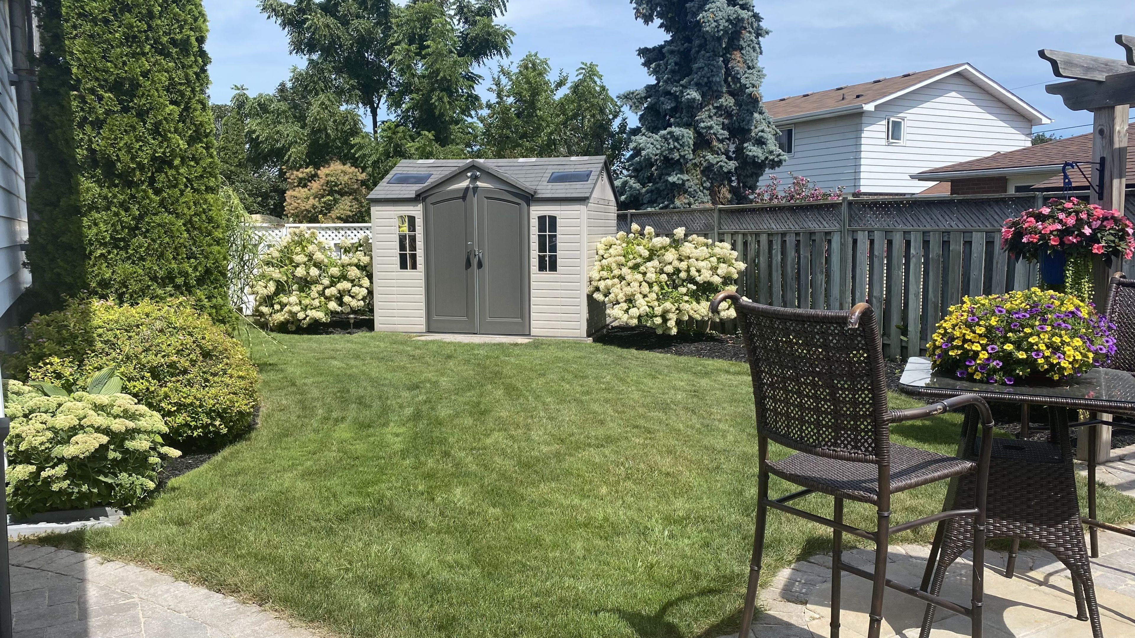 • Beautifully landscaped backyard with a patio and garden shed for relaxation.