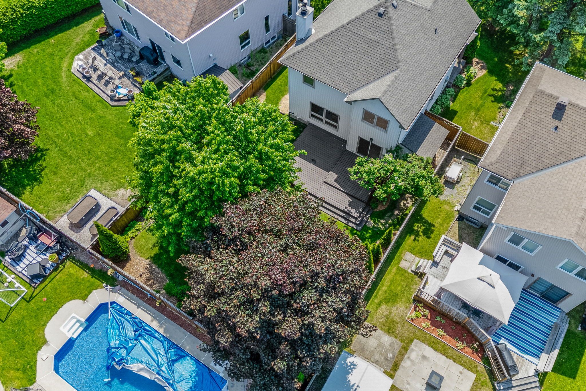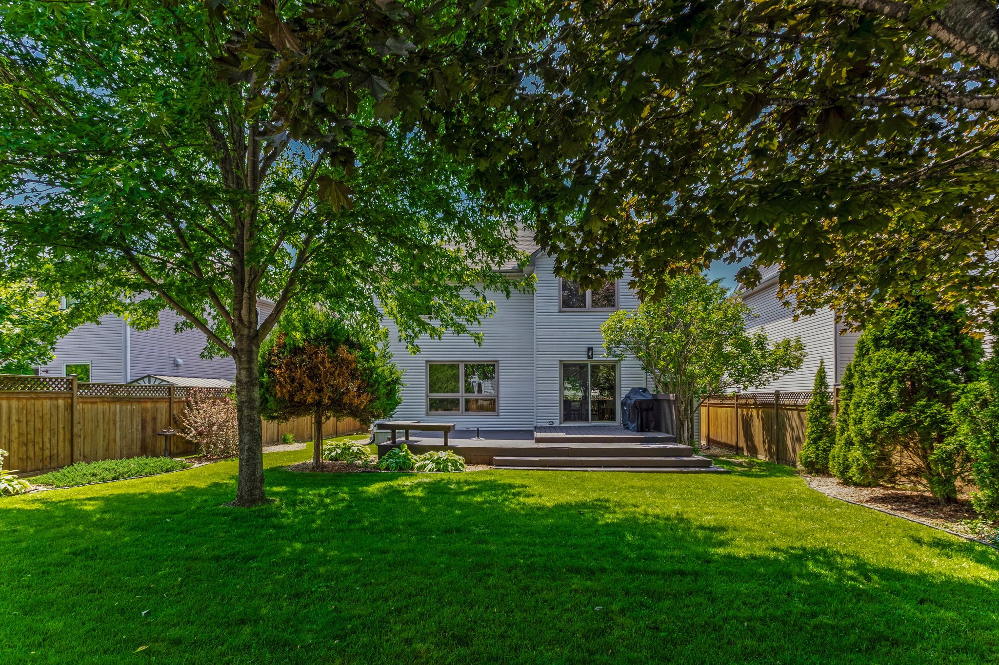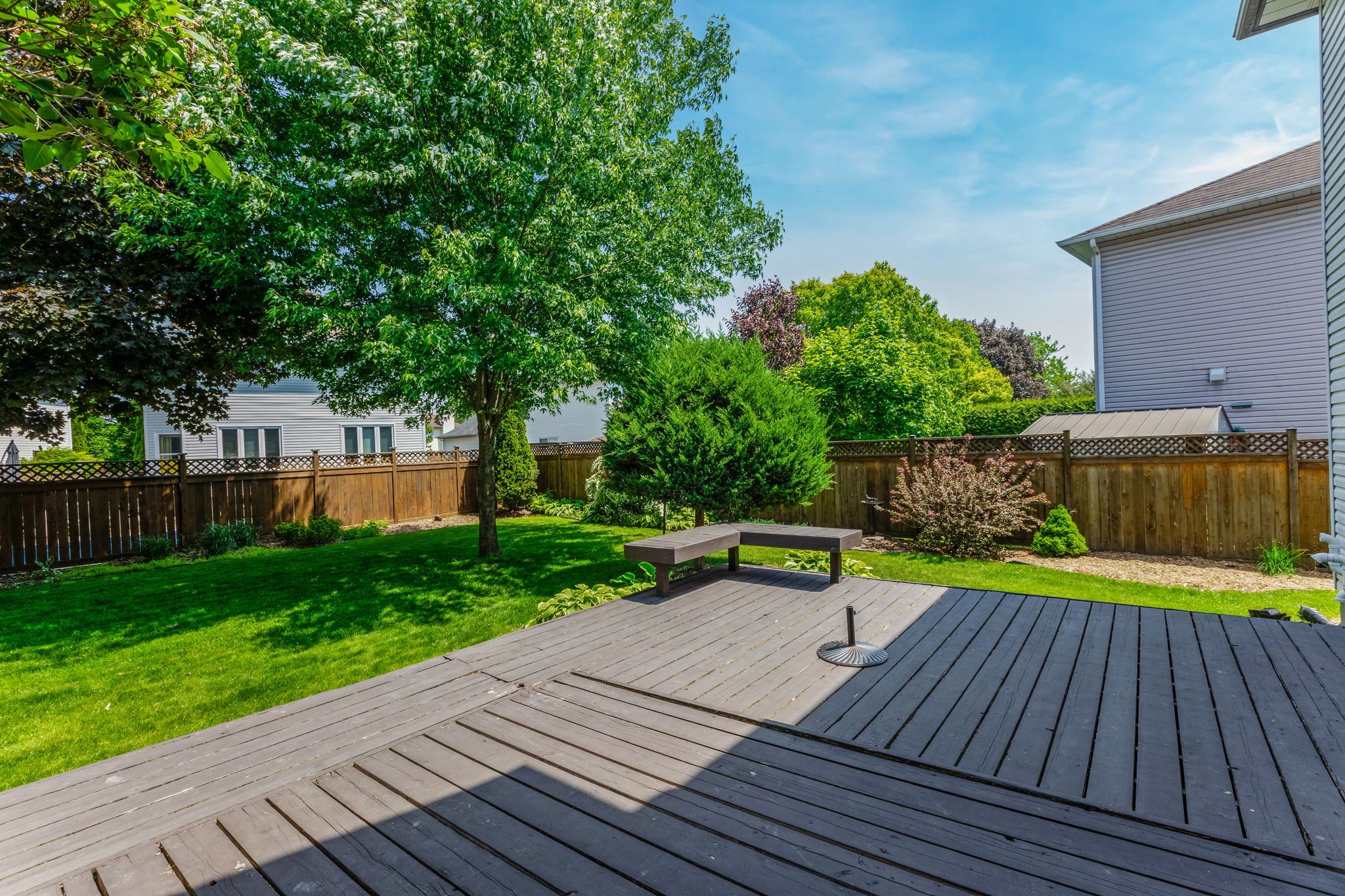 • Oversized backyard deck surrounded by mature trees for privacy and shade.