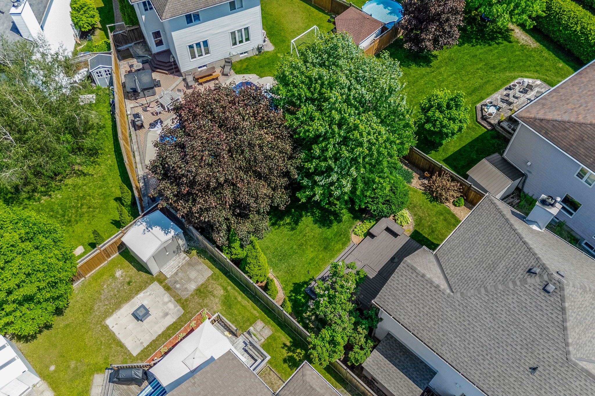 • Mature trees in the backyard provide shade and privacy for relaxation.