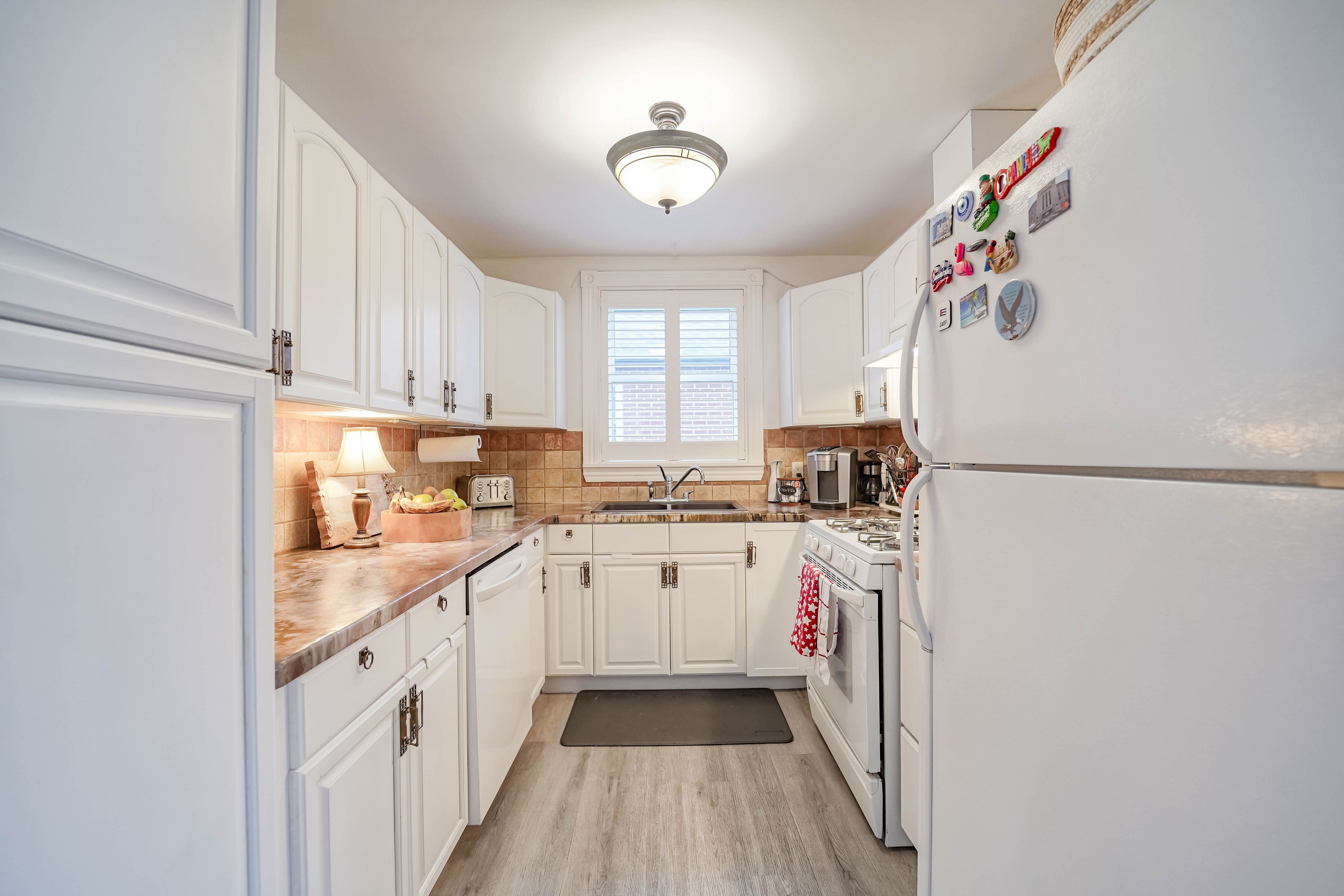 • Functional kitchen with ample cabinetry and workspace for cooking.