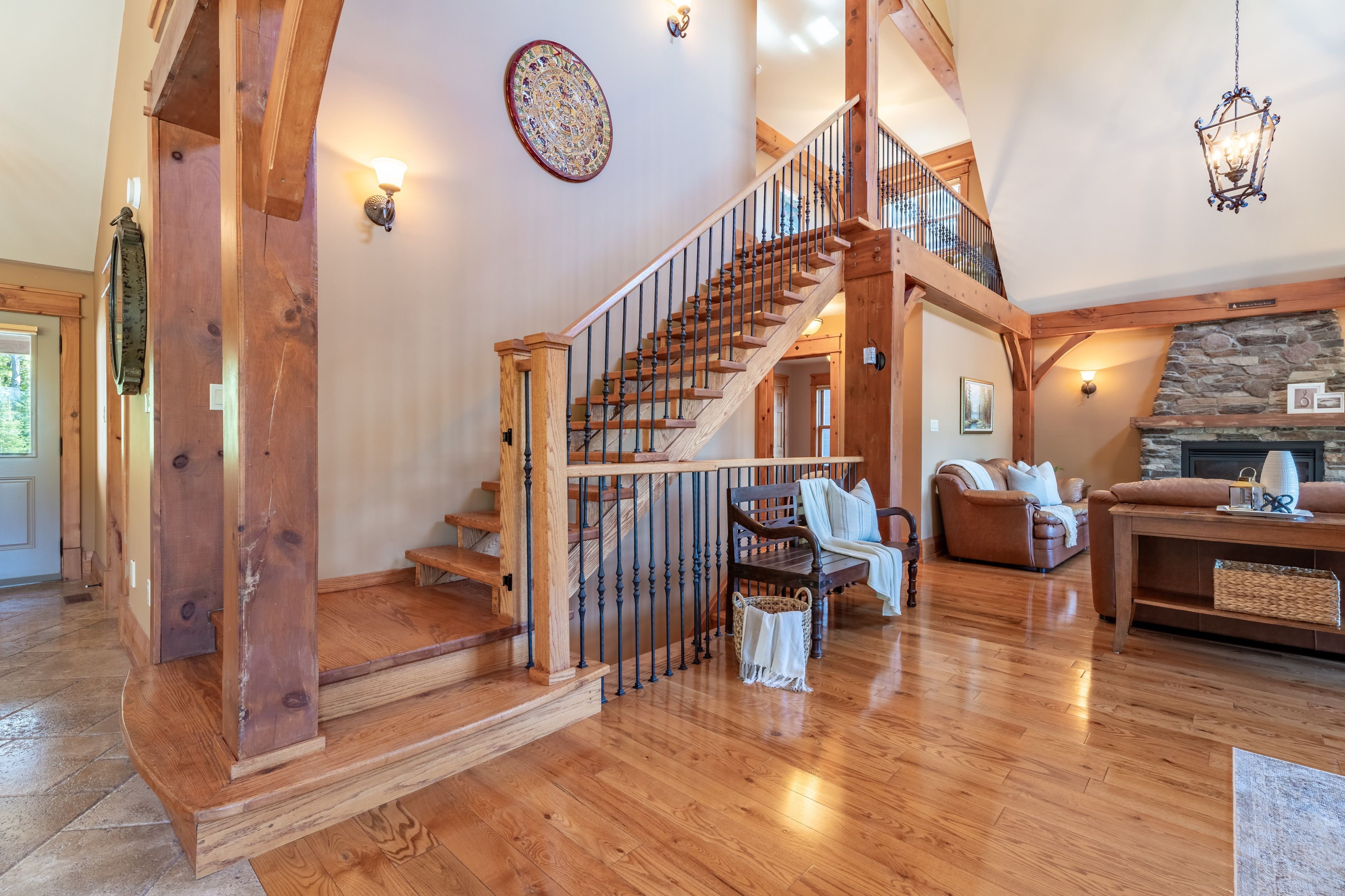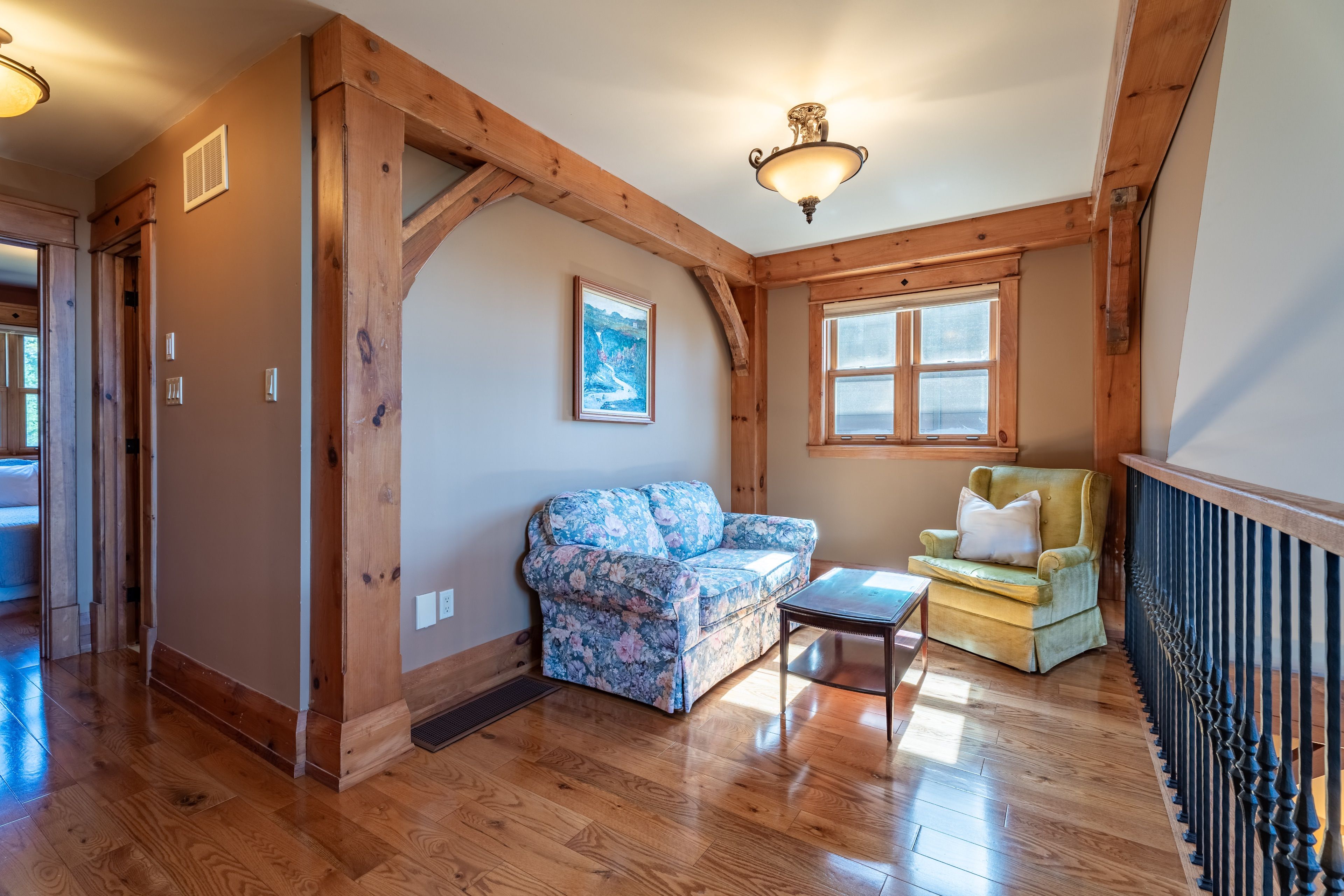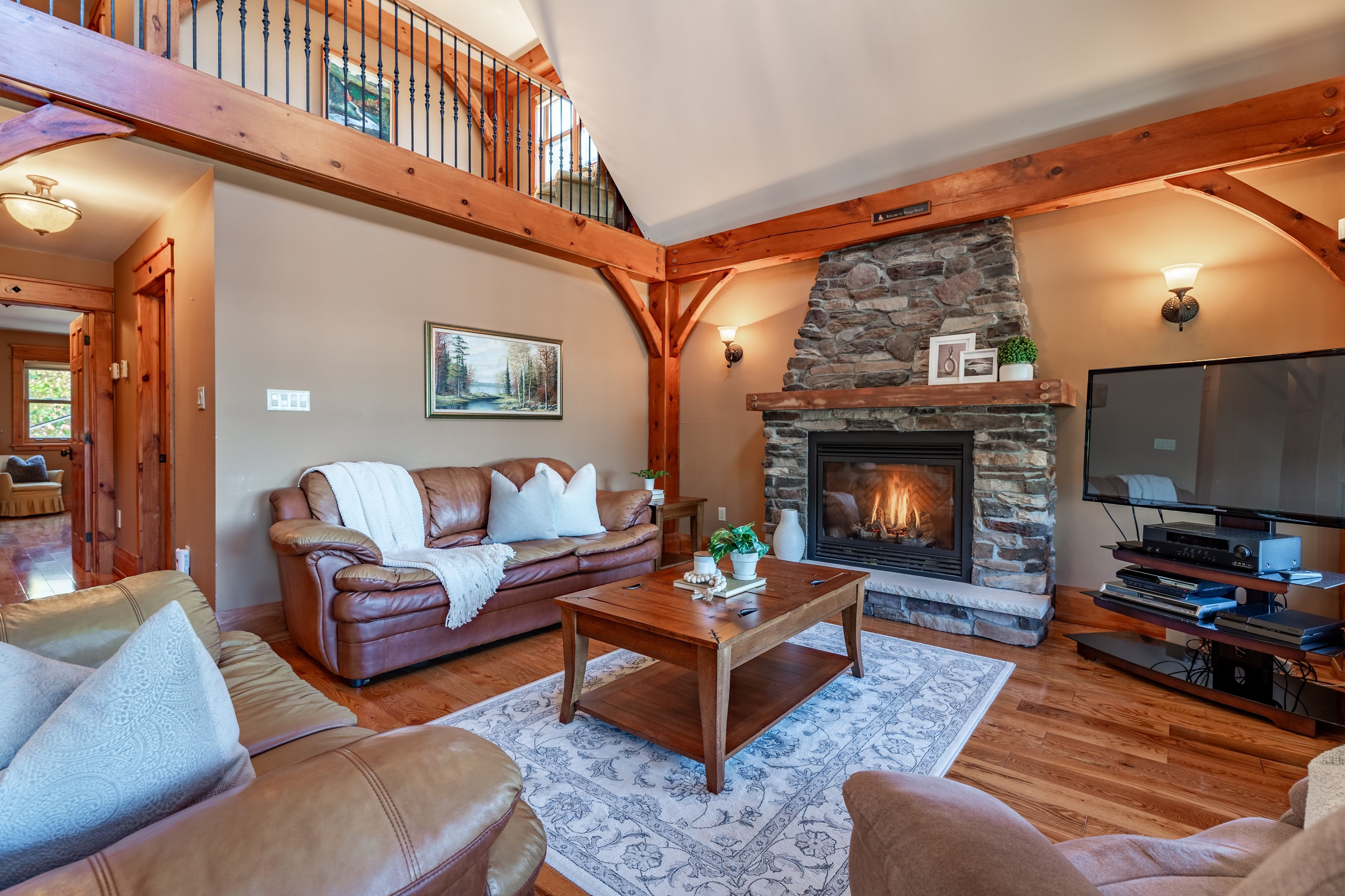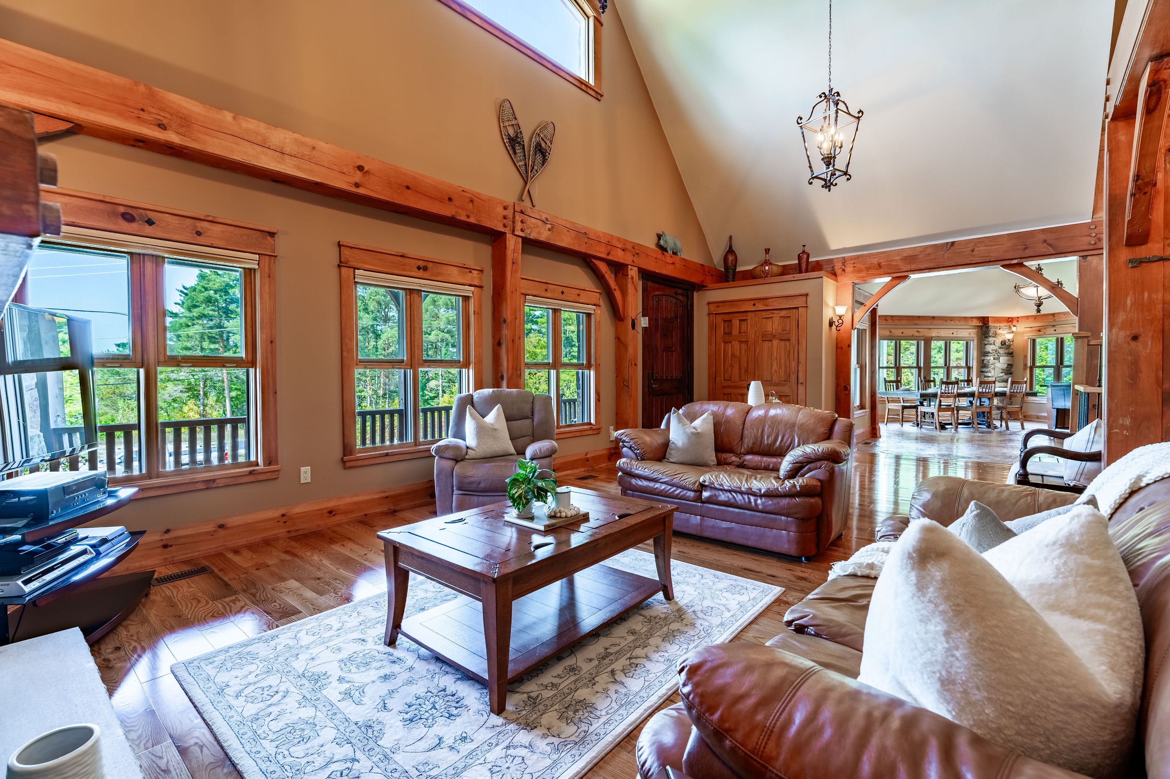 • Open living space with 23-foot pine-beamed ceilings and natural light.