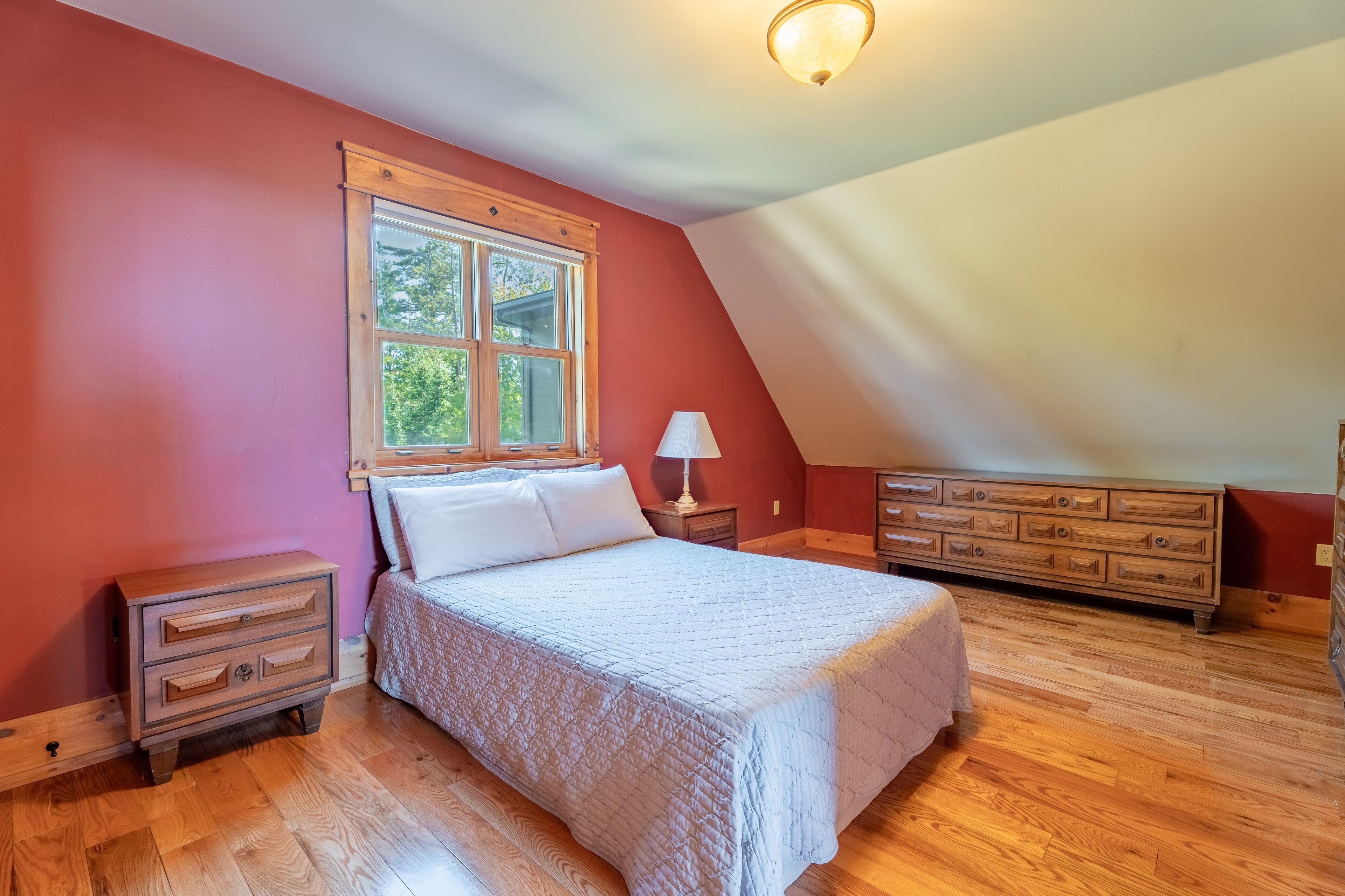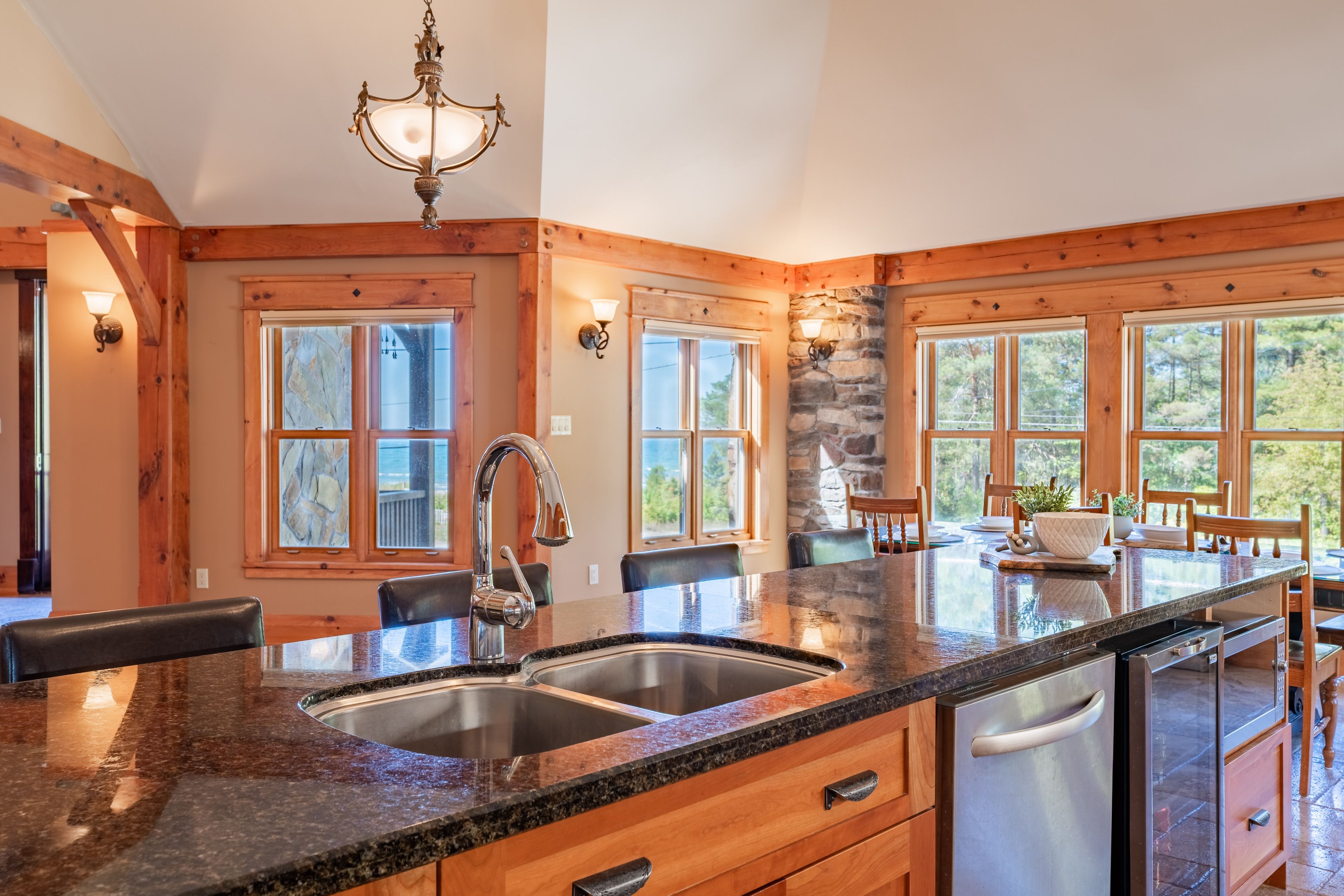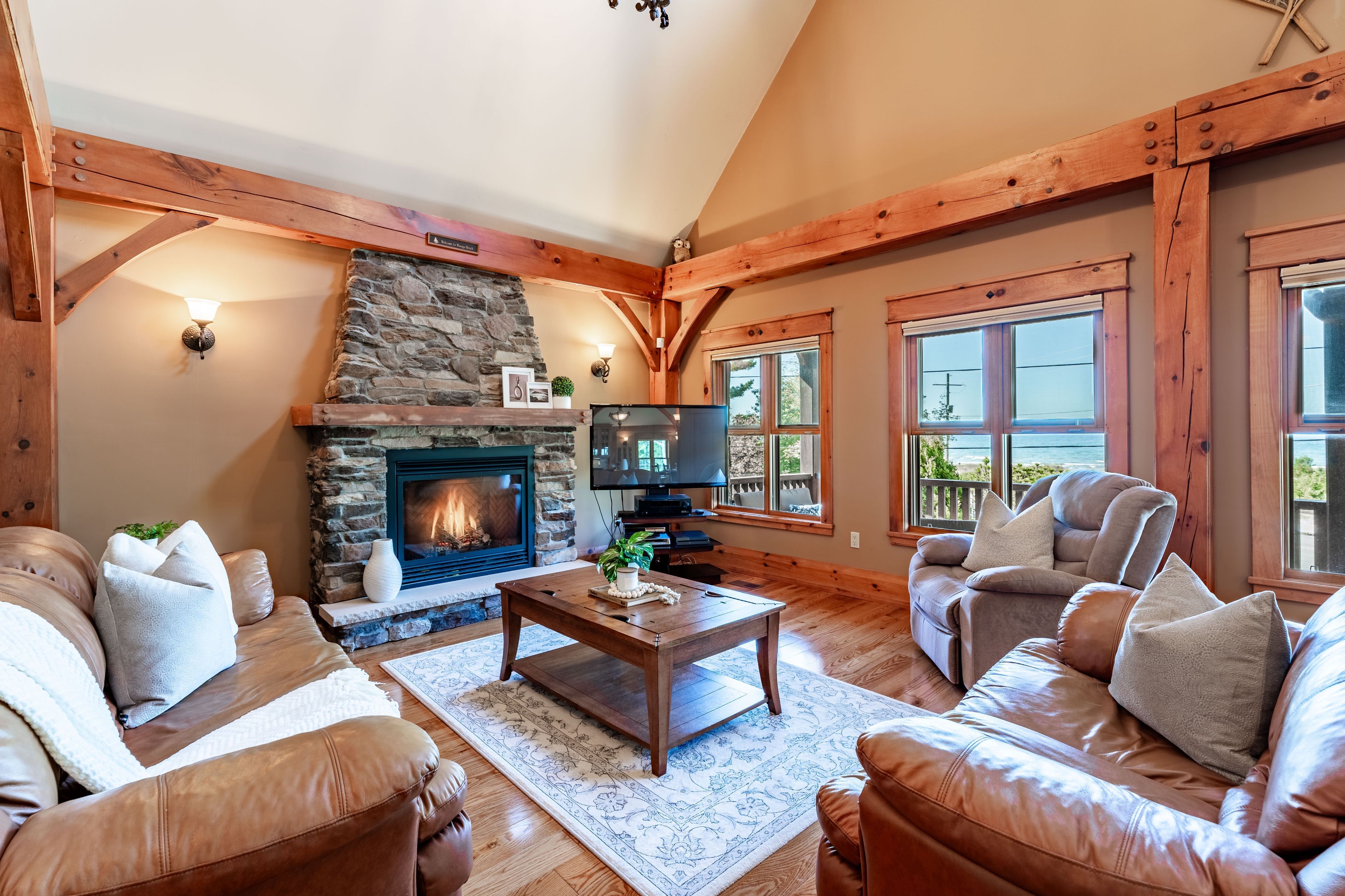 • Open living space with 23-foot pine-beamed ceilings and natural light.