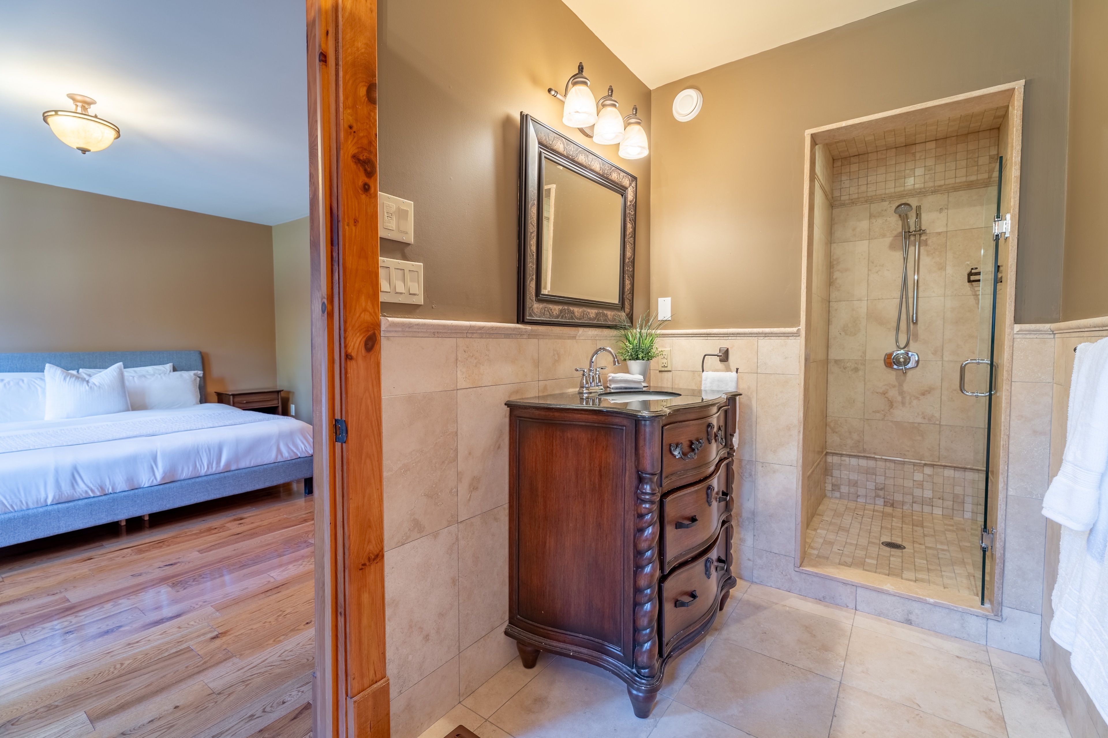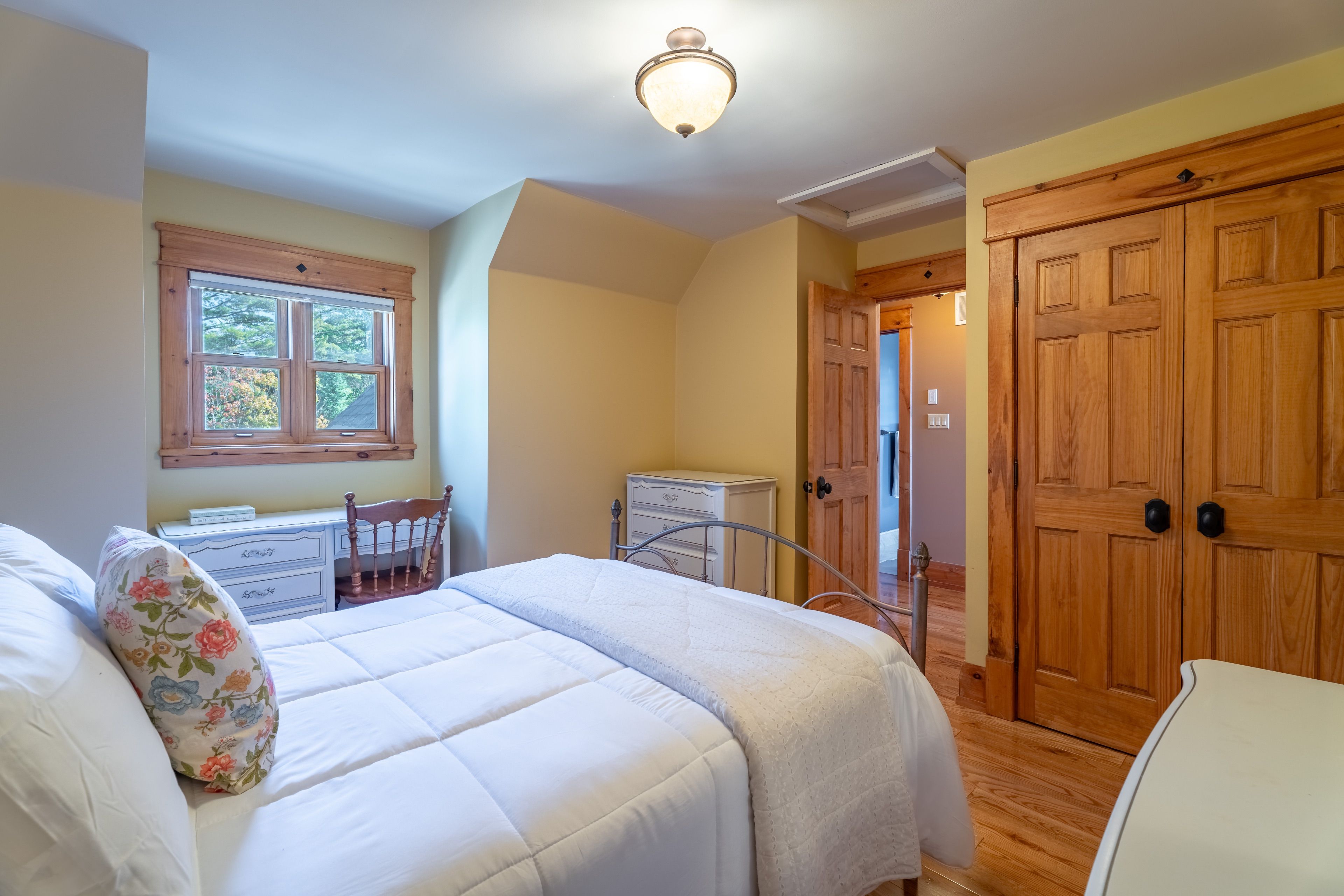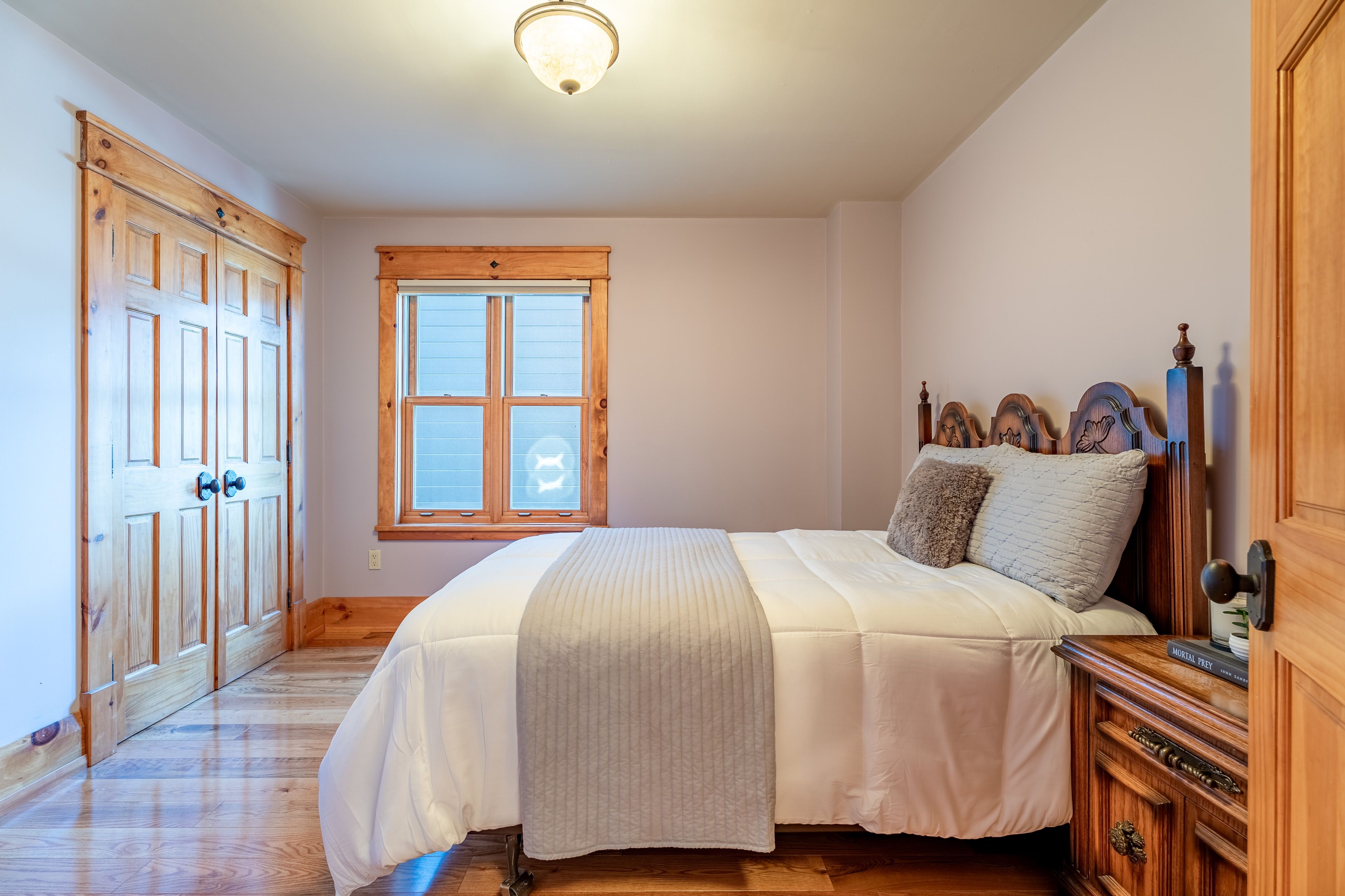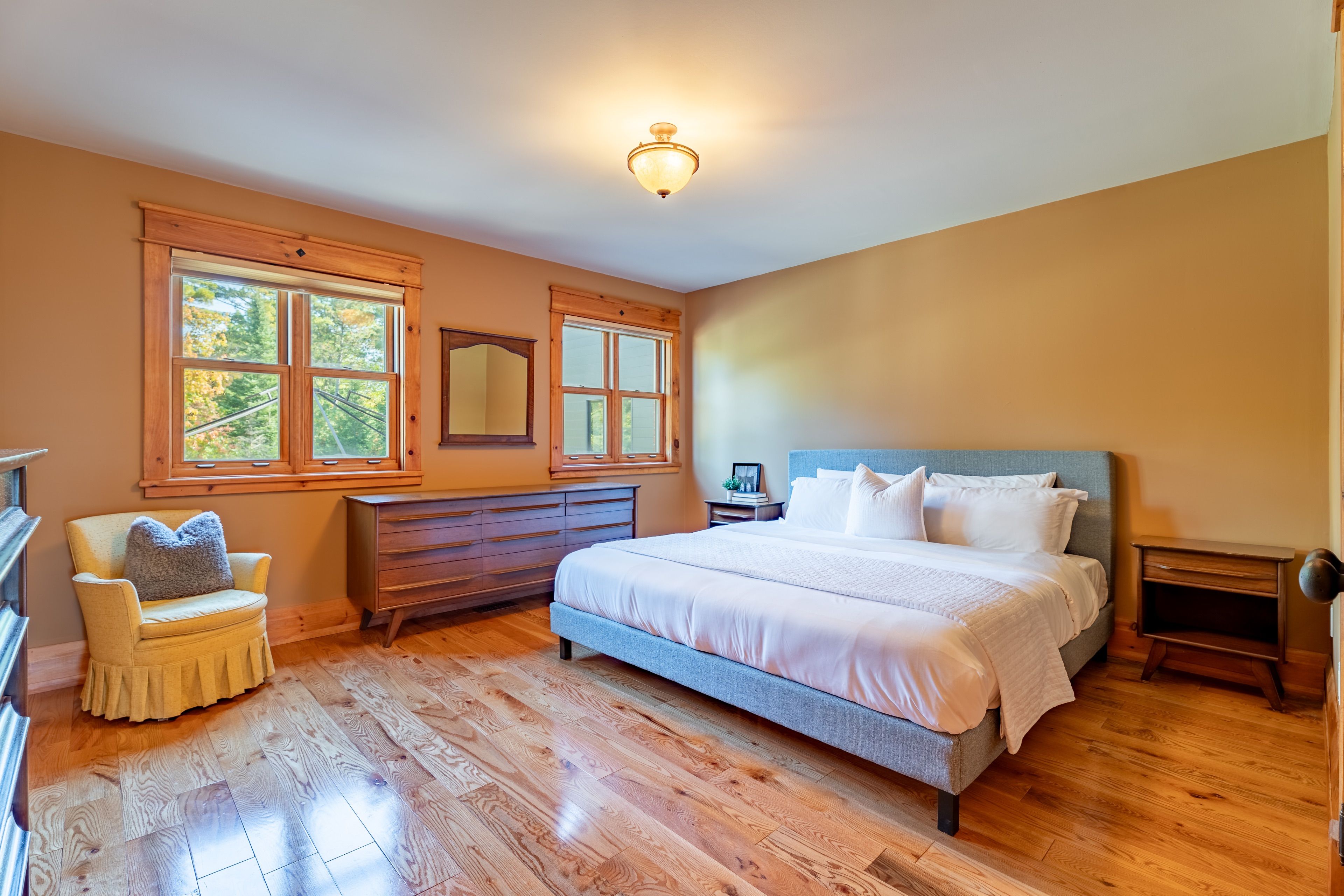 • Open living space with 23-foot pine-beamed ceilings and natural light.
