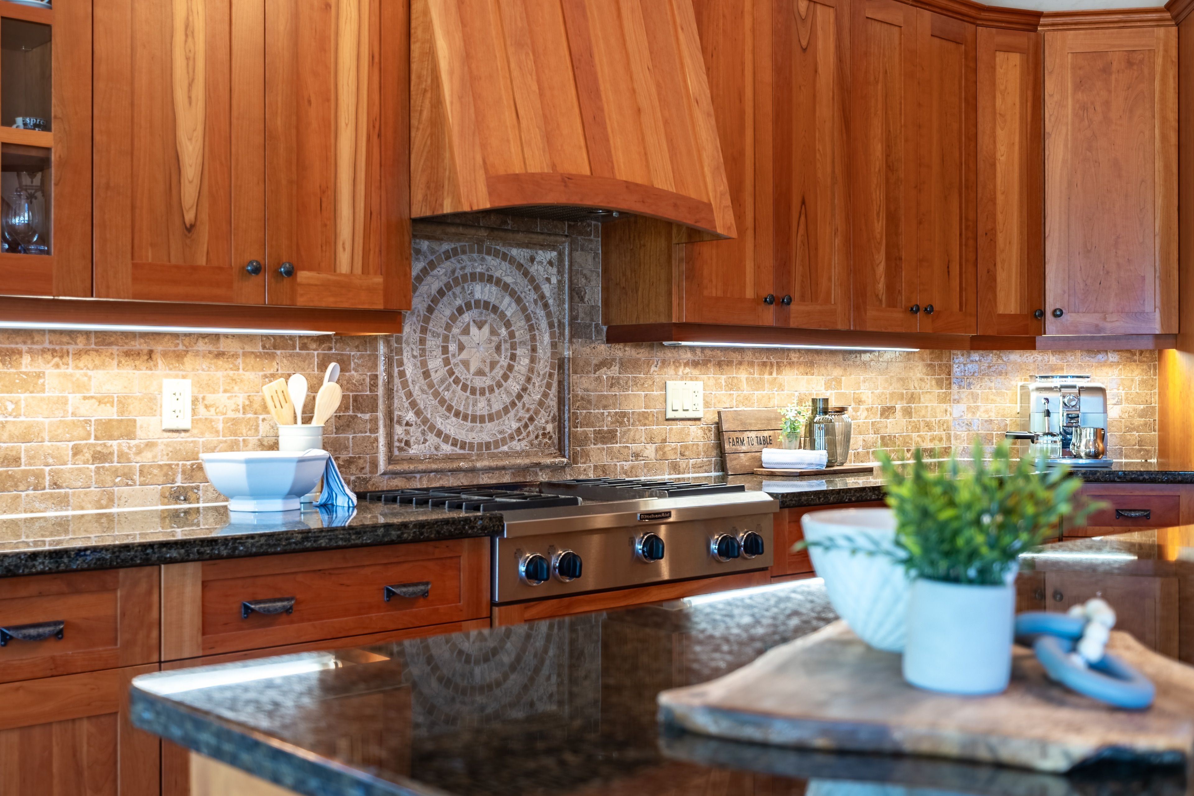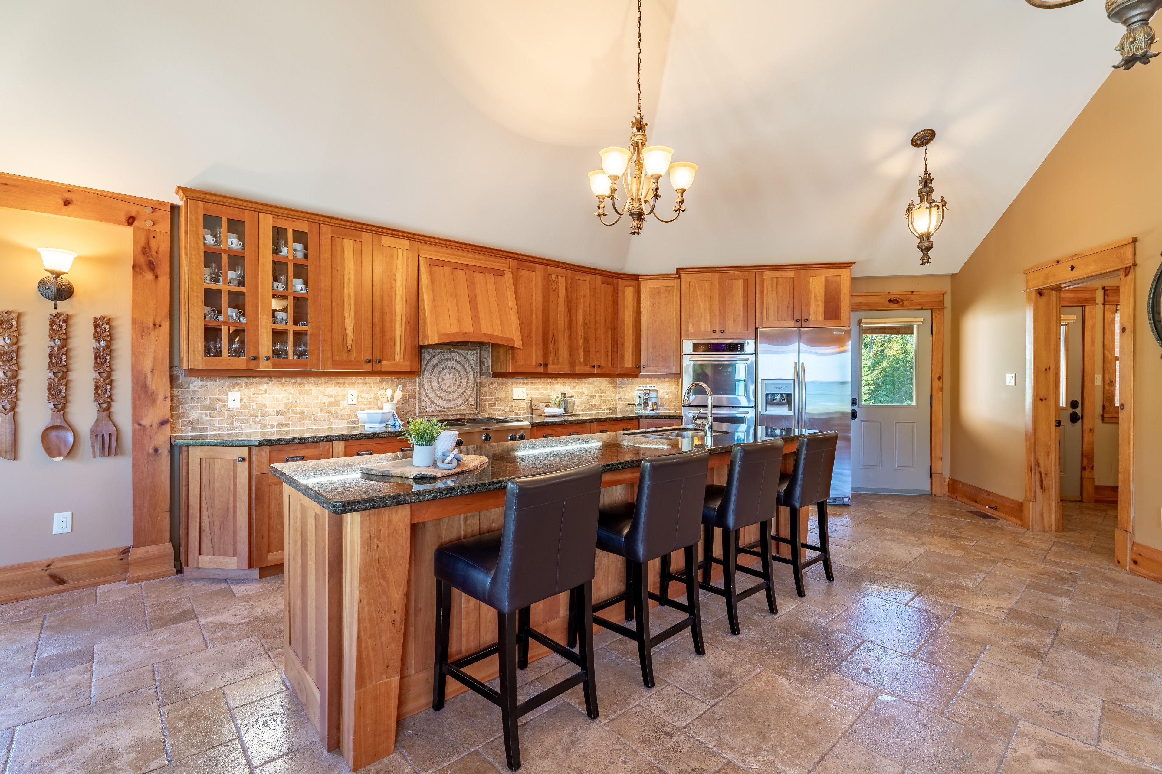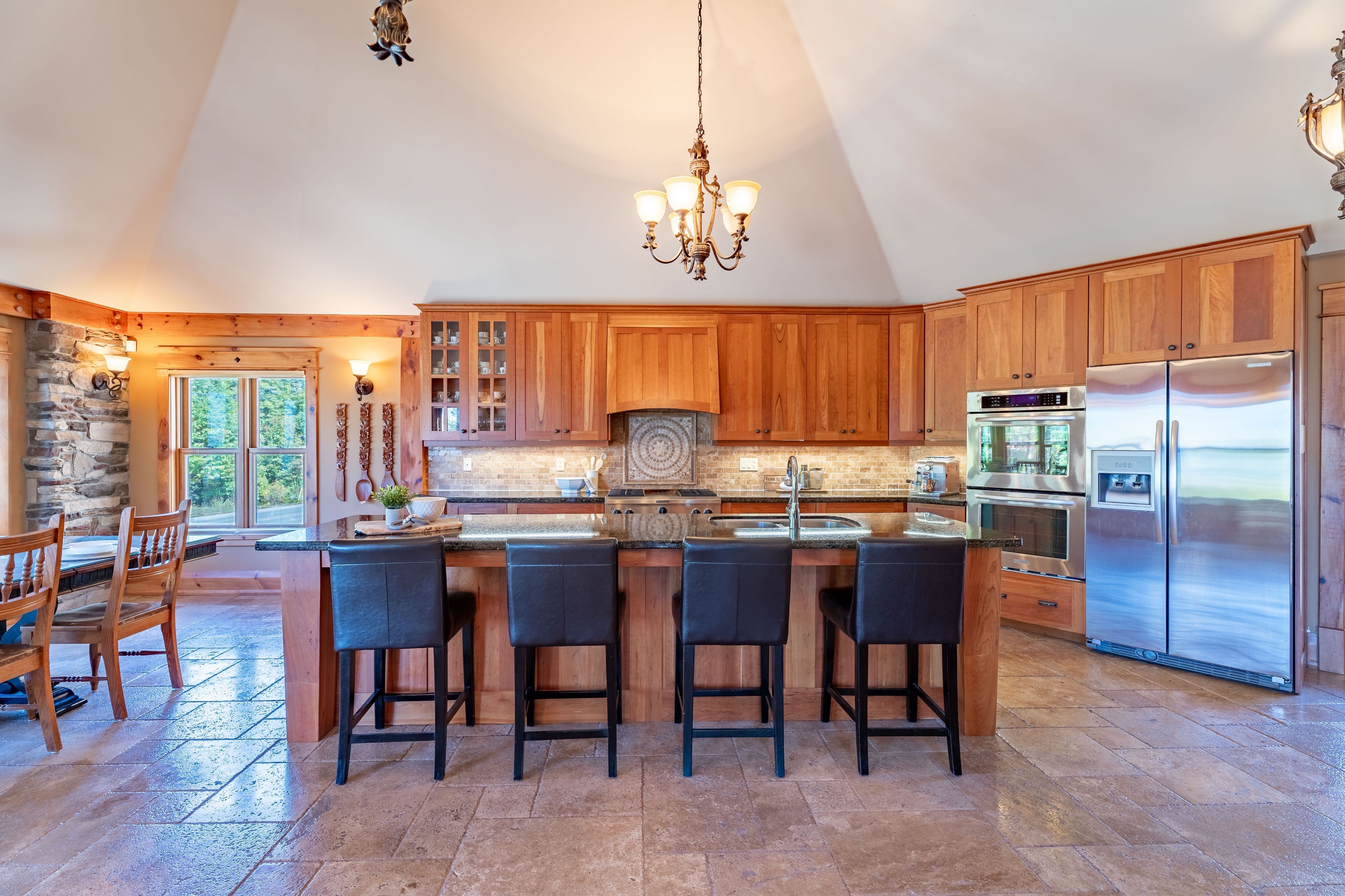 • Impressive chef's kitchen featuring a large granite island and premium appliances.
