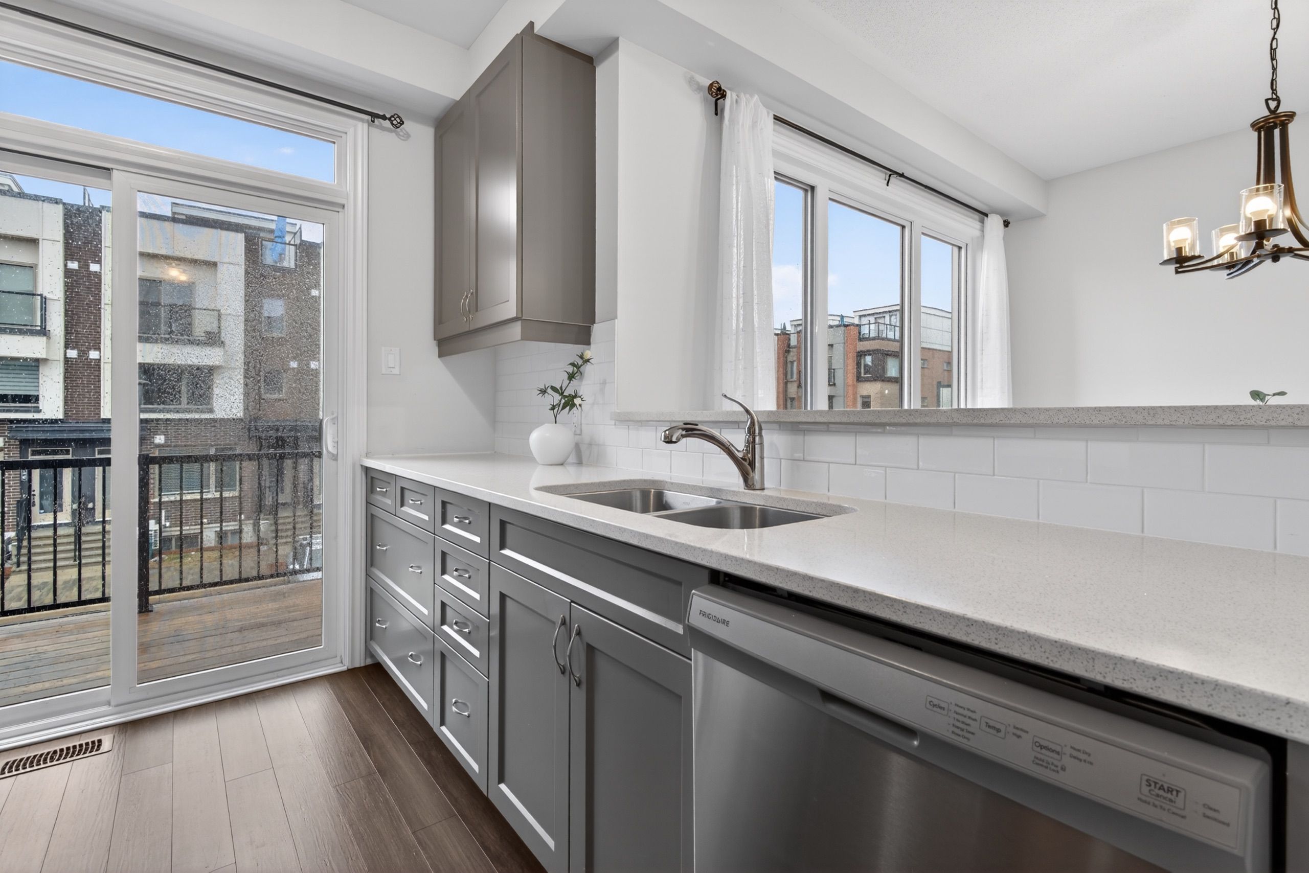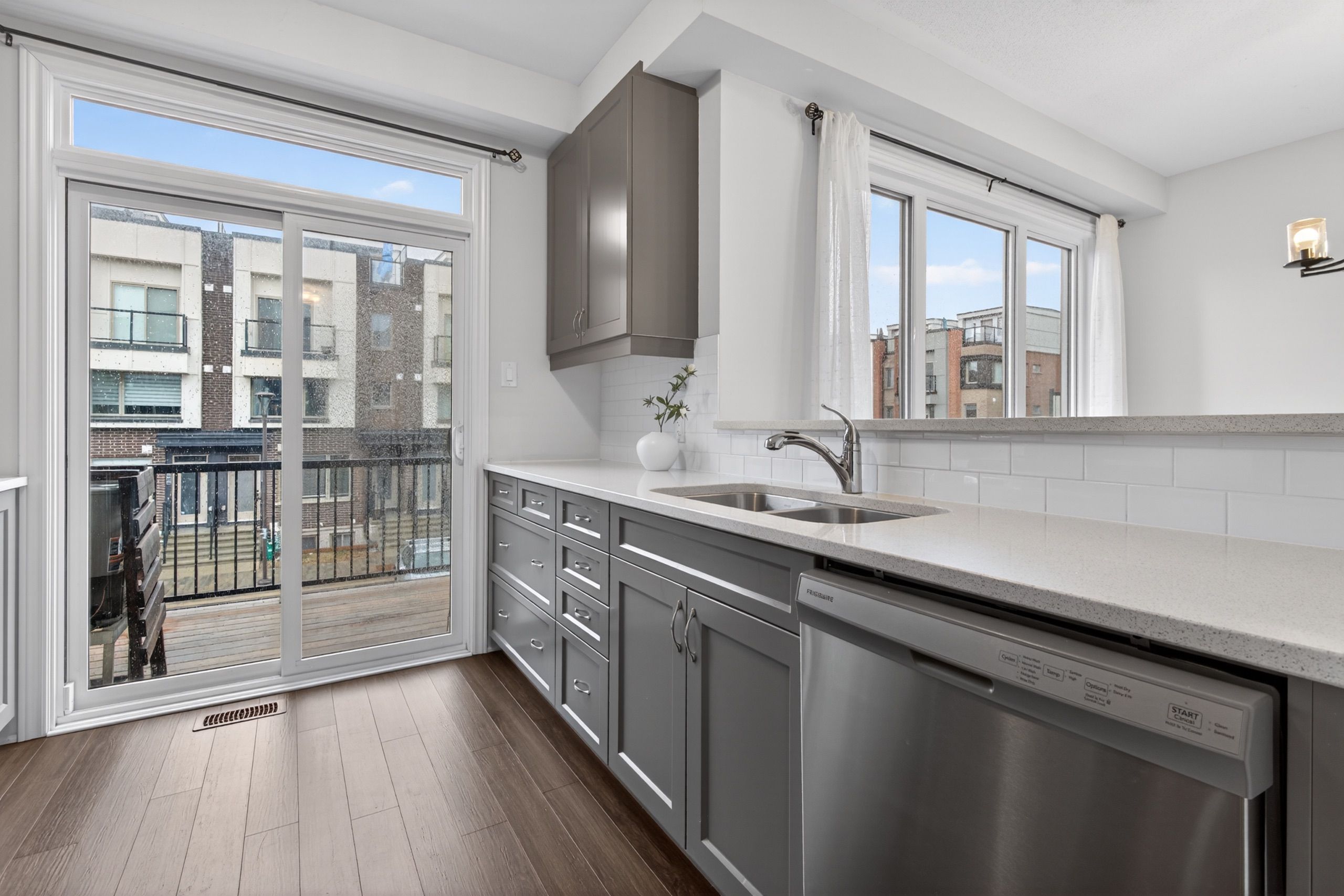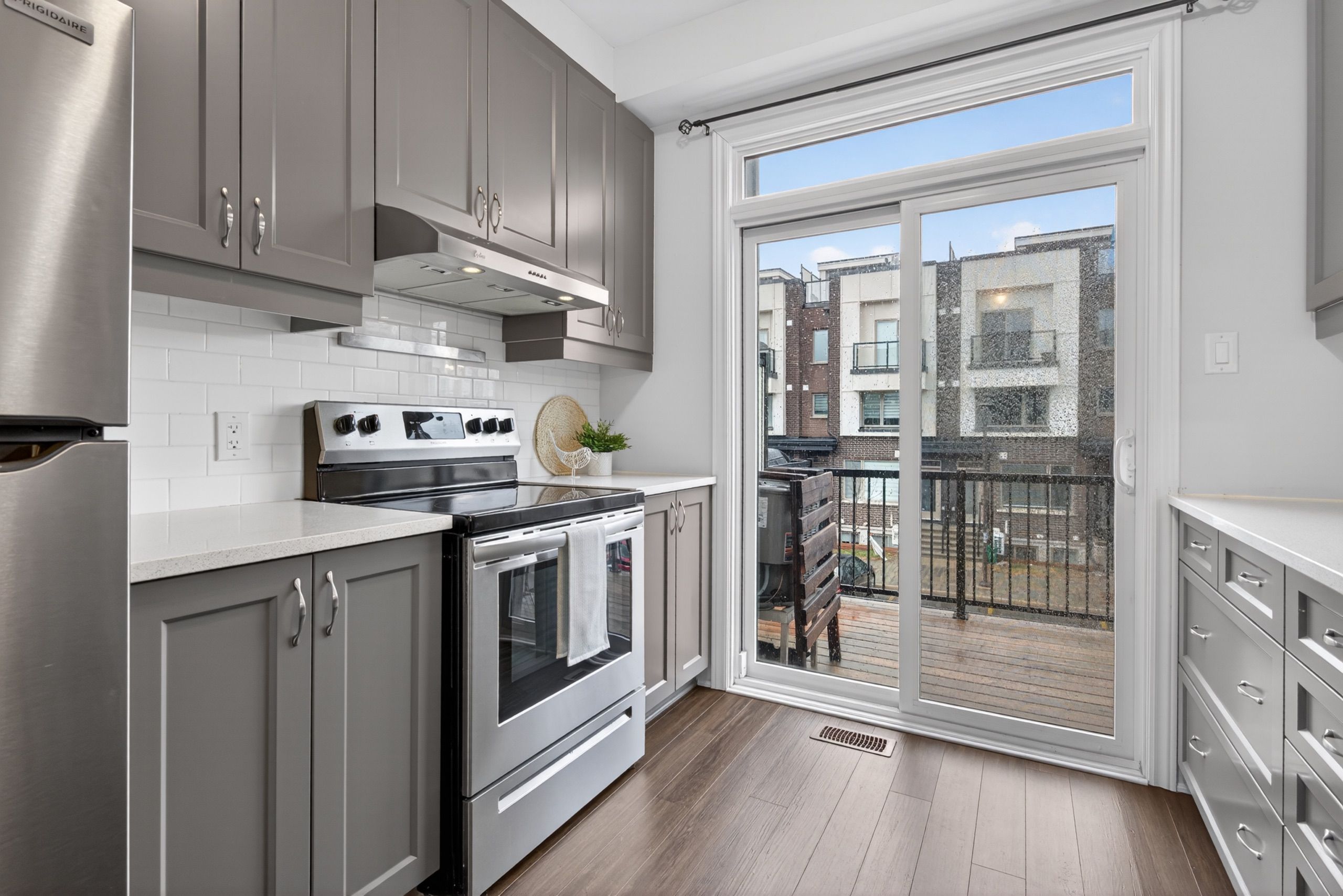 • Contemporary kitchen featuring quartz countertops and access to a private balcony.