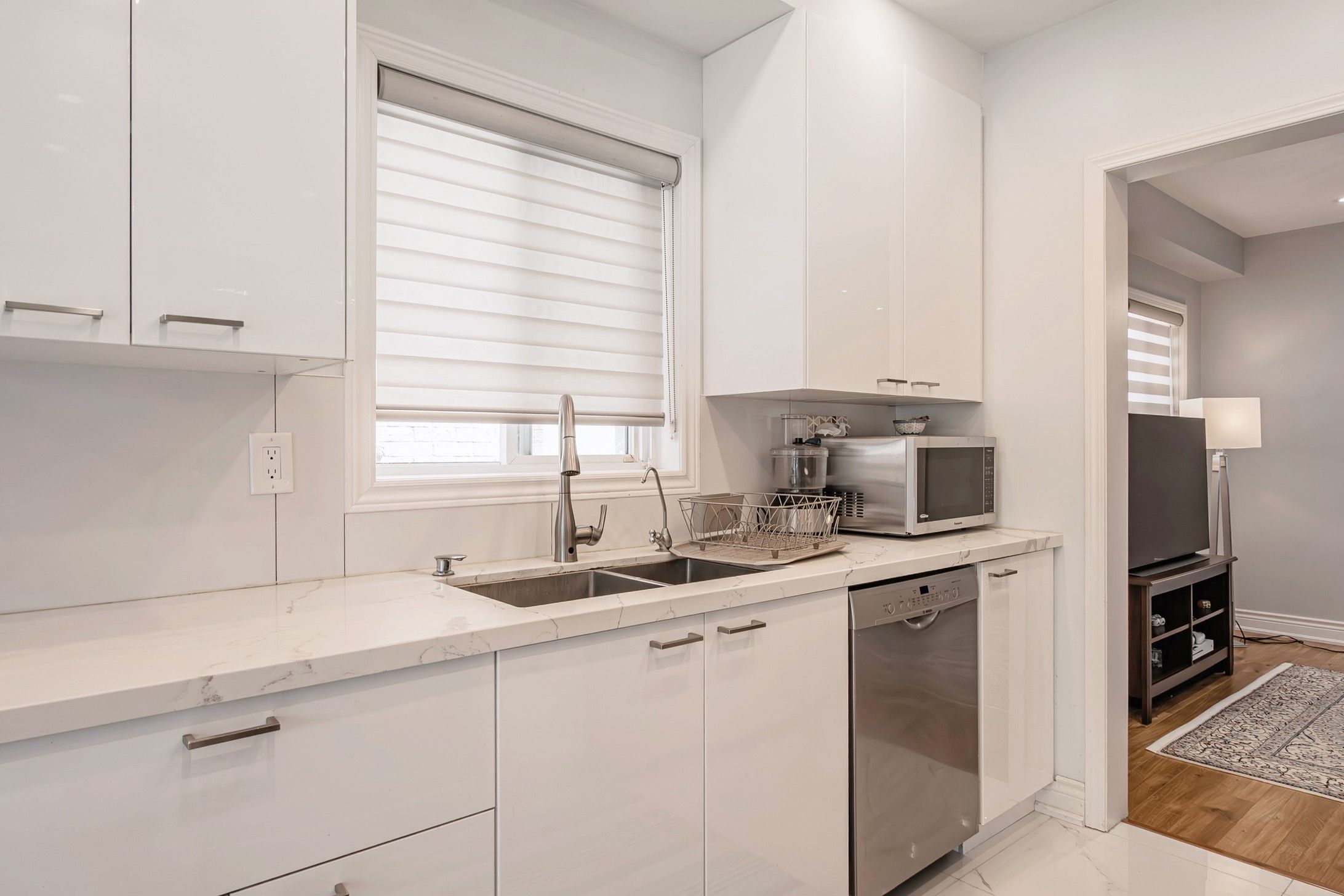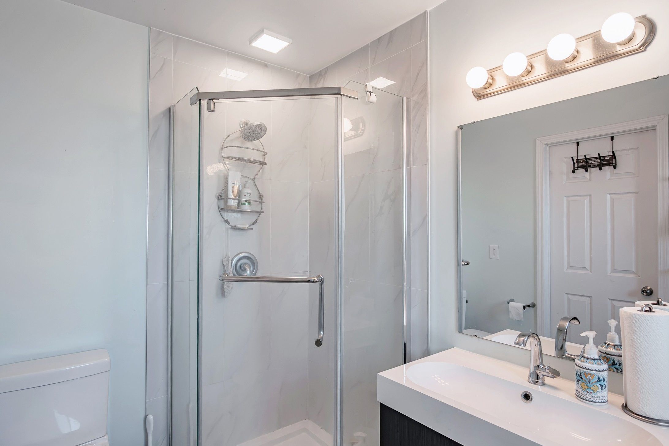 • Stylish updates including porcelain tiles and quartz counters throughout.