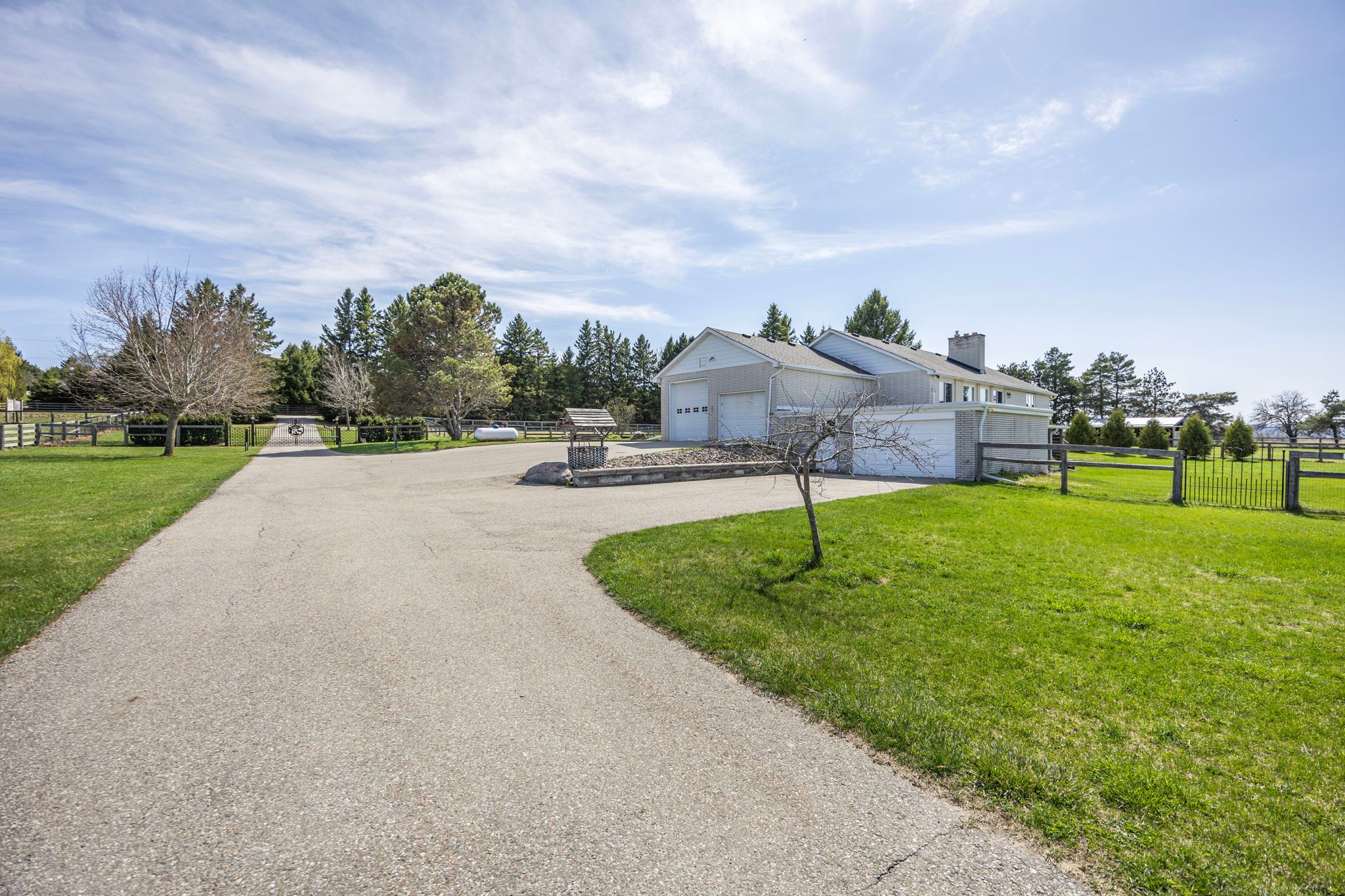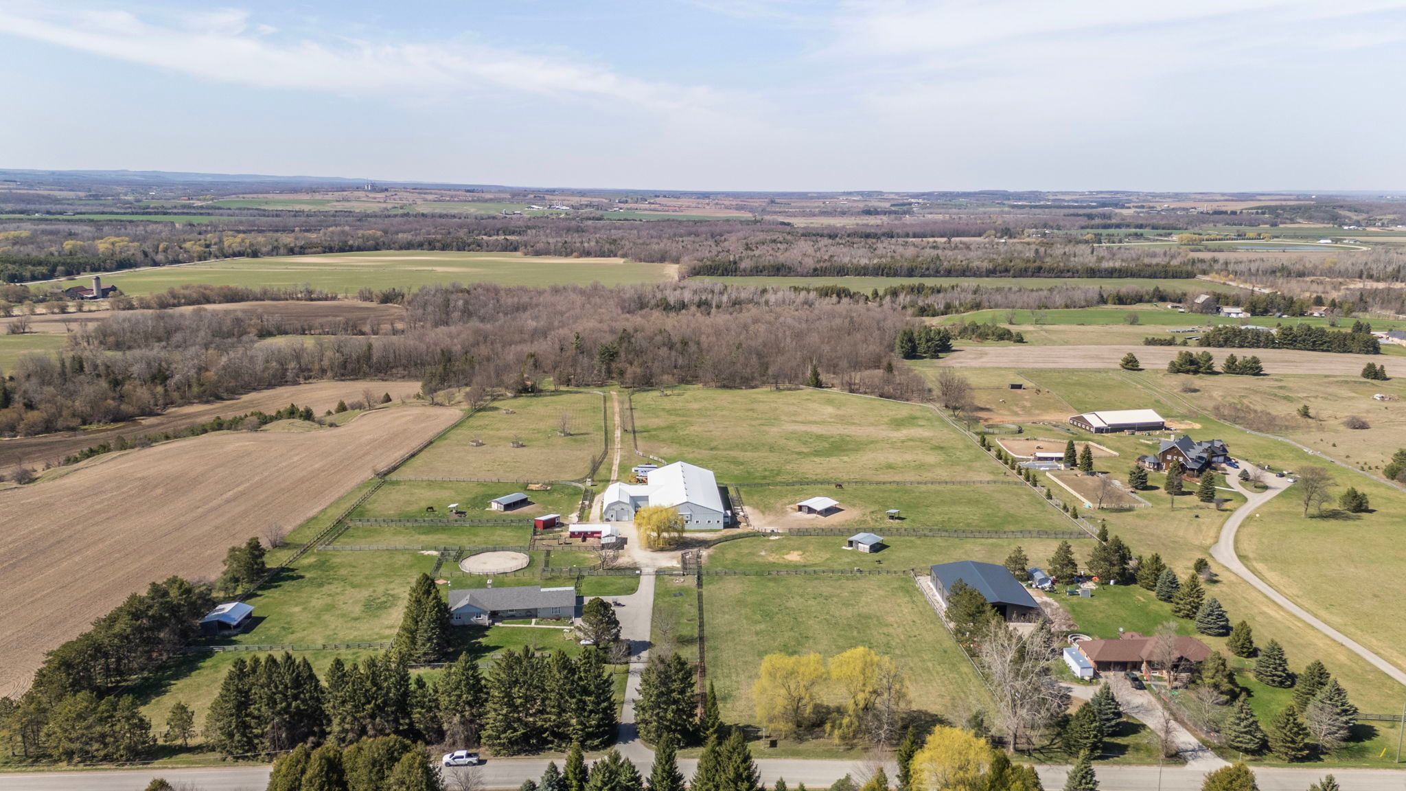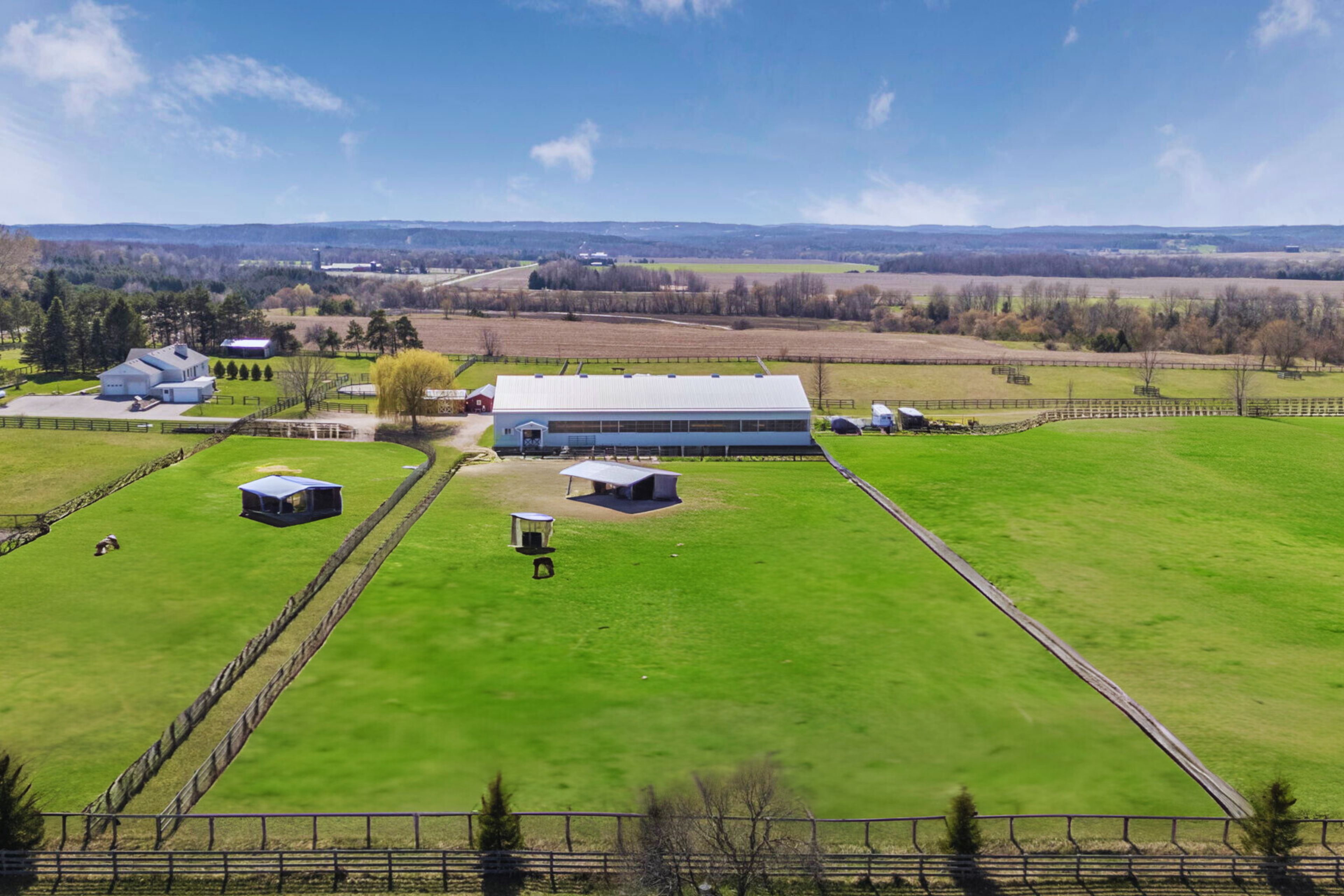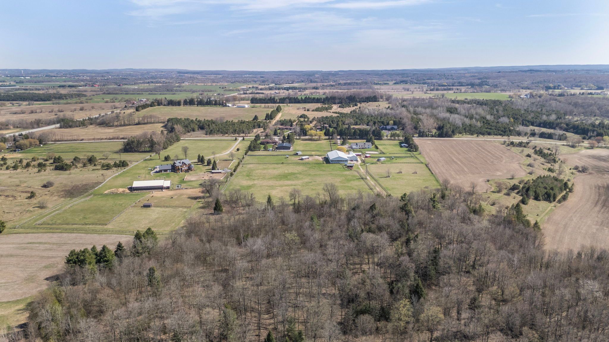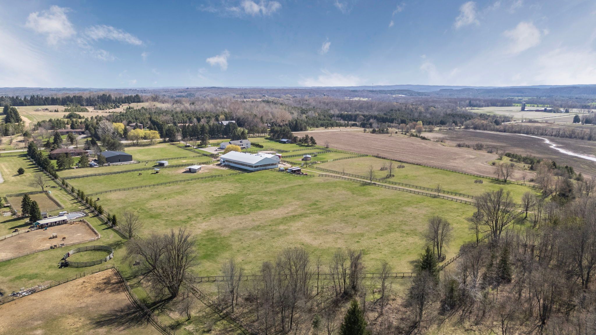 Set behind gates on 21. 62 pristine acres, this private country estate offers the rare combination of usable land, impressive outbuildings, and a beautifully maintained walk-out bungalow. A property where space, privacy, and lifestyle come together in one remarkable setting. At its heart sits a spacious walk-out bungalow, designed for comfortable living while capturing sweeping views across open fields and surrounding countryside. Thoughtfully positioned within the landscape, the home offers a sense of calm and seclusion-an ideal retreat from the pace of city life while remaining within reach of the greater toronto area. The home is designed with flexibility in mind, featuring a fully finished walk-out lower level with a private suite-style living space, ideal for extended family, guests, or multi-generational living while maintaining privacy and independence. Beyond the residence, the property unfolds into beautifully organized grounds offering exceptional flexibility for recreation, hobbies, and entertaining. A remarkable 120' x 70' indoor arena building with adjoining barn space provides exceptional scale and versatility, ideal for equestrian pursuits, private training, indoor recreation, or a wide range of lifestyle uses rarely found on residential properties. The surrounding acreage includes expansive paddocks, open fields, and approximately 4 acres of mature forest with private trails, perfect for enjoying nature year-round. A substantial 30' x 60' heated workshop further enhances the estate, complete with a kitchen, lounge, and bathroom-ideal for guests, creative studio space, or a variety of personal or professional uses. Additional fenced areas for small animals add to the property's authentic country charm. A property that offers the freedom to create the lifestyle you've been dreaming about. Properties offering this level of usable acreage, and exceptional privacy rarely come to market in such a beautifully maintained setting.