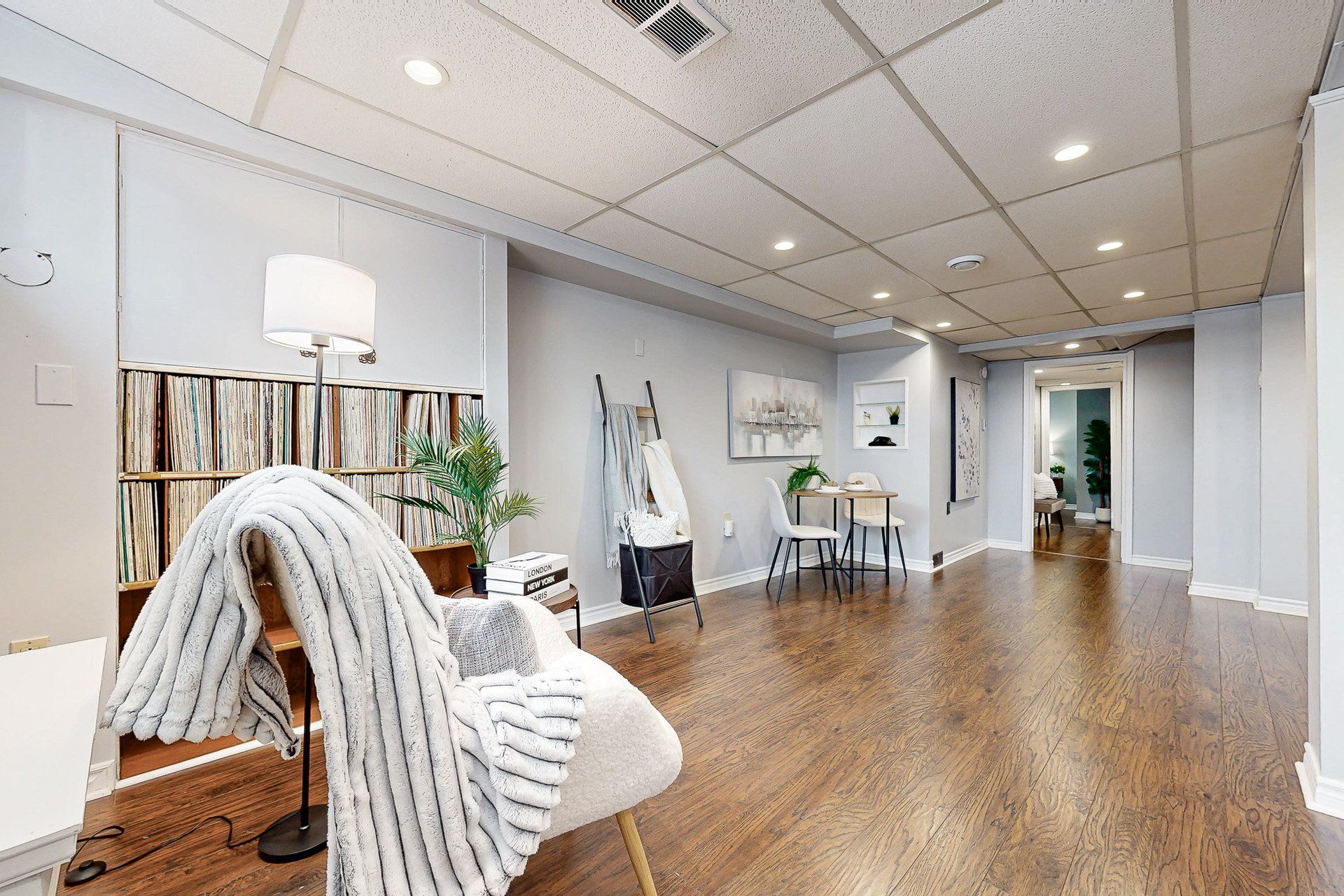 • Fully finished basement with recreation room, gas fireplace, and wet bar.