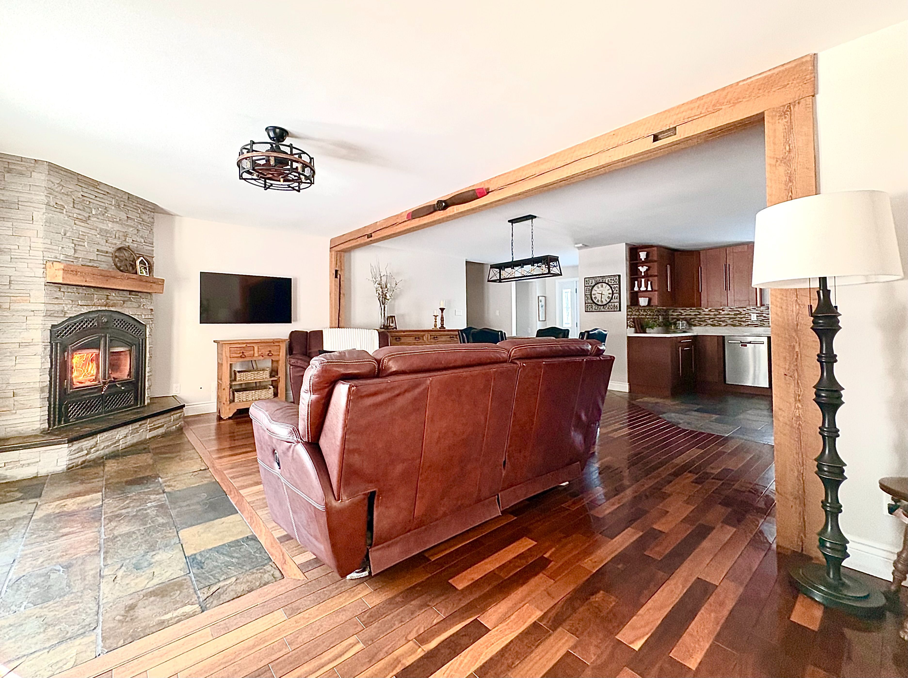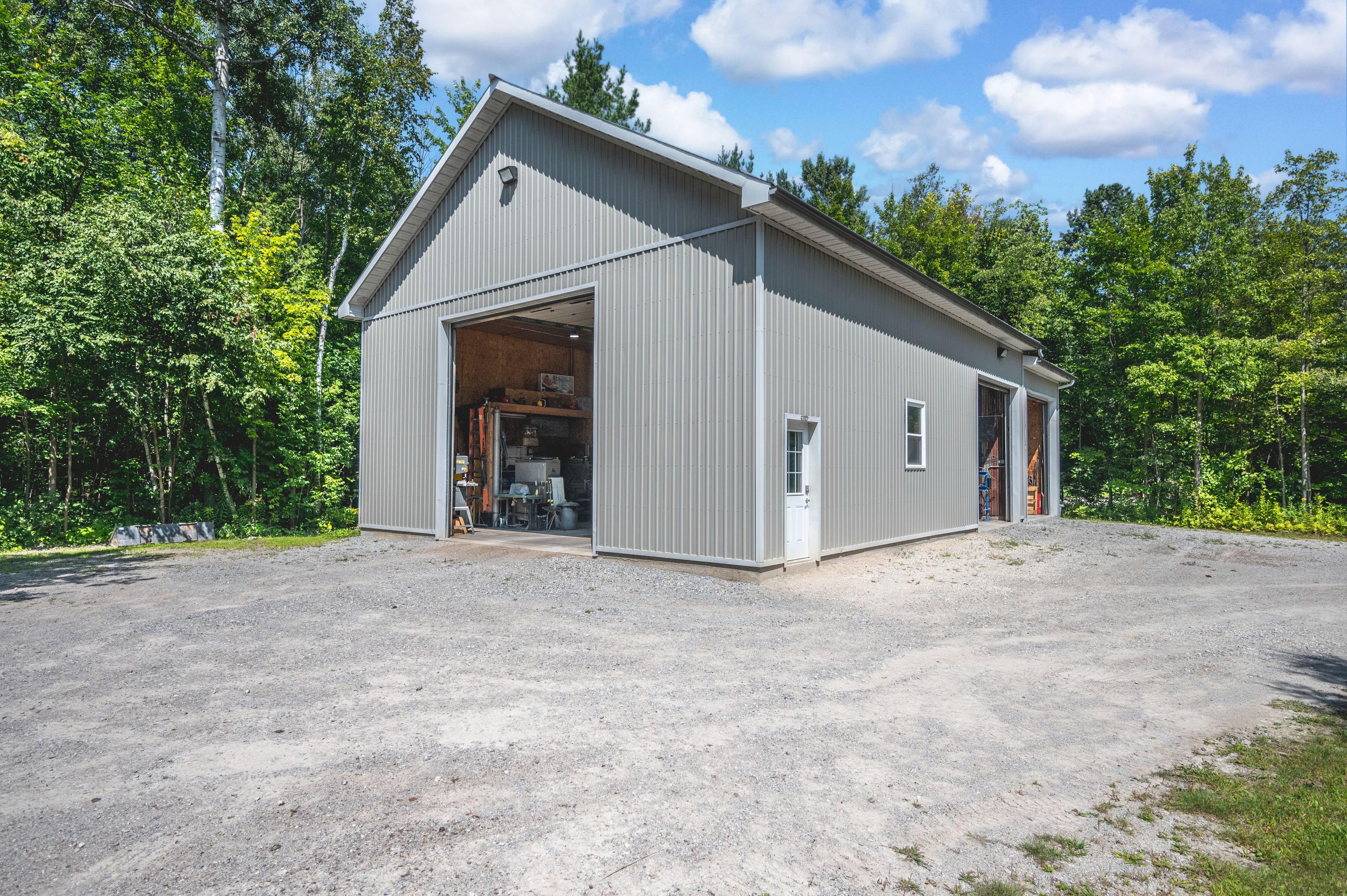 Escape to the country - oversized garage, backyard oasis and multi family potential all in one rural retreat. Welcome to this inviting 3+1 bedroom home on 1. 98 acres. Where comfort, space and lifestyle come together. Nestled on a private lot, this inviting home offers the tranquility of the country, with easy access to nearby amenities. An excellent opportunity for hobby enthusiasts and home based business owners, this property features an extra-large professional workshop with an engineered concrete slab floor, steel siding and roof, and there large garage doors designed to accommodate equipment and vehicles of all sizes. Beautifully renovated, this home radiates warmth and attention to detail in the finishes, including hardwood floors, rustic beams and napoleon wood burning fireplace with stone accent and wood beam mantle. The welcoming open concept design on the main floor features a kitchen with beautiful cabinetry and quartz countertop with a sleek style backsplash, stainless steel appliances and a cozy coffee bar. Dining and living room features hardwood and slate floors that flow naturally to the gorgeous back yard patio perfect for relaxing and entertaining. The fully fenced backyard showcases an extra large interlock patio and a 20 x 12 salt water pool with a custom waterfall and a mennonite built garden shed with steel roof. The inviting primary bedroom feature hardwood floor, two large double closets with custom organizers. Newly renovated ensuite bathroom features a quartz topped vanity and customized glass and tile shower. The recently renovated basement offers additional living space with endless possibilities. Privacy, style and attention to detail, your dream home awaits.