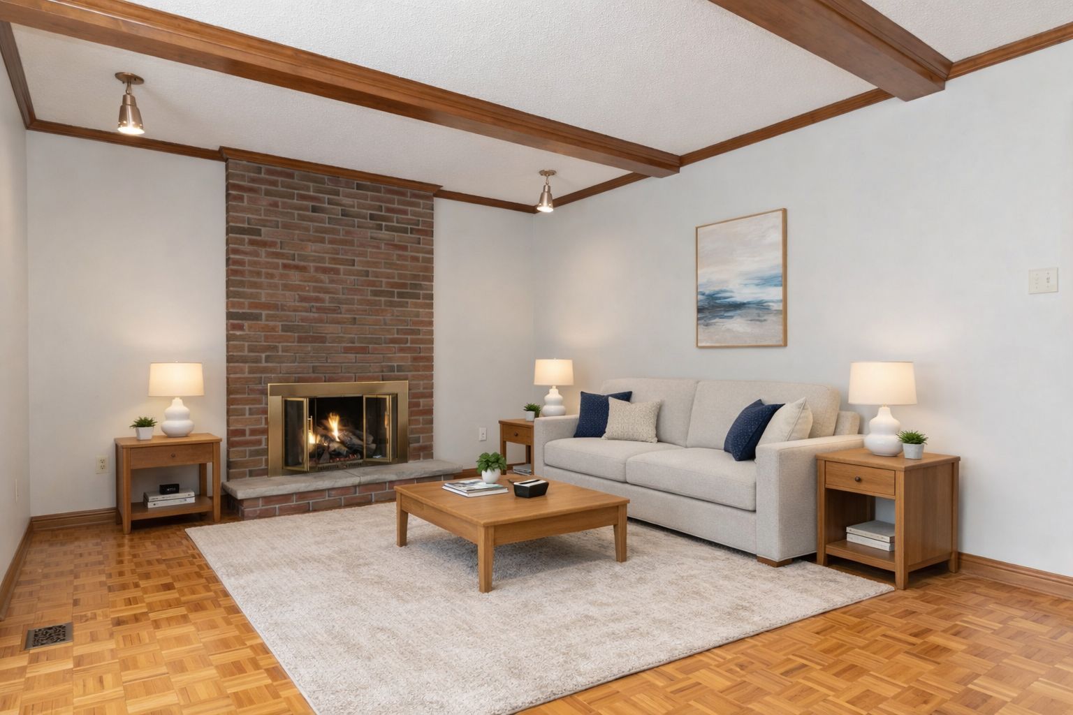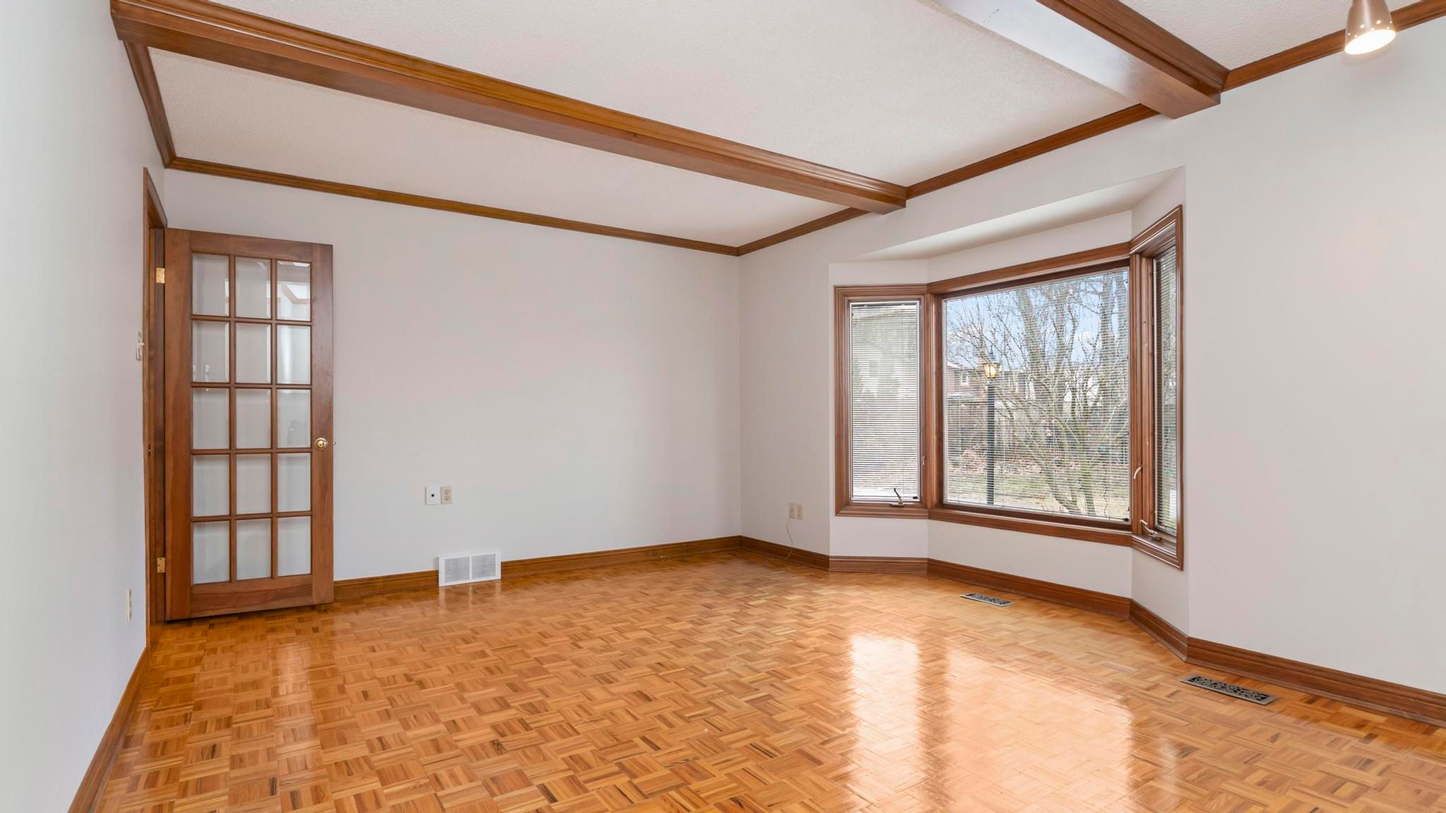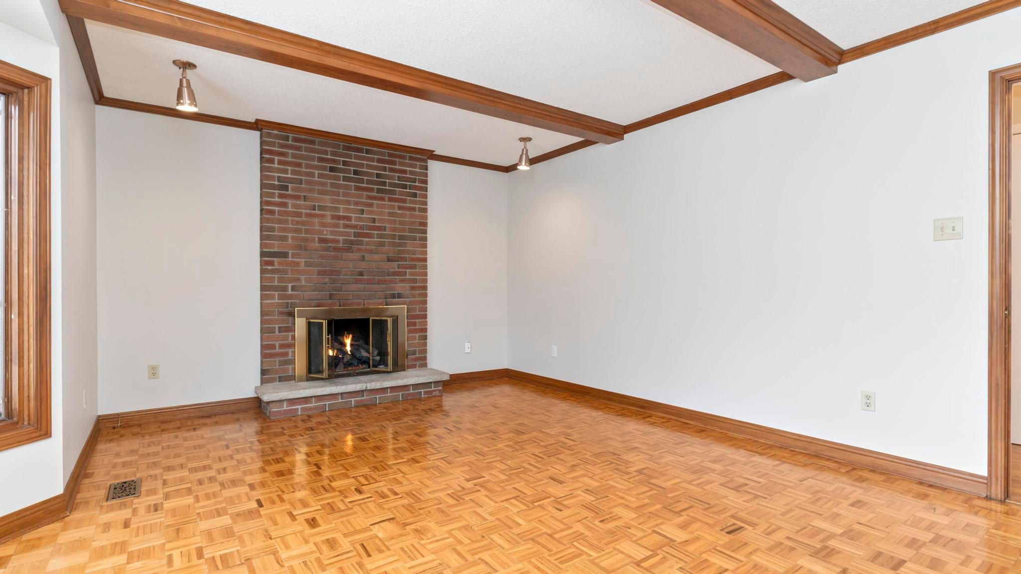 • Cozy family room with gas fireplace and bay window views.