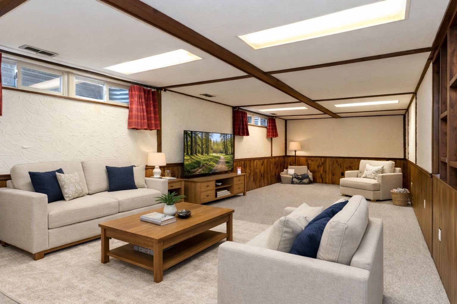 • Two-tiered deck overlooking the woods for outdoor relaxation.