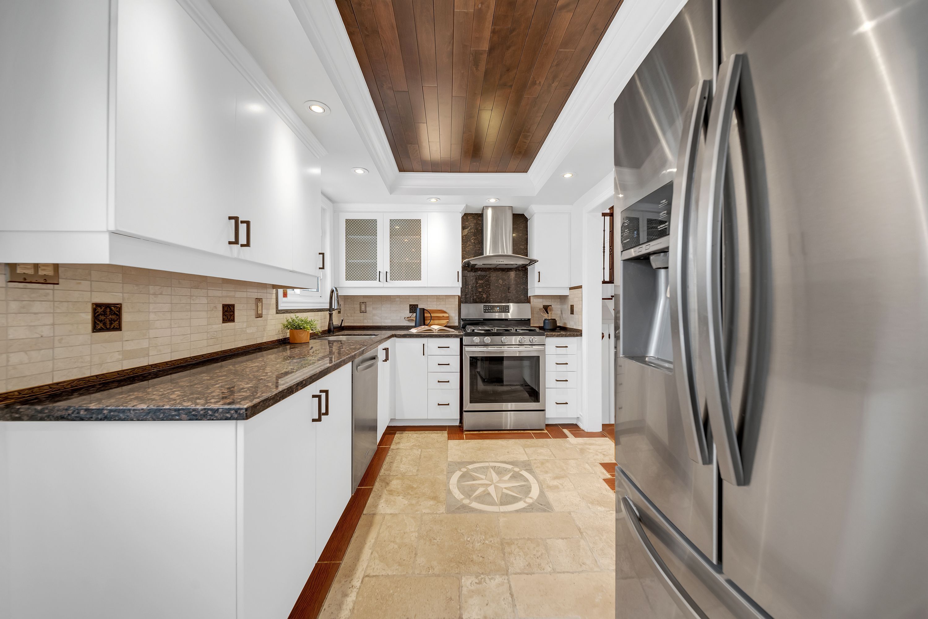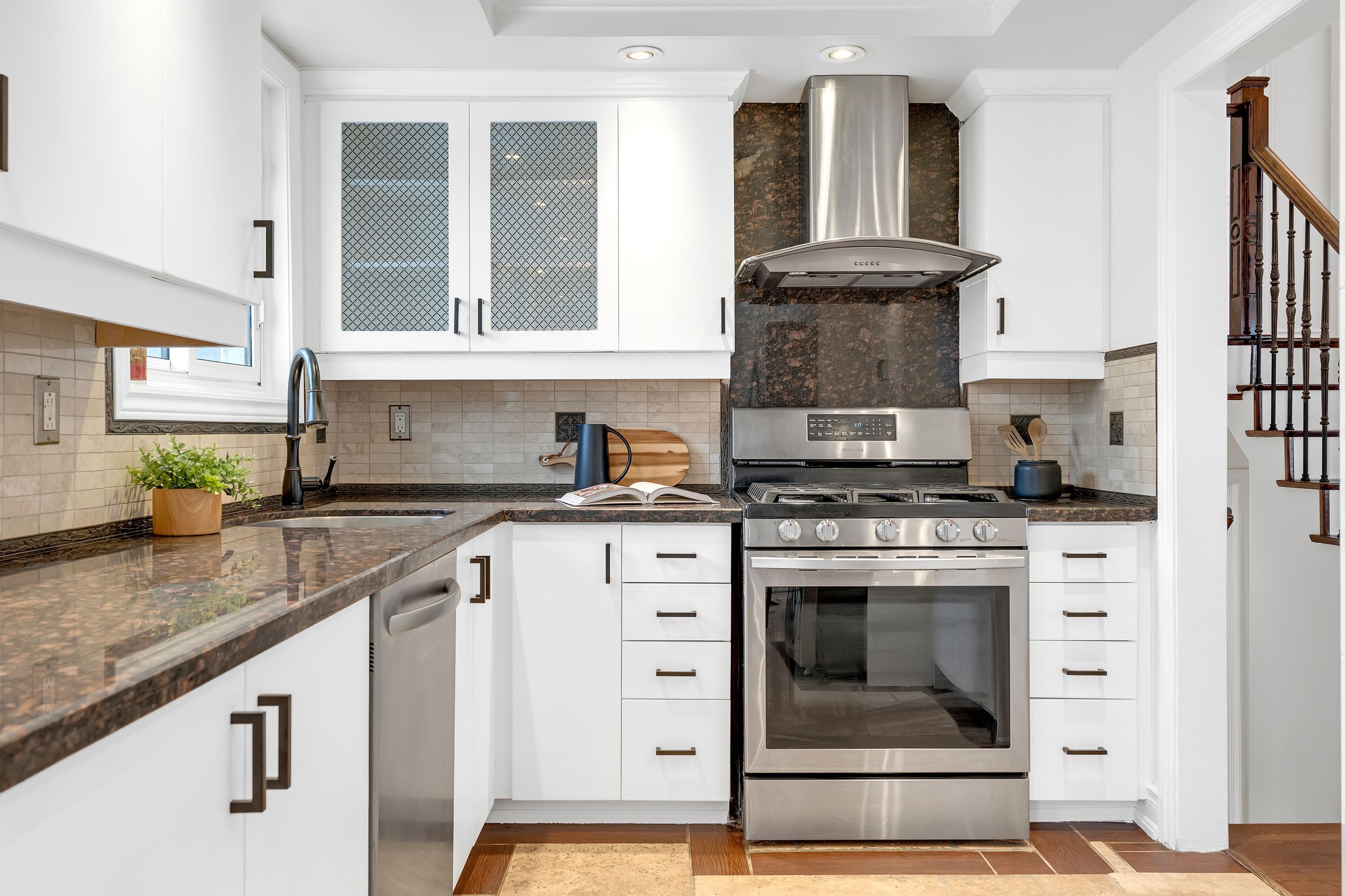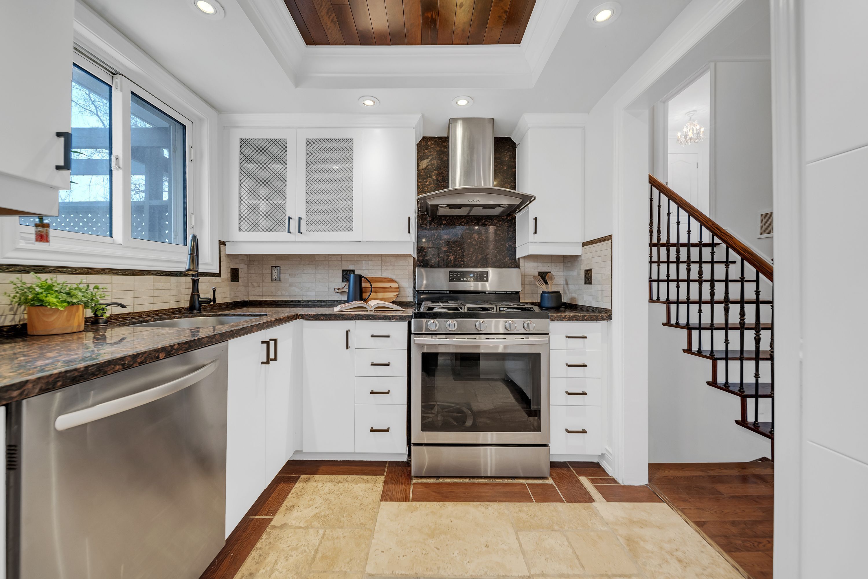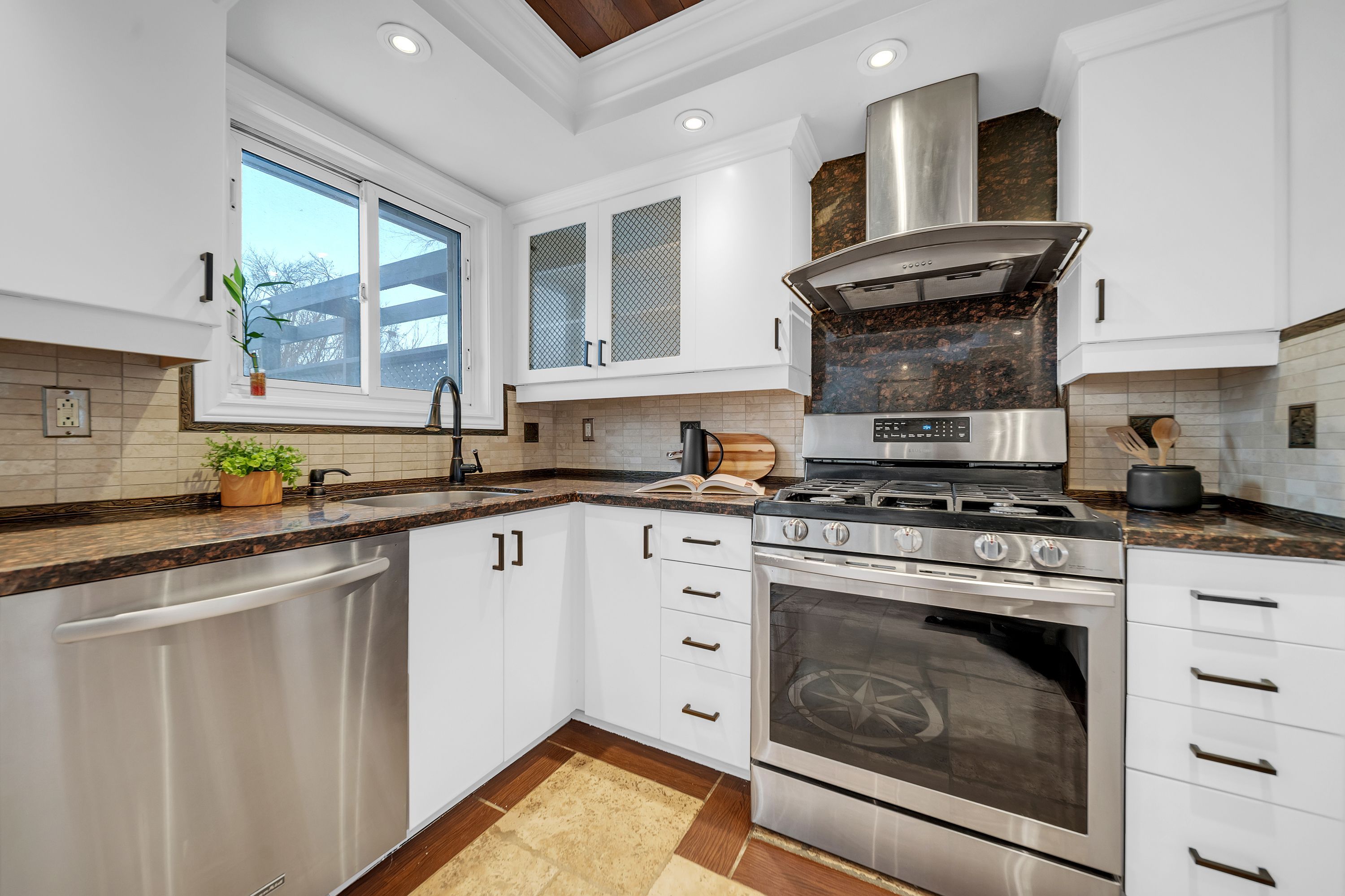 • Modern kitchen with granite countertops and stainless steel appliances.