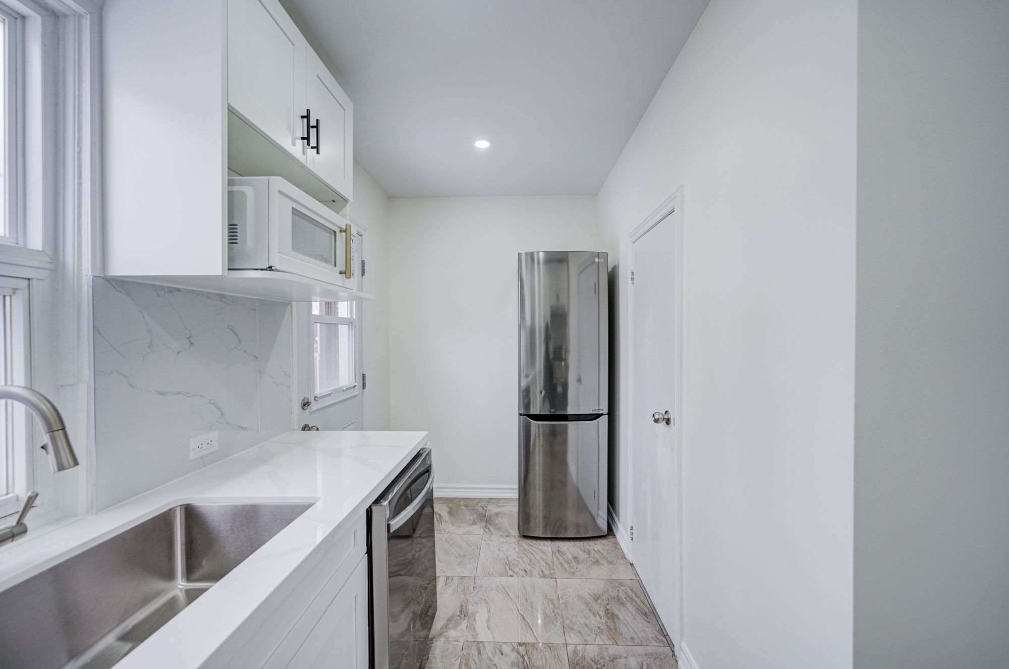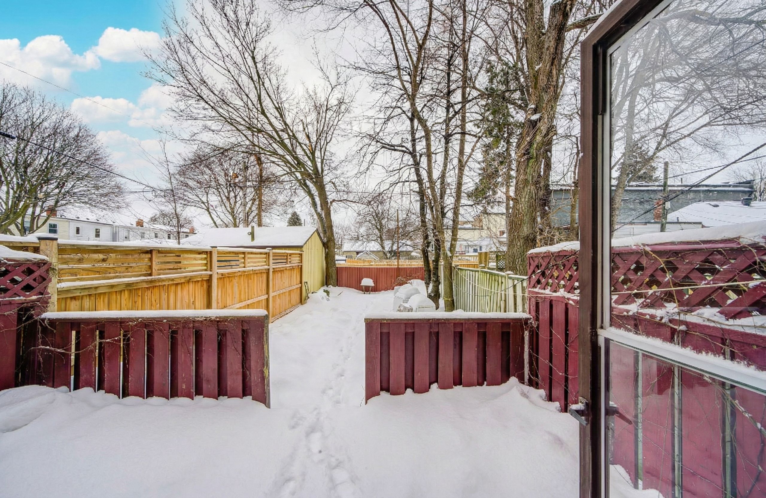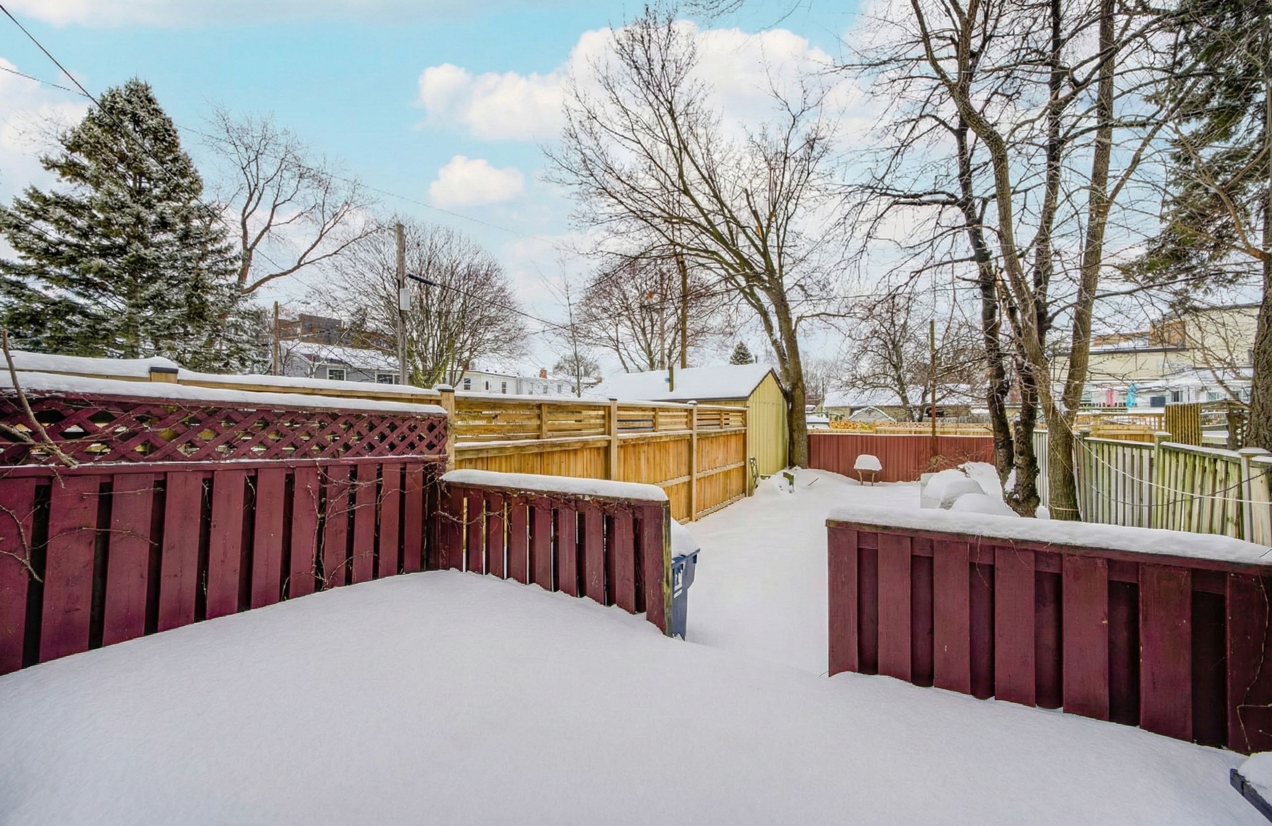 • Updated eat-in kitchen leads to a private sundeck and fenced backyard.