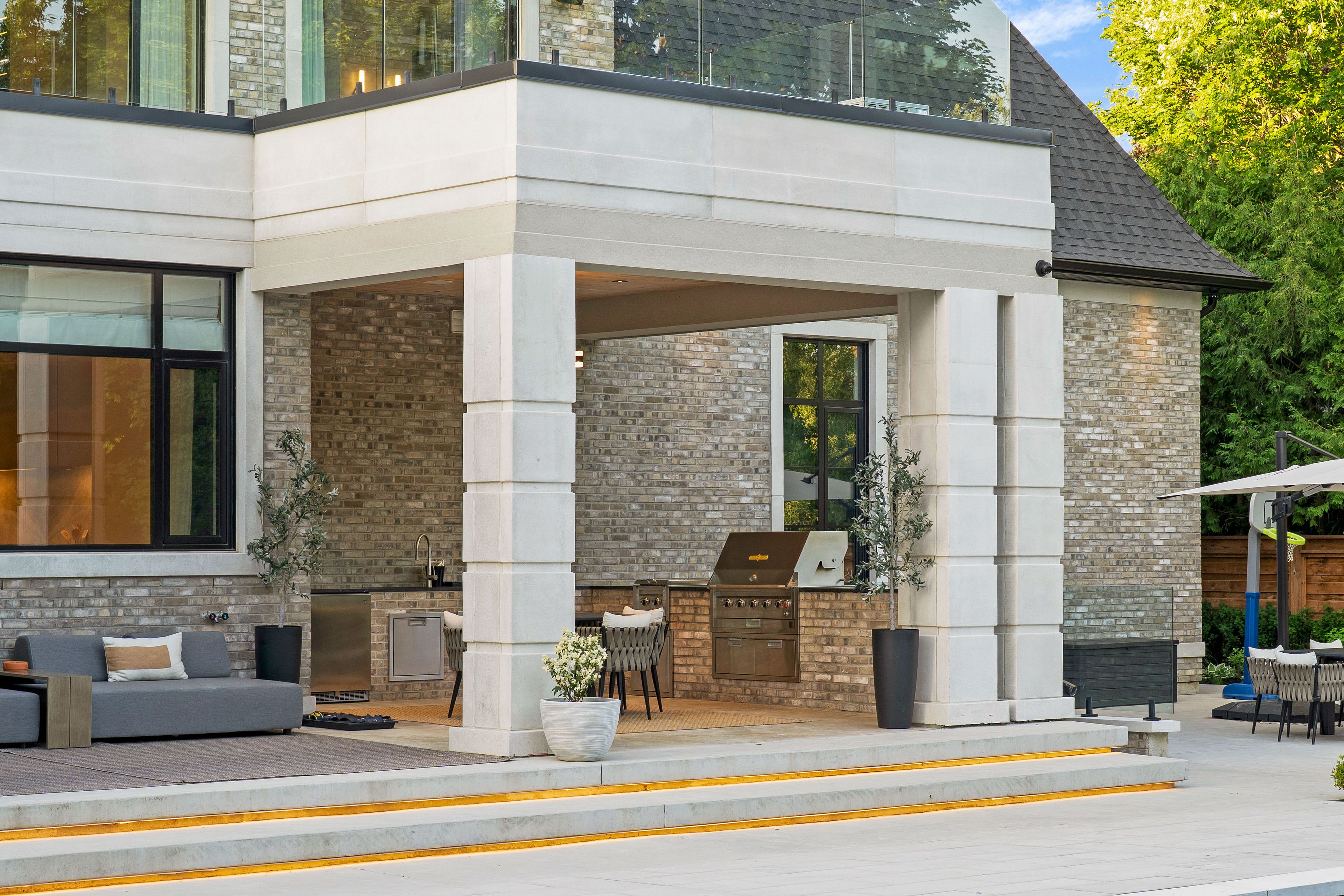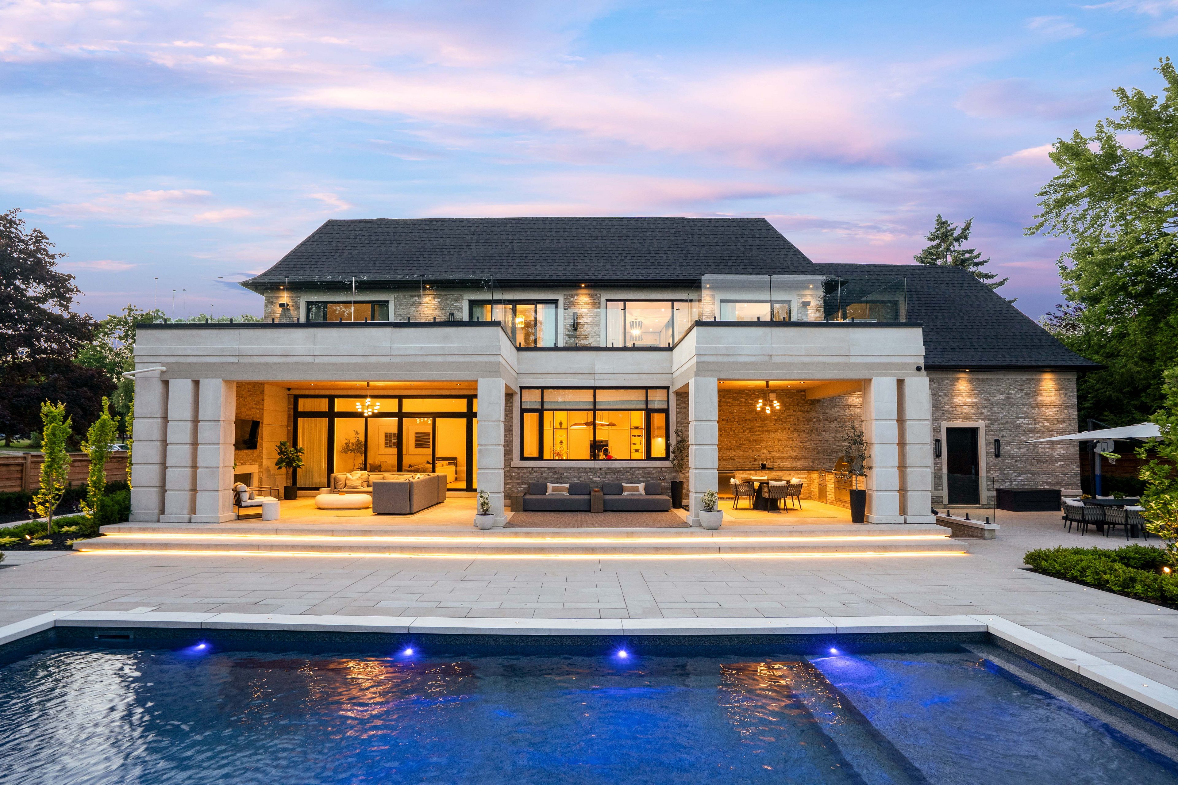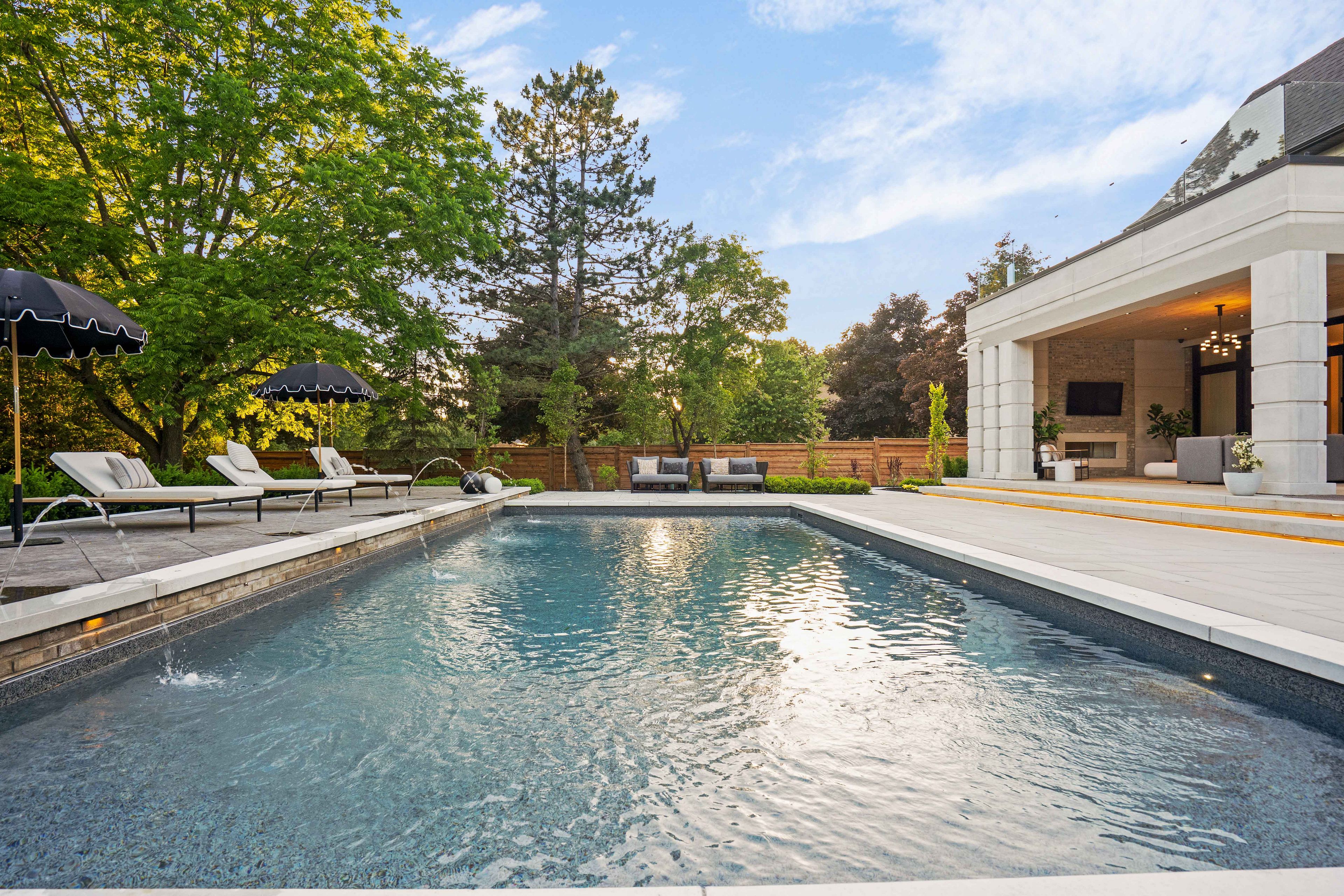 • Outdoor space with saltwater pool, kitchen, and loggias for entertaining.