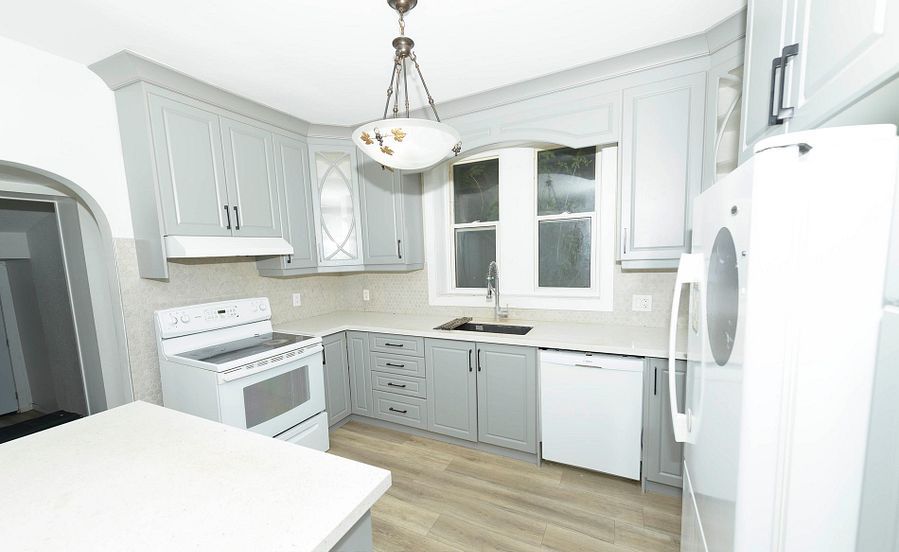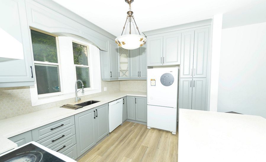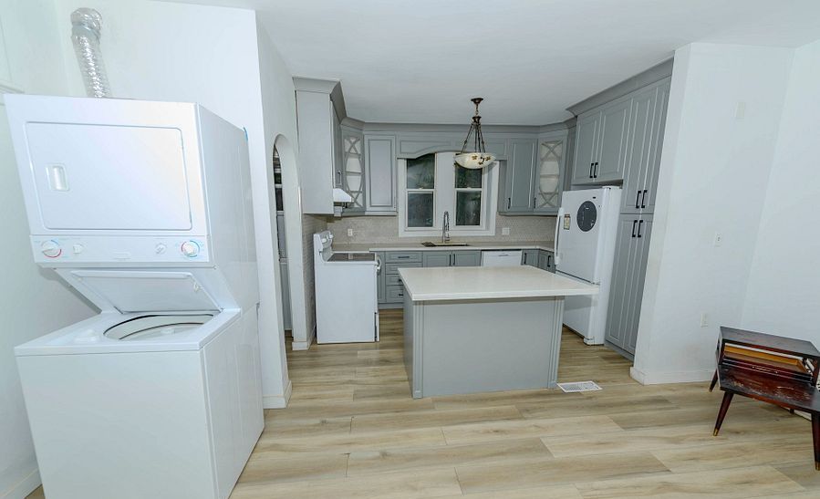 • Newly renovated kitchen includes a large island and ample cupboard space.