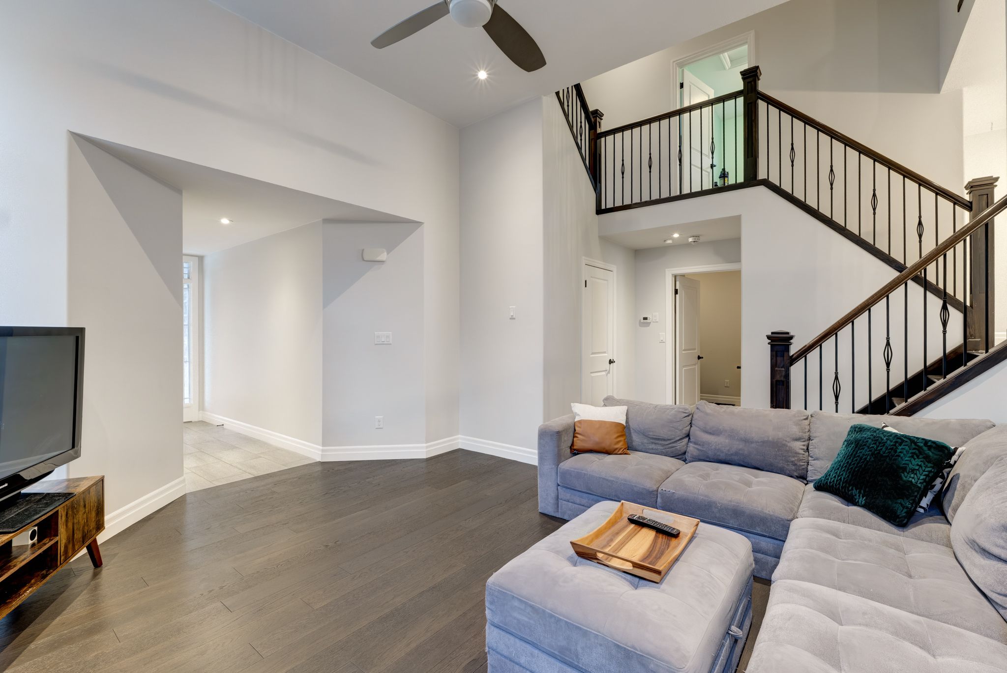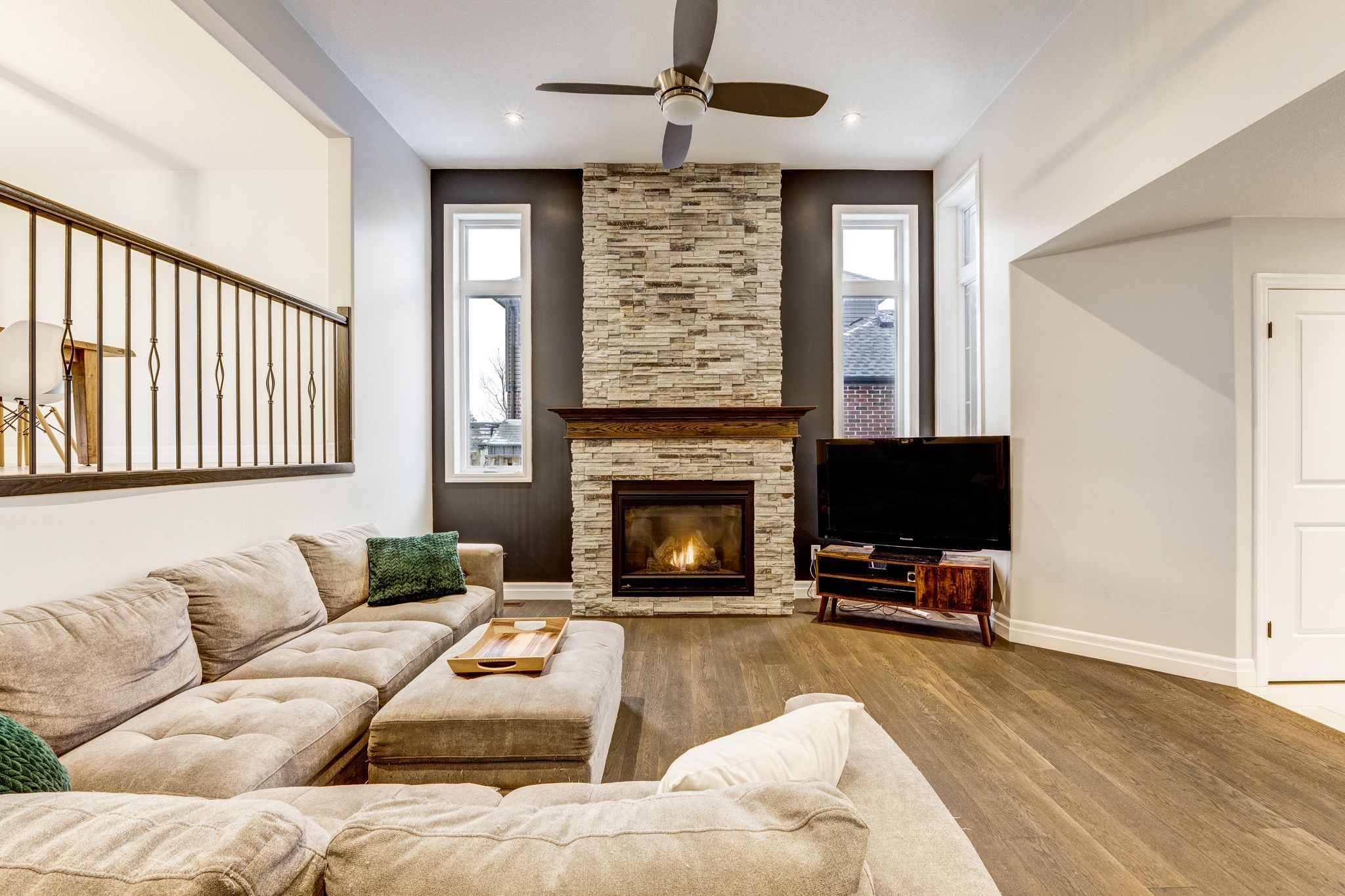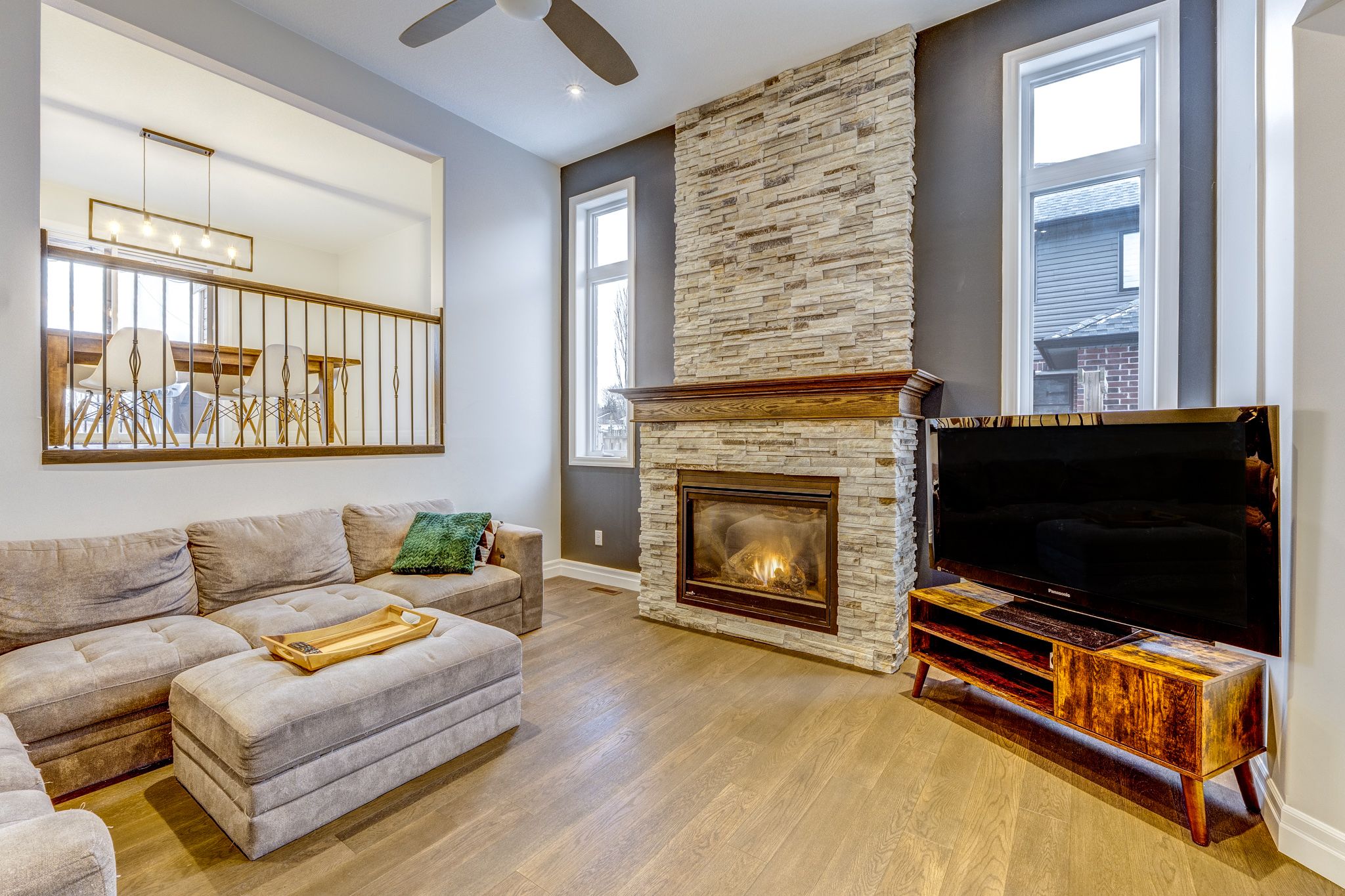 • Spacious living room with a striking stone gas fireplace.