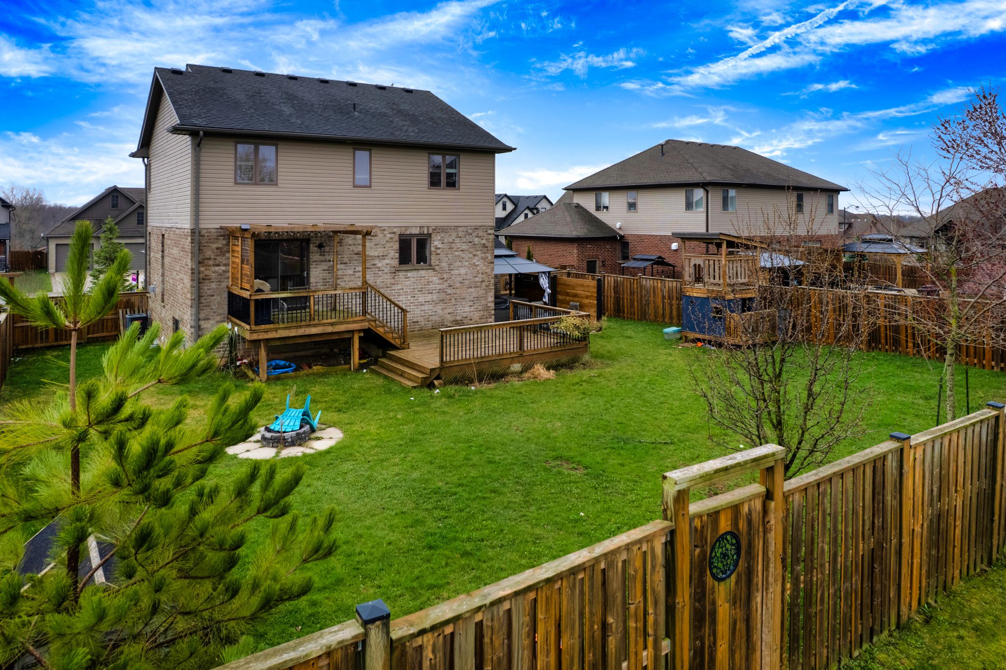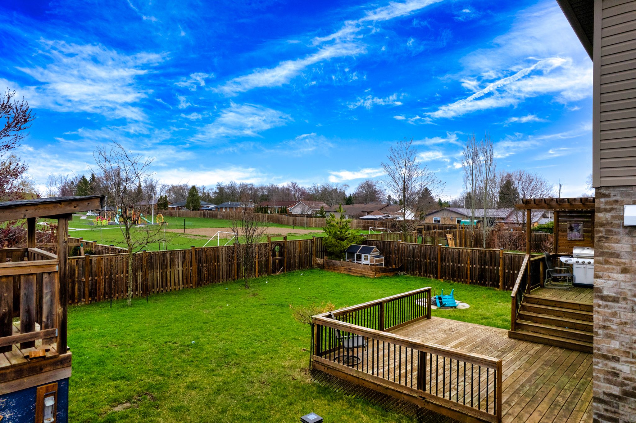 • Large fenced backyard with two-tier deck for outdoor fun.